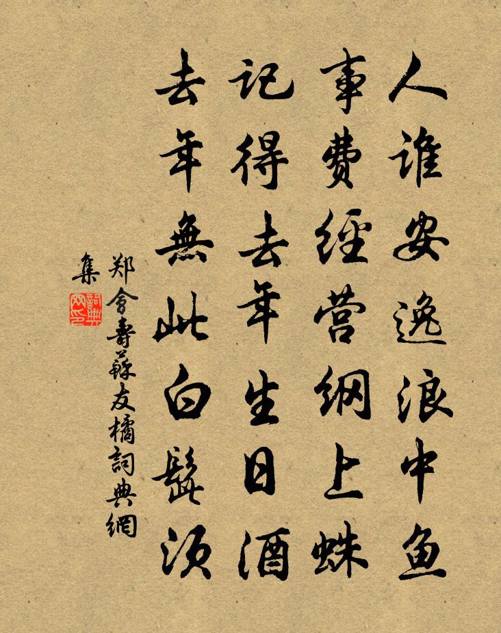詩詞名句歷史字典書法欣賞書法字典國語詞典說文解字康熙字典古漢語字典標 題 作 者 詩 句 壽蘇友橘作者:鄭會 朝代:宋代壽蘇友橘原文人誰安逸浪中魚,事費經營綱上蛛。記得去年生日酒,去年無此白髭鬚。詩詞問答問:壽蘇友橘的作者是誰?答:鄭會問:壽蘇友橘寫於哪個朝代?答:宋代鄭會壽蘇友橘書法欣賞壽蘇友橘書法作品詩詞推薦春首陳叔達〔唐代〕雪花聯玉樹,冰彩散瑤池。翔禽遙出沒,積翠遠參差。虞美人(族兄無言召)劉一止〔宋代〕浪花雲葉交加舞。身近青冥路。天知此客解騎鯨。今夜一江明月、送行行。從今直上鰲峰去。應記經行處。莫將險雞鳴曲陳陶〔唐代〕雞聲春曉上林中,一聲驚落蝦蟆宮。二聲喚破枕邊夢,三聲行人煙海紅。平旦慵將百雛語,蓬鬆錦繡當陽處。愧君清平樂 九月回至隆興 隆興廳事壁間作六鶴圖劉敏中〔元代〕雲峰咫尺。竹靜芭蕉靜。鶴繞蒼苔行又立。不見高堂素壁。簿書*騎匆匆。暫時留住衰翁。一片歸心難畫,野亭繡宿晦上人房魏野〔宋代〕野客訪琴僧。夜午月又午。為我彈薰風,似聽重華語。次漢英教授示和尹少稷韻四首汪應辰〔宋代〕五車拄腹成何事,空受才名二十年。一壑生涯長齟齬,邇來行李已三遷。和陶擬古九首蘇軾〔宋代〕少年好遠遊,盪志隘八荒。九夷為藩籬,四海環我堂。盧生與若士,何足期渺茫。稍喜海南州,自古無戰場。奇峰下水船黃庭堅〔宋代〕總領神仙侶。齊到青雲歧路。丹禁風微,咫尺諦聞天語。盡榮遇。看即如龍變化,一擲靈梭風雨。真游處。上苑尋偈十二首釋文準〔宋代〕八月中秋天涼,芙蓉花發映禪房。老胡大道分明在,不必諸方問短長。短不是短,長不是長。短長不是處,是道非長平箭頭歌李賀〔唐代〕漆灰骨末丹水沙,淒淒古血生銅花。白翎金竿雨中盡,直餘三脊殘狼牙。我尋平原乘兩馬,驛東石田蒿塢下。風長三吊吟四首方回〔宋代〕湍溪漲梅潦,一夕十丈強。愚哉浴馬僮,視之如尋常。高岸一失足,馬尚能騰驤。僮屍不可得,漂流落何鄉。握轡和閩人龔玉峰韻何夢桂〔宋代〕猛拍闌乾賦感傷,十年往事幾迴腸。寧能璧與頭俱碎,安得車將臂怒當。太傅長沙悲鵬鳥,中郎北海牧羝羊。天荒蘇台曲楊維楨〔元代〕吳王張高宴,台下閱犀兵。高台三百里,不見越王城。玉樓春(王守生日)謝逸〔宋代〕橫塘暈淺琉璃瑩。綠葉陰濃庭院靜。櫻桃熟後麥秋涼,芍藥開時槐夏永。蓬萊閣下紅塵境。青羽扇低搖鳳影。庭前梅花林逋〔宋代〕吟懷長恨負芳時,為見梅花輒入詩。雪後園林才半樹,水邊籬落忽橫枝。人憐紅艷多應俗,天與清香似有私。堪笑送路守郭印〔宋代〕道衰世彌隘,俗薄人易驕。一為居所移,盛氣乾雲霄。官曹出已下,俯視如僬僥。崇卑兩懸絕,相望天壤遼。猗歟旅中遣懷於石〔宋代〕片雲相望浙東西,回首家山路欲迷。昨夜桐江江上夢,倒隨流水上雙溪。禪人寫師真請贊釋慧遠〔宋代〕斷滅佛種,破除家計。不是別人,楊岐五世。禪道耳邊風,佛法眼中翳。問渠將底為人,尚有隨身赤契。送薛二十三郎中赴婺州姚合〔唐代〕我住浙江西,君去浙江東。日日心來往,不畏浙江風。觀除目二首曾豐〔宋代〕四正宮中坐五窮,若於群在不吾攻。畏途過後猶寒膽,除目陳前不熱中。名句推薦秋菊有佳色,裛露掇其英。陶淵明《飲酒·其四》 遠岫出山催薄暮,細風吹雨弄輕陰。梨花欲謝恐難禁。李清照《浣溪沙·小院閒窗春色深》 教小兒宜嚴,嚴氣足以平躁氣王永彬《圍爐夜話·第八則》 文之英蕤,有秀有隱。隱也者,文外之重旨者也;秀也者,篇中之獨拔者也。劉勰《文心雕龍·隱秀》 雨晴煙晚。綠水新池滿。馮延巳《清平樂·雨晴煙晚》 刻薄不賺錢,忠厚不折本。馮夢龍《醒世恆言·卷三》 迢迢牽牛星,皎皎河漢女。佚名《迢迢牽牛星》 鳥向檐上飛,雲從窗里出。吳均《山中雜詩》 旅館寒燈獨不眠,客心何事轉悽然。高適《除夜作》 卜以決疑,不疑何卜。李汝珍《鏡花緣·第十二回》