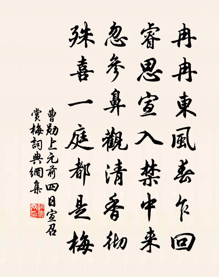 詩詞名句歷史字典書法欣賞書法字典國語詞典說文解字康熙字典古漢語字典標 題 作 者 詩 句 上元前四日宣召賞梅作者:曹勛 朝代:宋代上元前四日宣召賞梅原文冉冉東風春乍回,睿思宣入禁中來。忽參鼻觀清香徹,殊喜一庭都是梅。詩詞問答問:上元前四日宣召賞梅的作者是誰?答:曹勛問:上元前四日宣召賞梅寫於哪個朝代?答:宋代曹勛上元前四日宣召賞梅書法欣賞上元前四日宣召賞梅書法作品詩詞推薦籌邊堂梁介〔宋代〕籌邊無它長,幸此歲有秋。吏無打門宣,民無失業憂。史君來此邦,不但肉食謀。有言天命之,為汝消窮愁。夷蜑句俞君錫〔宋代〕洗瓢魚隱石,掃葉蟻移家。登泰山簡周行祖無擇〔宋代〕日日塵中眼不開,暫登蒼翠喜游陪。莫辭辛苦經難險,大有人生不到來。待眾官致語口號陳造〔宋代〕公堂錦繡映簪紳,不著人間一點塵。地窄尚堪紅袖舉,情孚那復白頭新。蔗漿玉醴壺天晚,翠蓋紅貼暑月春。況是和林和靖先生梅韻胡銓〔宋代〕一年佳處早梅時,鉤引清風巧釣詩。未分霜冷禁瘦朵,漸看春入奈愁枝。晚尤奇特憐無伴,夜更分明不可私。冷落無心居士劉君輓詞周必大〔宋代〕應物無心善自寬,臨財有義肯儒酸。竹林逸老多餘慶,鴻苑奇書獨飽觀。名父平生淹簿領,佳兒他日紹衣冠。追思太平宴陳昌時〔宋代〕朝陽鳴鳳馬圖河,雷動官僚宴泰和。萬國春風酣組綬,九天明月照笙歌。紅雲瑞擁山呼壽,滄海恩深酒作波。元朔送邢孟貞還石臼顧夢遊〔清代〕月當分手夜,分外冷高秋。蟲響坐來歇,林風相與幽。到家收晚稻,攜子上湖舟。莫戀衡門好,遲君上酒樓。為月上人頌秋潭釋紹曇〔宋代〕白蘋香細桂華清,徹底無痕漾水晶。剛被寒山心點污,至今照影欠分明。浣溪沙高觀國〔宋代〕遮坐銀屏度水沈。障風羅幕皺泥金。日遲宮院靜愔愔。繁杏半窺紅日薄,小憐低唱綠窗深。試拈犀管寫春心。聽范玄長吟施肩吾〔唐代〕聲聲扣出碧琅玕,能使秋猿欲叫難。詩興未窮心更遠,手垂青拂向雲看。水仙王廟辭袁韶〔宋代〕桂水闊兮仙宮,今何為兮山之中。羌時俗兮改錯,寄嘉名兮土龍。卜中洲兮芷閭,仙歸兮故居。旂夫容兮蘭枻,詔與宋景文公唱酬牡丹詩朱公綽〔宋代〕仁帥安全蜀,祥葩育至和。地寒開既晚,春曙力終多。翠幕遮蜂蝶,朱闌隔綺羅。殷勤憑驛使,光景易蹉跎。寄闕下諸父兄兼示平甫兄弟王安石〔宋代〕父兄為學眾人知,小弟文章亦自奇,家勢到今宜有後,士才如此豈無時。久聞陽羨溪山好,頗與淵明性分宜。但願文宗嗜蛤蜊圖贊釋心月〔宋代〕一點悲心擘不開,鑊湯袞處笑盈腮。希奇之事朕深信,是與君王說不地來。夢歌先秦無名〔先秦〕濟洹之水。贈我以瓊瑰。歸乎歸乎。瓊瑰盈吾懷乎。減字木蘭花(呈鑒義王介甫)張繼先〔宋代〕嚴寒冬月。前日陽生幾降雪。松柏凌霄。森聳庭中嘆後凋。昔人猶豫。身入山林深靜處。今古同符。好趁笙歌且自次韻陽孝本游翟家灣書院二首又一絕蘇頌〔宋代〕謾夸三島冠靈鰲,咫尺在岡去靡勞。若使南陽人獨臥,風雲寧隔海山高。好事近(雪中攜酒過元長)趙鼎〔宋代〕春色遍天涯,寒谷未知訊息。且共一尊芳酒,看東風飛雪。太平遺老洞霄翁,相對兩華發。一任醉魂飛去,訪瓊瑤舟中醉題陸游〔宋代〕風吹蘆荻聲颼颼,晚潮入港浮孤舟。老民已掃市朝跡,造物全付江湖秋。項里廟前是魚市,禹會橋邊多酒樓。醉來名句推薦酒未開樽句未裁,尋春問臘到蓬萊。曹雪芹《訪妙玉乞紅梅》 君仁莫不仁,君義莫不義,君正莫不正。孟子《孟子·離婁章句上·第二十節》 江流石不轉,遺恨失吞吳。杜甫《八陣圖》 蓮香隔浦渡,荷葉滿江鮮。劉孝威《採蓮曲·金槳木蘭船》 萬條千縷綠相迎。舞煙眠雨過清明。晏幾道《浣溪沙·二月和風到碧城》 漢家天馬出蒲梢,苜蓿榴花遍近郊。李商隱《茂陵》 救人須救急,施人須當厄。馮夢龍《醒世恆言·卷十》 秋風吹地百草乾,華容碧影生晚寒。李賀《開愁歌》 今日江頭兩三樹,可憐和葉度殘春。元稹《離思五首》 待到秋來九月八,我花開後百花殺。黃巢《不第後賦菊》