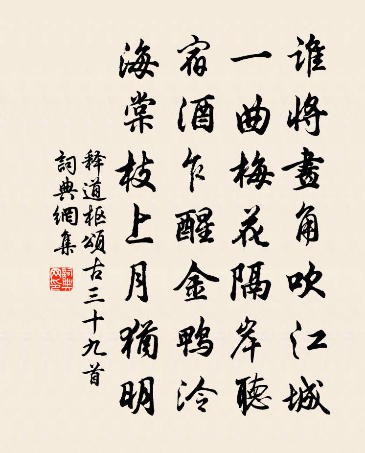 詩詞名句歷史字典書法欣賞書法字典國語詞典說文解字康熙字典古漢語字典標 題 作 者 詩 句 頌古三十九首作者:釋道樞 朝代:宋代頌古三十九首原文誰將畫角吹江城,一曲梅花隔岸聽。宿酒乍醒金鴨泠,海棠枝上月猶明。詩詞問答問:頌古三十九首的作者是誰?答:釋道樞問:頌古三十九首寫於哪個朝代?答:宋代釋道樞頌古三十九首書法欣賞頌古三十九首書法作品詩詞推薦偈六首釋法智〔宋代〕動時常寂寂,靜處活鱍鱍。動靜兩俱忘,佛祖何處著。驀地夢回頭,長天飛一鶚。春風有時好,春風有時惡。不得朗上人院晨坐許渾〔唐代〕簟涼襟袖清,月沒尚殘星。山果落秋院,水花開曉庭。疏藤風裊裊,圓桂露冥冥。正憶江南寺,岩齋聞誦經。頌十玄談演教釋印肅〔宋代〕三世如來共所宣,至今不斷少人傳。塞鴻非是人驚起,風擊蘆鳴寫碧天。蚊虞儔〔宋代〕床前蠟紙一燈明,殷殷聞雷數震驚。忽去青天無鳥跡,驟來紅樹有鶯聲。噆膚噬血寧甘死,投隙穿帷太巧生。為爾送胡季昭謫象州次王盧溪送澹庵眨新州韻李元實〔宋代〕知公不怕鬼門關,直氣橫乾清禁閒。雕嘴明知林甫毒,鯁言要與澹班。一身渠任黃茆里,千古名標青史間。非晚清次子泉韻葛起耕〔宋代〕一聲鶗鴃又春休,風簸榆錢滿地流。燕子不積壓花落盡,等閒飛過柳連樓。過含山郵亭和子厚弟壁間韻三首王之道〔宋代〕透雲斜日影朦朧,樹杪依微少女風。景物重來正無恙,為君收拾向詩中。頌一百則釋重顯〔宋代〕虎頭虎尾一時收,凜凜威風四百州。卻問不知何太險。南鄉子晏幾道〔宋代〕花落未須悲,紅蕊明年又滿枝。惟有花間人別後,無期。水闊山長雁字遲。今日最相思,記得攀條話別離。共說春送升道靖恭相公分司林寬〔唐代〕東風時不遇,果見致君難。海岳影猶動,鵾鵬勢未安。星沉關鎖冷,雞唱驛燈殘。誰似二賓客,門閒嵩洛寒。自鄆鄉北歸司空圖〔唐代〕巴煙冪冪久縈恨,楚柳綿綿今送歸。迴避江邊同去雁,莫教驚起錯南飛。層樓晚眺薩都剌〔元代〕廣寒世界夜迢迢,醉拍闌乾酒易消。河漢入樓天不夜,江風吹月海初潮。光搖翠幕金蓮炬,夢斷涼雲碧玉簫。休唱大觀三年釋奠六首佚名〔宋代〕仰之彌高,鑽之彌堅。於昭斯於,被於萬年。峨峨膠庠,神其來止。思款無窮,敢忘於始。賀岷州守種誼破鬼章二首游師雄〔宋代〕王師一舉疾於雷,頃刻俄聞破敵回。且喜將門還出將,檻車生致鬼章來。寄齊州曾子固學士強至〔宋代〕歷山名重舜耕餘,太守文章世罕如。但見清風變齊魯,未聞紫詔起嚴徐。最宜視草歸時訓,可惜揮毫落簿書。千騎送黃權守歸八桂三首胡寅〔宋代〕樂物覉棲伴,筋骸放逐余。自甘門有雀,寧嘆食無魚。傾蓋情文腆,投醪笑語舒。晚途多感慨,賴此得時祛。芰荷香仲並〔宋代〕醉凝眸。正行雲遮斷,澄練江頭。皓月今宵何處,不管中秋。朱闌倚遍,又微雨、催下危樓。秋風空響更籌。不將潯陽與孫郎中宴回周賀〔唐代〕別酒已酣春漏前,他人扶上北歸船。潯陽渡口月未上,漁火照江仍獨眠。盧侍御小妓乞詩,座上留贈白居易〔唐代〕鬱金香汗裛歌巾,山石榴花染舞裙。好似文君還對酒,勝於神女不歸雲。夢中那及覺時見,宋玉荊王應羨君。九日登高台寺沈輅〔清代〕萬里秋光客興賒,同人九日惜年華。台高不盡看楓葉,院淨何須坐菊花。對酒披襟形獨放,憑風落帽笑誰加。詩成名句推薦長江巨浪征人淚,一夜西風共白頭。宋琬《江上阻風》 君不肖,則國危而民亂,君賢聖則國安而民治,禍福在君不在天時。姜子牙《六韜·文韜·盈虛》 我軍青坂在東門,天寒飲馬太白窟。杜甫《悲青坂》 三五明月滿,四五蟾兔缺。佚名《孟冬寒氣至》 來日綺窗前,寒梅著花未。王維《雜詩三首 / 雜詠三首》 主貴多變,國貴少變。國多物,削;主少物,強。商鞅《商君書·去強》 長風蕭蕭渡水來,歸雁連連映天沒。盧思道《從軍行》 唱罷秋墳愁未歇,春叢認取雙棲蝶。納蘭性德《蝶戀花·辛苦最憐天上月》 危橋屬幽徑,繚繞穿疏林。柳宗元《巽公院五詠·苦竹橋》 坑灰未冷山東亂,劉項原來不讀書。章碣《焚書坑》
