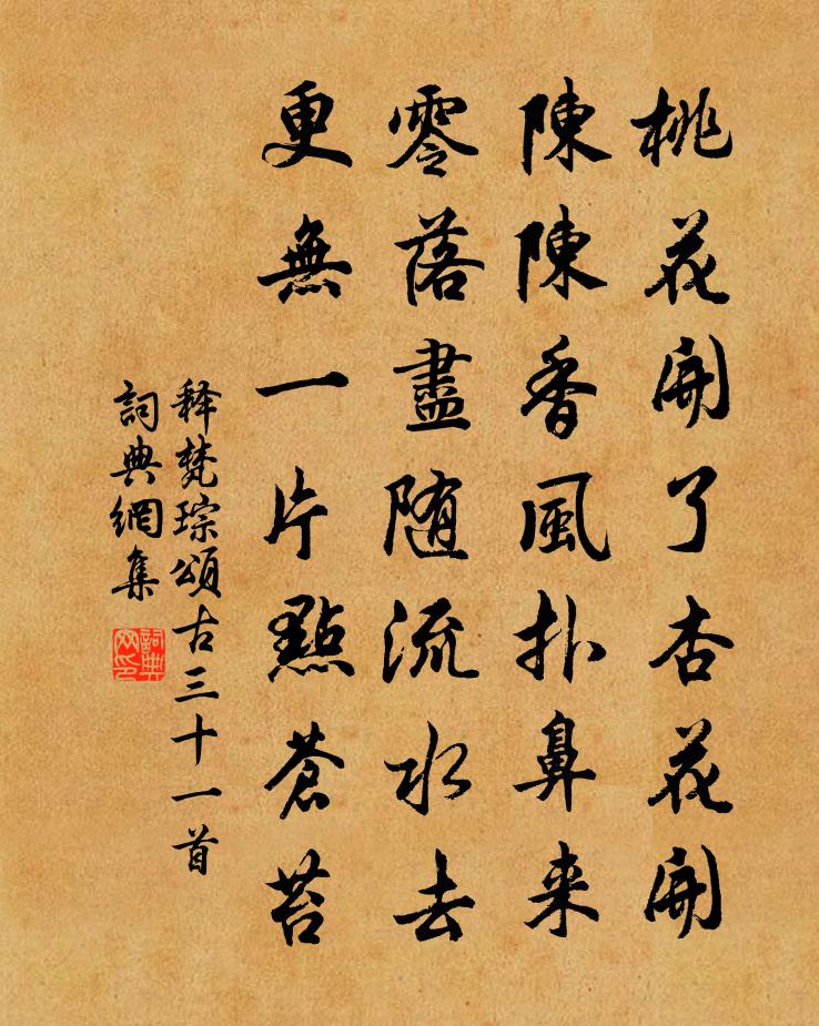 詩詞名句歷史字典書法欣賞書法字典國語詞典說文解字康熙字典古漢語字典標 題 作 者 詩 句 頌古三十一首作者:釋梵琮 朝代:宋代頌古三十一首原文桃花開了杏花開,陳陳香風撲鼻來。零落盡隨流水去,更無一片點蒼苔。詩詞問答問:頌古三十一首的作者是誰?答:釋梵琮問:頌古三十一首寫於哪個朝代?答:宋代釋梵琮頌古三十一首書法欣賞頌古三十一首書法作品詩詞推薦蝶戀花(和費五九丈□□見惠生日韻)魏了翁〔宋代〕早歲騰身阝齊輦路。秋月春風,只作渾閒度。手挾雷公驅電母。袖中雙劍蛟龍舞。如此壯心空浪許。四十明朝,忍句鄭文寶〔宋代〕久欠游山債。楊柳枝詞九首·其四劉禹錫〔唐代〕金谷園中鶯亂飛,銅駝陌上好風吹。城東桃李須臾盡,爭似垂楊無限時。宋初祀神州地祗三首佚名〔宋代〕朊朊郊原,茫茫字縣。書野分疆,禹功疏奠。靈祗是致,豆籩祗牙。幽贊皇圃,視之不見。龍隱岩李師中〔宋代〕春波飽微綠,斗柄涵虛明。方舟貫岩腹,鵝鸛相酬鳴。仰窺穹窿頂,宛轉百怪呈。僅餘鱗甲碎,不見頭角獰。下闖九月二十日微雪懷子由弟二首蘇軾〔宋代〕岐陽九月天微雪,已作蕭條歲暮心。短日送寒砧杵急,冷官無事屋廬深。愁腸別後能消酒,白髮秋來已上簪。近買省中沈文通廳事王安石〔宋代〕竹上秋風吹網絲,角門常閉吏人稀。蕭蕭一榻卷書坐,直到日斜騎馬歸。七夕溫庭筠〔唐代〕鵲歸燕去兩悠悠,青瑣西南月似鉤。天上歲時星右轉,世間離別水東流。金風入樹千門夜,銀漢橫空萬象秋。蘇小桂殿秋佚名〔宋代〕漓獸石,錯虬松。黛嵐終日下天風。杖藜攜我恣遙望,縹緲霓裳飛碧空。句錢惟演〔宋代〕離人南浦多春草,越鳥栖枝有早梅。學圃黎廷瑞〔宋代〕西園藝我麻,南園樹我桑。東風吹時雨,青青久成行。春服朝猶賒,大布冬可裳。十年湖海役,塵暗貂裘黃。曾無雜曲歌辭。悲哉行鮑溶〔唐代〕促促晨復昏,死生同一源。貴年不懼老,賤老傷久存。朗朗哭前歌,絳旌引幽魂。來為千金子,去臥百草根。黃土憶瑤姬曹組〔宋代〕雨細雲輕,花嬌玉軟,於中好個情性。爭奈無緣相見,有分孤零。香箋細寫頻相問。我一句句兒都聽。到如今,不碧泉興作即事有感因續魏武之詩胡宏〔宋代〕對酒當歌,人生幾何。往者如江,來者如何。往來無盡,弗移弗那。奉身理物,何少何多。天長地久,我生靡它。明覺寺折梅王銍〔宋代〕遙山天際斂眉峰,清淺溪邊淡粉容。薄暮寺橋人獨立,一燈明滅數聲鍾。秋曉寓目祖無擇〔宋代〕梧桐冷墜秦宮井,沆瀣光浮漢苑槃。倚杵遠天垂六幕,照梁初日上三竿。寄翁靈舒徐照〔宋代〕游遠令人瘦,思君甚渴飢。恨無如意事,懶乞送行詩。帝陌喧車馬,王門守鹿貔。何時借僧榻,切勿負幽期。歲盡苦寒陸游〔宋代〕曉寒無賴透重裘,三日江雲暝不收。歲月推移吾輩老,交朋零落此生浮。東皋苦潦猶中熟,舊疾雖存亦小瘳。禹廟解佩令王哲〔元代〕金郎察察。玉娘揠揠。堪同壽、方年二八。住在何方,一居水,一居山北。入離門、坎戶皆*。時時相拉。頻頻搜送邑簿阮杏山解任陳著〔宋代〕杏山高高壓群山,山靈發秀生鳳鸞。便應騫騰梧桐表,胡為迴翔枳棘閒。誰知異物非凡翼,志在遠大須培植。固非名句推薦記得別伊時,桃花柳萬絲。納蘭性德《菩薩蠻·新寒中酒敲窗雨》 佳節清明桃李笑,野田荒冢只生愁。黃庭堅《清明》 入苑白泱泱,宮人正靨黃。李賀《同沈駙馬賦得御溝水》 小男供餌婦搓絲,溢榼香醪倒接罹。李郢《南池》 日落謝家池館,柳絲金縷斷。韋莊《歸國遙·春欲晚》 去年寄書報陽台,今年寄書重相催。李白《久別離》 今古河山無定據。納蘭性德《蝶戀花·出塞》 烹羊宰牛且為樂,會須一飲三百杯。李白《將進酒》 三人行,必有我師焉。擇其善者而從之,其不善者而改之。孔子弟子《論語·述而篇》 吞舟之魚,陸處則不勝螻蟻呂不韋《呂氏春秋·覽·審分覽》