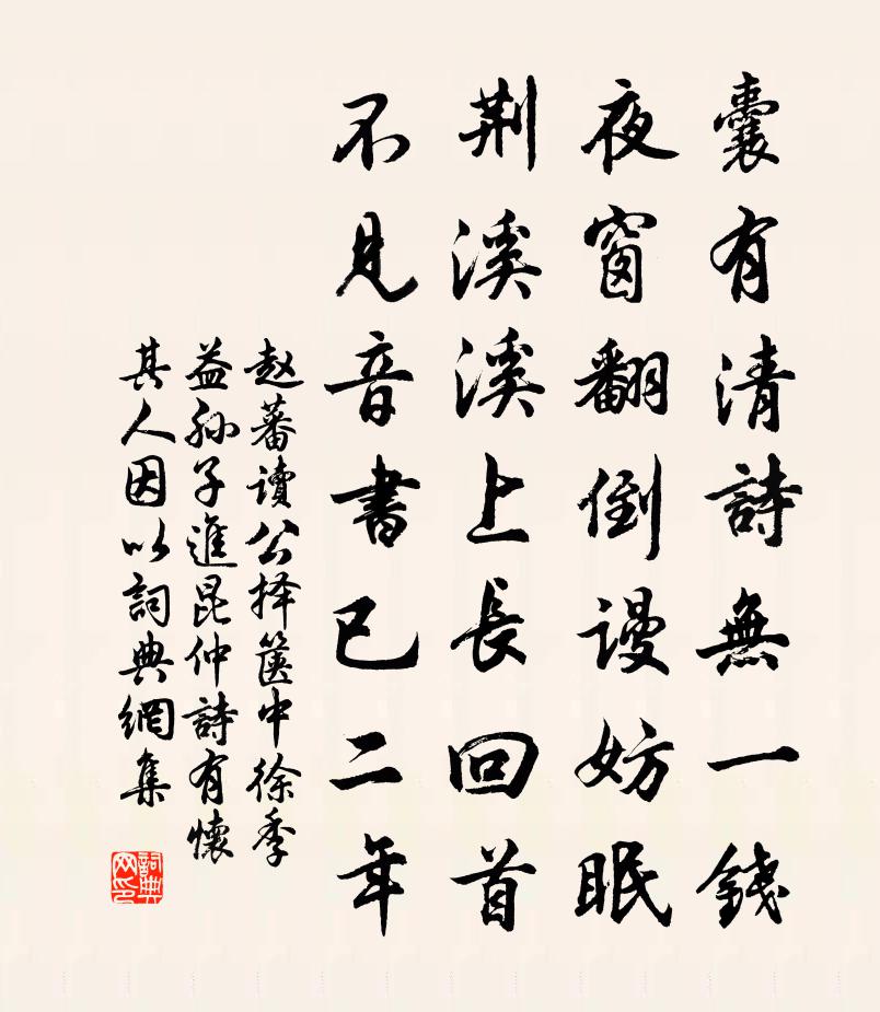 詩詞名句歷史字典書法欣賞書法字典國語詞典說文解字康熙字典古漢語字典標 題 作 者 詩 句 讀公擇篋中徐季益孫子進昆仲詩有懷其人因以作者:趙蕃 朝代:宋代原文囊有清詩無一錢,夜窗翻倒謾妨眠。荊溪溪上長回首,不見音書已二年。詩詞問答問:《讀公擇篋中徐季益孫子進昆仲詩有懷其人因以》的作者是誰?答:趙蕃問:該詩寫於哪個朝代?答:宋代書法欣賞讀公擇篋中徐季益孫子進昆仲詩有懷其人因以書法作品詩文賞析【原題】:讀公擇篋中徐季益孫子進昆仲詩有懷其人因以題贈四首詩詞推薦靜中好晃逈〔宋代〕靜中好,冥心歸宴寂。齋己不虛吟,靜是真訊息。尚書新造花箋徐夤〔唐代〕濃染紅桃二月花,只宜神筆縱龍蛇。淺澄秋水看雲母,碎擘輕苔間粉霞。寫賦好追陳後寵,題詩堪送竇滔家。使君和子野郊居見寄仇遠〔宋代〕歸去來兮意趣長,幽居遠隔水雲鄉。花粘石風吟詩筆,風度溪房煮藥香。把酒有時思太白,下車何日見元方。雲萍八月十八日天曉二首方回〔宋代〕河中船已動,岸亦有人行。城北鐘聲斷,樓東鬼宿明。倚□□酒醒,搔首小詩成。□□中秋熱,今朝始漸清。昔先君子與司直兄相知文字間諸孤懸隔各未相曾協〔宋代〕傳業縣知臭味同,許時蹤跡馬牛風。莫夸今夕為何夕,不見吾翁對若翁。道舊幾驚心欲折,問年俱恨鬢成蓬。只應用強甫蒙仲韻十首劉克莊〔宋代〕不數浮溪與止齋,網羅欲與巽岩偕。極知浩博窺轅固,未肯輕浮學祐涯。愧我孤根難樹立,誤君初草未編排。藏山早行方夔〔元代〕早起理歸裝,殘燈耿曙光。開門半山月,立馬一庭霜。鐘響知雲寺,波聲認石樑。修途留不住,去去出山莊。古朗月行李白〔唐代〕小時不識月,呼作白玉盤。又疑瑤台鏡,飛在青雲端。(青雲 一作:白雲)仙人垂兩足,桂樹何團團。白兔搗藥上蒙里灘楊萬里〔宋代〕清江斜抱嶺根來,暗石衝波卻倒回。幸自琉璃青一片,落灘碎作雪花堆。和答元明黔南贈別黃庭堅〔宋代〕萬里相看忘逆旅,三聲清淚落離觴。朝雲往日攀天夢,夜雨何時對榻涼。急雪脊令相併影,驚風鴻雁不成行。歸舟拙寄董嗣杲〔宋代〕岑寂風煙異,荒寒夢寐危。擇交貧可久,為吏拙難醫。大閫糧艘上,孤營竹笛悲。快沽桑落酒,澆此滿懷詩。逃難杜甫〔唐代〕五十頭白翁,南北逃世難。疏布纏枯骨,奔走苦不暖。已衰病方入,四海一塗炭。乾坤萬里內,莫見容身畔。妻孥同石寺游周敦頤〔宋代〕朝市誰知世外游,杉松影里入吟幽。爭名逐利千繩縛,度水登山萬事休。野鳥不驚如得伴,白雲無語似相留,傍人虞美人 謝成耀卿僉事攜酒芋相過王惲〔元代〕山瓶乳酒甘如蜜。鴟芋堆盤赤。見君相贈固多情。潤我枯腸一吸破愁城。秋光湖碧西灣瀲。不到中心慊。何時盡煮葛嶺林景熙〔宋代〕不讀霍光傳,炫會桃李門。湖山變朝市,烽火滿乾坤。膽落冰天騎,魂飛瘴雨村。春風吹秀麥,誤國竟何言。雜詠一百首轅固劉克莊〔宋代〕面折公孫子,堂堂負直聲。安知上前議,那復有黃生。松江懷古張祜〔唐代〕碧樹吳洲遠,青山震澤深。無人蹤范蠡,煙水暮沈沈。西園十詠琴壇吳中復〔宋代〕瀟灑琴壇上,賢侯養道情。無今亦無古,求意不求聲。林邃風初靜,雲收月乍明。拂弦成一弄,塵思浩然清。逢故人杜牧〔唐代〕故交相見稀,相見倍依依。塵路事不盡,雲岩閒好歸。投人銷壯志,徇俗變真機。又落他鄉淚,風前一滿衣。太守林太博贈瑞香花劉克莊〔宋代〕壞徑泥深古檻斜,居然幻作貴游家。小亭自課僮鋤草,空室俄驚女散花。便覺麝囊無遠韻,頻挑蟻蠹有新芽。紫薇名句推薦讀書好處心先覺,立雪深時道已傳。袁枚《隨園詩話·卷三》 說者成伍,煩言飾辭,而無實用。商鞅《商君書·農戰》 痴男怨女,可憐風月債難償。曹雪芹《紅樓夢·第五回》 姑蘇台上烏棲時,吳王宮裡醉西施。李白《烏棲曲》 春江花朝秋月夜,往往取酒還獨傾。白居易《琵琶行 / 琵琶引》 今日俸錢過十萬,與君營奠復營齋。元稹《遣悲懷三首·其一》 船動湖光灩灩秋,貪看年少信船流。皇甫松《採蓮子·船動湖光灩灩秋》 酒美梅酸,恰稱人懷抱。李清照《蝶戀花·上巳召親族》 夫因兵死守蓬茅,麻薴衣衫鬢髮焦。杜荀鶴《山中寡婦 / 時世行》 漠漠輕寒上小樓,曉陰無賴似窮秋。淡煙流水畫屏幽秦觀《浣溪沙·漠漠輕寒上小樓》