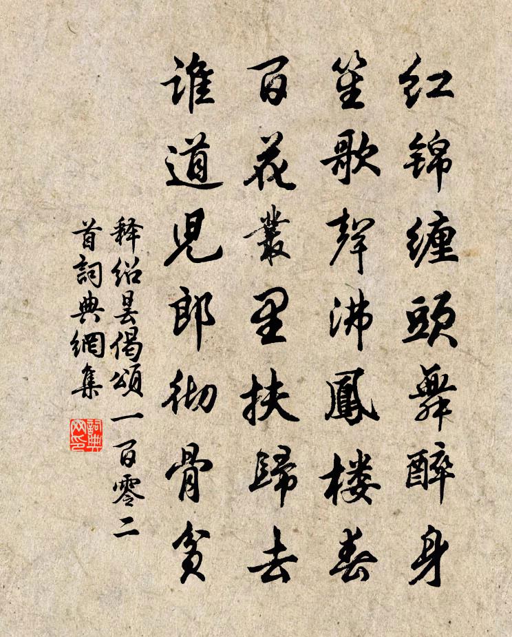 詩詞名句歷史字典書法欣賞書法字典國語詞典說文解字康熙字典古漢語字典標 題 作 者 詩 句 偈頌一百零二首作者:釋紹曇 朝代:宋代偈頌一百零二首原文紅錦纏頭舞醉身,笙歌聲沸鳳樓春。百花叢里扶歸去,誰道兒郎徹骨貧。詩詞問答問:偈頌一百零二首的作者是誰?答:釋紹曇問:偈頌一百零二首寫於哪個朝代?答:宋代釋紹曇偈頌一百零二首書法欣賞偈頌一百零二首書法作品詩詞推薦哭刁景純蘇軾〔宋代〕讀書想前輩,每恨生不早。紛紛少年場,猶得見此老。此老如松柏,不受霜雪槁。直從毫末中,自養到合抱。宏材寄張守仲思十首陳造〔宋代〕我方投老嗟多難,君亦頻年悼百羅。樂事定知神所妒,把杯追話唱酬時。玉樓春辛棄疾〔宋代〕故也。余謂世無是事而有是理,樂所謂無,猶之有也。戲作數語以明之有無一理誰差別。樂令區區渾未達。事言無游山步陸游〔宋代〕蹇驢渺渺過雲邊,旋了三生物外緣。平日視家真逆旅,此行出戶若登仙。飢從野店烹葵飯,困就僧床借枕眠。所恨大佛寺留題李新〔宋代〕綠篠寒松小翠微,魚聲寂寂鼓聲稀。山頭遠見龜屏出,海嶠誰遷石筍歸。欲得鬼神添嶺檜,卻愁風雨斷天衣。醵錢金山觀日出陸游〔宋代〕繫船浮玉山,清晨得奇觀。日輪擘水出,始覺江面寬。遙波蹙紅鱗,翠靄開金盤,光彩射樓塔,丹碧浮雲端。詩人四言詩十一首 其七嵇康〔兩漢〕泆泆白雲。順風而回。淵淵綠水。盈坎而頹。乘流遠逝。自躬蘭隈。杖策答諸。納之素懷。長嘯清原。惟以告哀。征西舊卒許渾〔唐代〕少年乘勇氣,百戰過烏孫。力盡邊城難,功加上將恩。曉風聽戍角,殘月倚營門。自說輕生處,金瘡有舊痕。觀棋貫休〔唐代〕逸格格難及,半先相遇稀。落花方滿地,一局到斜暉。褚胤死不死,將軍飛已飛。今朝慚一行,無以造玄微。過屺瞻墓馬廷鸞〔宋代〕白髮蒼顏六十三,年年拜母憶中男。雲歸別岫山呈碧,江抱寒汀水染藍。草報春暉天罔極,樹隨人老我何堪。薦余初夏幽居陸游〔宋代〕野草幽花無歇時,一窗終日對東籬。病猶獨醉雖堪笑,老未全衰亦自奇。古紙硬黃臨晉帖,矮牋勻碧錄唐詩。箇中次韻答少章聞雁聽雞二首黃庭堅〔宋代〕朝士聞雞常半途,朱門擁被不關渠。秦郎五起聽三唱,殘燭貪傳未見書。回鄉偶書賀知章〔唐代〕離別家鄉歲月多,近來人事半消磨。惟有門前鏡湖水,春風不改舊時波。開元觀閒居,酬吳士矩侍御三十韻(十八時作)元稹〔唐代〕靜習狂心盡,幽居道氣添。神編啟黃簡,秘籙捧朱簽。爛熳煙霞駐,優遊歲序淹。登壇擁旄節,趨殿禮鬍髯。醮起讀老杜詩集王令〔宋代〕氣吞風雅妙無倫,碌碌當年不見珍。自是古賢因發憤,非關詩道可窮人。鐫鑱物象三千首,照耀乾坤四百春。寂寞次韻徐提舉游石湖三絕范成大〔宋代〕日腳烘晴已破煙,山頭雲氣尚披綿。卻須多謝朝來雨,洗淨明湖鏡裹天。秋蕊香·七夕吳文英〔宋代〕懶浴新涼睡早。雪靨酒紅微笑。倚樓起把繡針小。月冷波光夢覺。 怕聞井葉西風到。恨多少。粉河不語墮秋曉。風流子(詠錢塘)楊 * 〔宋代〕佳勝古錢塘。帝居麗、金屋對昭陽。有風月九衢,鳳皇雙闕,萬年芳樹,千雉宮牆。戶十萬,家家堆錦繡,處處鼓贈別上元主簿張著韓翃〔唐代〕上書一見平津侯,劍笏斜齊秣陵尉。朝垂綬帶迎遠客,暮鎖印囊飛上吏。長樂花深萬井時,同官無事有歸期。回船長歌行陸機〔魏晉〕逝矣經天日,悲哉帶地川。寸陰無停晷,尺波豈徒旋。年往迅勁矢,時來亮急弦。遠期鮮克及,盈數固希全。容華名句推薦數人世相逢,百年歡笑,能得幾回又。何夢桂《摸魚兒·記年時人人何處》 水流濕,火就燥。雲從龍,風從虎。佚名《易傳·文言傳·乾文言》 酒闌更喜團茶苦,夢斷偏宜瑞腦香。李清照《鷓鴣天·寒日蕭蕭上瑣窗》 風風雨雨梨花,窄索簾櫳,巧小窗紗。喬吉《折桂令·客窗清明》 身無彩鳳雙飛翼,心有靈犀一點通。李商隱《無題·昨夜星辰昨夜風》 萬里橋西一草堂,百花潭水即滄浪。杜甫《狂夫》 必得之事,不足賴也;必諾之言,不足信也。管仲《管子·形勢》 砌下落梅如雪亂,拂了一身還滿。李煜《清平樂·別來春半》 紫黯紅愁無緒,日暮春歸甚處?龔自珍《如夢令·紫黯紅愁無緒》 孤芳一世,供斷有情愁,消瘦損,東陽也,試問花知否曹組《驀山溪·梅》