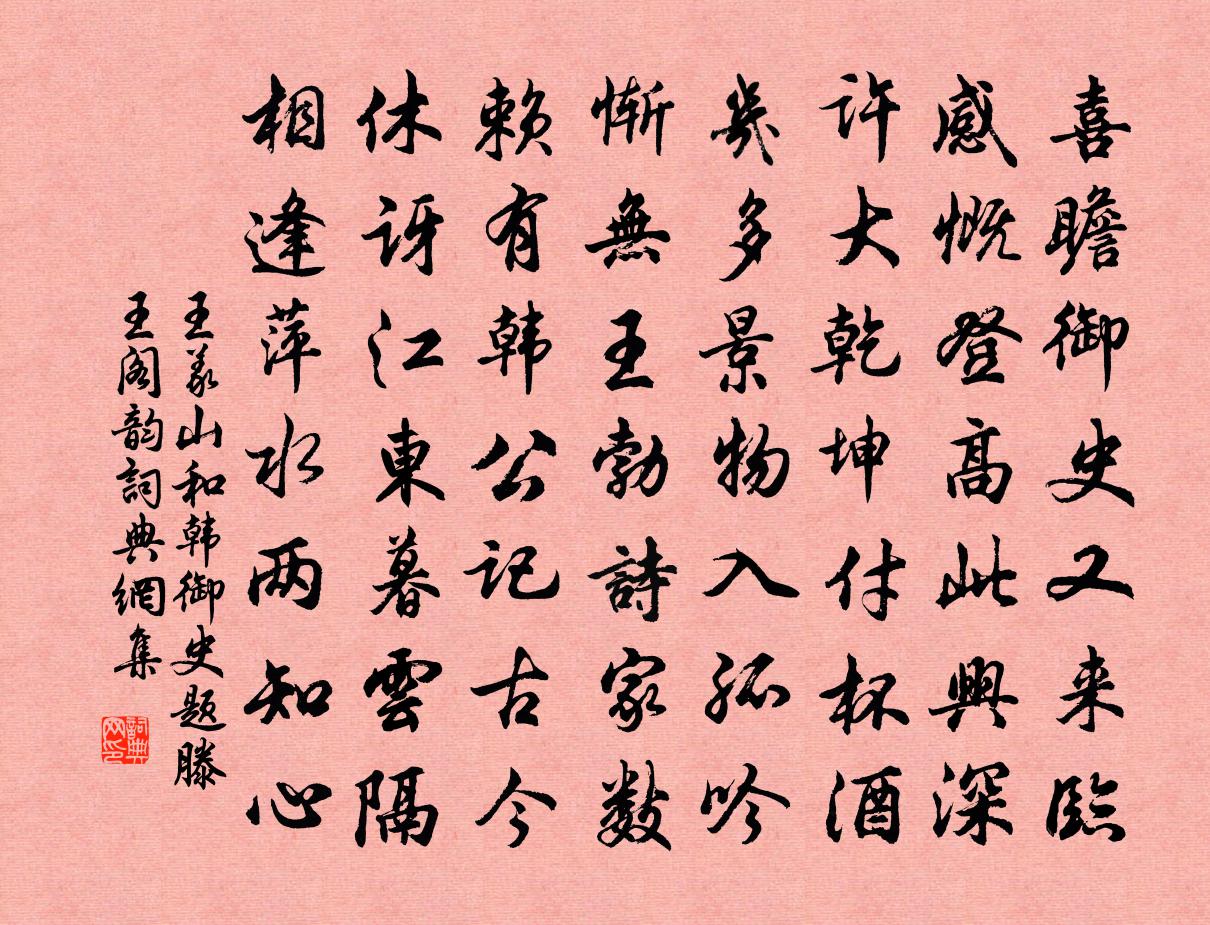 詩詞名句歷史字典書法欣賞書法字典國語詞典說文解字康熙字典古漢語字典標 題 作 者 詩 句 和韓御史題滕王閣韻作者:王義山 朝代:宋代和韓御史題滕王閣韻原文喜瞻御史又來臨,感慨登高此興深。許大乾坤付杯酒,幾多景物入孤吟。慚無王勃詩家數,賴有韓公記古今。休訝江東暮雲隔,相逢萍水兩知心。詩詞問答問:和韓御史題滕王閣韻的作者是誰?答:王義山問:和韓御史題滕王閣韻寫於哪個朝代?答:宋代王義山和韓御史題滕王閣韻書法欣賞和韓御史題滕王閣韻書法作品詩詞推薦晚望方回〔宋代〕萬事何堪挽,江流日夜東。年華三戒後,心緒四愁中。待雪登危阜,觀星仰暗空。夜寒天地黑,幾室有爐紅。臥聞風聲張耒〔宋代〕臥聞風聲吹屋角,應掃積雨陰漫漫。千山月黑鳥飛絕,一江星鬥魚龍寒。萬蝶花蘇轍〔宋代〕誰唱殘春蝶戀花,一團粉翅壓枝斜。美人慾向釵頭插,又恐驚飛鬢似鴉。和卓季萬寄示五絕德操為唱王洋〔宋代〕失計長松習用剛,一官才得鬢毛蒼。酒醪不入瓶空腹,始信鴟夷智慮長。水簾虞大博〔宋代〕疏水成簾造化功,冷光千丈半岩風。層霄螮蝀正鋪地,蒼海珠璣初墮空。天下奇觀更何處,騷人幽詠未全工。要知八月大風大水釋居簡〔宋代〕零落茅茨水半扉,媼顰翁蹙小兒啼。老雞不管豐凶事,獨自將雛樹上樓。訴衷情曹勛〔宋代〕人情世態飽經過。眼也見來多。忙中掉得便去,不是有人唆。雲似舞,水如歌。笑呵呵。這回還我,半世偎綏,一成都書事陸游〔宋代〕劍南山水盡清暉,濯錦江邊天下稀。煙柳不遮樓角斷,風花時傍馬頭飛。芼羹筍似稽山美,斫膾魚如笠澤肥。客報癸未至節以病晚起走筆戲書紀事排悶十首方回〔宋代〕忍事寧生癭,今誰似我能。缺錢分灶婢,賒米乞庵僧。惡語聞皆恕,凡詩見亦稱。平生樓百尺,非復舊陳登。泉聲林用中〔宋代〕穿雲絡日苦悲吟,澗底潺潺覓好音。弦管笙簧寒碎玉,源頭深處細追尋。田父吟五首葉茵〔宋代〕往來雞酒樂村村,一稔允忘大造恩。糶谷可酬婚嫁願,今年好事屬柴門。減字木蘭花(三勸)沈瀛〔宋代〕酒巡未止。更號三般楊氏喜||。上苑春風。寶帶靈犀點點通。聽歌侑酒。富貴兩全添個壽。人少兼何。彭祖人言遊仙詩嵇康〔兩漢〕翩翩鳳翮。逢此網羅。木蘭花慢(次岳總乾韻)黃機〔宋代〕嘆鏡中白髮,元不向、酒邊栽。奈詩習未除,客愁易感,剩要安排。浮名任他有命,怕青山、頗怪不歸來。出屋長送呂興元李新〔宋代〕冰壺舊映藍溪玉,璧乘曾依白帝城。明日武林山下路,過橋唯有杜鵑聲。劉後村被召武衍〔宋代〕銜上官雖顯,吟邊興不衰。細評南嶽稿,遠過後山詩。才大人多忌,名高士素知。瓣香吾敢後,幸見召環時。送岳陽陳倅秩滿還朝八首廖行之〔宋代〕閩為多士鄉,三山最英特。問學可經世,文章更 * 。公維太宰出,宅相有令德。無忌獨何人,猶能弭凶慝。菩薩蠻佚名〔宋代〕昔年曾伴花前醉。今年空灑花前淚。花有再榮時。人無重見期。故人情義重。不忍營新寵。日月有盈虧。妾心無改興安乳洞有上中下三岩,妙絕南州,率同僚餞范成大〔宋代〕山水敦夙好,煙霞痼奇懷。向聞乳洞勝,出嶺更徘徊。雪林縞萬李,東風知我來。華裾繡高原,故人紛後陪。系馬頌古三十三首釋師觀〔宋代〕用處天然別,更不落思惟。山河並大地,全露法王機。名句推薦十年驅馳海色寒,孤臣於此望宸鑾。戚繼光《望闕台》 顧謂戚夫人,彼翁羽翼成。李白《山人勸酒》 東風動百物,草木盡欲言。李白《長歌行》 我歌君起舞,潦倒略相同。陳師道《除夜對酒贈少章》 會桃花之芳園,序天倫之樂事李白《春夜宴桃李園序/春夜宴從弟桃花園序》 教民禮順,莫善於悌。孔子及其弟子《孝經·廣要道》 桃未芳菲杏未紅,沖寒先喜笑東風。曹雪芹《詠紅梅花得“紅”字》 得眾而不得其心,則與獨行者同實。管仲《管子·參患》 凡人之患,蔽於一曲,而闇於大理。荀子《荀子·解蔽》 遠上寒山石徑斜,白雲生處有人家。杜牧《山行》