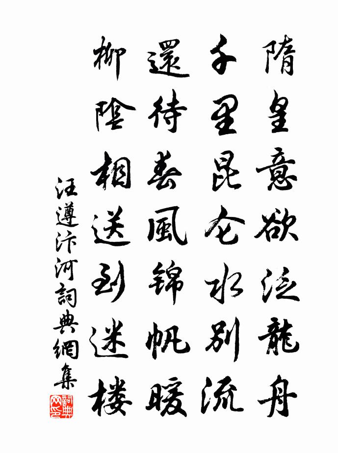 詩詞名句歷史字典書法欣賞書法字典國語詞典說文解字康熙字典古漢語字典標 題 作 者 詩 句 汴河作者:汪遵 朝代:唐代汴河原文隋皇意欲泛龍舟,千里崑崙水別流。還待春風錦帆暖,柳陰相送到迷樓。詩詞問答問:汴河的作者是誰?答:汪遵問:汴河寫於哪個朝代?答:唐代問:汴河是什麼體裁?答:七絕汪遵汴河書法欣賞汴河書法作品注釋全唐詩:卷602-12詩詞推薦題李秋堂盟鷗集朱繼芳〔宋代〕相逢已恨十年遲,買酒吳山一夜詩。明日送春仍送客,柳花風颺鬢絲絲。荊山梅堯臣〔宋代〕和楚人,茲楚地。泣玉山,無所記。但見楚人夸產玉,古廟幽幽無鬼哭。儻有鬼,定無足。重九日登石閣三首邵雍〔宋代〕今歲重陽日,憑欄氣候遲。雲煙雖已淡,林木未全衰。天地開懷處,山川快眼時。欄乾空倚遍,此意有誰知。自安仁至豫章途中雜興十九首趙蕃〔宋代〕草樹蔥蘢山有衣,稻身刺水綠生漪。眼中風物方人境,犬吠雞帝間扊扅。和邵不疑校理蒲州十詩翠樓司馬光〔宋代〕條山翠氣橫,隱嶙秋空窄。色樓雨初度,卷幌延佳色。撲撲滿前軒,嵐光真可摘。閏月二日清坐章甫〔宋代〕秋閏遲收穫,年衰惜友朋。每懷人似玉,安得酒如澠。鵲語何多誕,蟬聲故可憎。茶香新落磨,亦足洗炎蒸。去扇黃滔〔唐代〕城上風生蠟炬寒,錦帷開處露翔鸞。已知秦女升仙態,休把圓輕隔牡丹。訴衷情·秋情吳文英〔宋代〕片雲載雨過江鷗。水色澹汀洲。小蓮玉慘紅怨,翠被又經秋。涼意思,到南樓。小簾鉤。半窗燈暈,幾葉芭蕉,客詠史上宋共姬齊孝公夫人陳普〔宋代〕火來秉節正如山,茀喪何心在世間。身似泥沙心似玉,水中火裹即渾間。江城對月范仲淹〔宋代〕南國風波遠,東門冠蓋回。多情是明月,相逐過江來。西省對花憶忠州東坡新花樹,因寄題東樓白居易〔唐代〕每看闕下丹青樹,不忘天邊錦繡林。西掖垣中今日眼,南賓樓上去年心。花含春意無分別,物感人情有淺深。最憶頌古二十四首釋宗演〔宋代〕無邊剎境,自他不隔毫端。十世古今,始終不離當念。春野行(雜言)溫庭筠〔唐代〕草淺淺,春如剪。花壓李娘愁,飢蠶欲成繭。東城年少氣堂堂,金丸驚起雙鴛鴦。含羞更問衛公子,月到枕前春夢次韻曹清父營生墳追和范石湖韻四首方回〔宋代〕古來奕世保松楸,八百姬周四百劉。今代未聞□□□,□時尚想引{魎兩換其}頭。干戈蒿里無完穴,□□蘭亭有珍珠簾 內午冬雪梁寅〔元代〕西窗夢斷檐光曉。雪交墜、□□山僮驚報。岩岫化銀宮,似白雲仙島。萬樹梨花都開遍,怪一夜、春風來早。凝眺寄劉方平皇甫冉〔唐代〕坐憶山中人,窮棲事南畝。煙霞相親外,墟落今何有。潘郎作賦年,陶令辭官後。達生遺自適,良願固無負。田取菊仇遠〔宋代〕楚澤秋高眾芳歇,眼中見此霜下傑。南窗粲粲 * 株,淡白深黃顏色別。自笑背時難獨立,恰是重陽過一月。丁寧贈韓侍郎晁說之〔宋代〕僕射陂頭鷺宿秋,使君行色曉雲浮。幾章乞得閒歸去,平日將何事絆留。久幸沃心舒讜議,暫堪俯首眨忠謀。黃金雜曲歌辭。昔昔鹽。蘼蕪葉復齊趙嘏〔唐代〕提筐紅葉下,度日采蘼蕪。掬翠香盈袖,看花憶故夫。葉齊誰復見,風暖恨偏孤。一被春光累,容顏與昔殊。北行第九十三文天祥〔宋代〕平野入青徐,桑柘葉如雨。信美無與適,沉思情延佇。名句推薦山從人面起,雲傍馬頭生。李白《送友人入蜀》 士君子立言,貴平正,尤貴精詳。王永彬《圍爐夜話·第二五則》 雪岸叢梅發,春泥百草生。杜甫《陪裴使君登岳陽樓》 婚姻勿貪勢家。顏之推《顏氏家訓·止足篇》 嗚呼!楚雖三戶能亡秦,豈有堂堂中國空無人!陸游《金錯刀行》 思歸未可得,書此謝情人。李白《送郄昂謫巴中》 教子弟於幼時,便當有正大光明氣象;檢身心於平日,不可無憂勤惕厲工夫。王永彬《圍爐夜話·第一則》 一念開明,反身而誠王陽明《傳習錄·卷中·答陸原靜書》 人生易老天難老,歲歲重陽。 * 《採桑子·重陽》 晚風收暑,小池塘荷淨。劉光祖《洞仙歌·荷花》