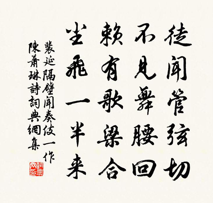 詩詞名句歷史字典書法欣賞書法字典國語詞典說文解字康熙字典古漢語字典標 題 作 者 詩 句 隔壁聞奏伎(一作陳蕭琳詩)作者:裴延 朝代:唐代原文徒聞管弦切,不見舞腰回。賴有歌梁合,塵飛一半來。詩詞問答問:《隔壁聞奏伎(一作陳蕭琳詩)》的作者是誰?答:裴延問:該詩寫於哪個朝代?答:唐代書法欣賞隔壁聞奏伎(一作陳蕭琳詩)書法作品注釋全唐詩:卷769-31詩詞推薦幷州羊腸坂詩江總〔隋代〕三春別帝鄉。五月度羊腸。本畏車輪折。翻嗟馬骨傷。驚風起朔鴈。落照盡胡桑。關山定何許。徒御慘悲涼。夢宴客大樓上命筆作詩既覺續成之陸游〔宋代〕表里江山亦樂哉!華纓滿座敵鄒枚。歌從郢客樓中聽,獵向樊姬墓上回。梅蕊香清篸寶髻,熊蹯味美按新醅。眼邊天台邵明府履病況遺牡丹各賦一絕林表民〔宋代〕人間興廢手搏沙,喬木猶存少故家。不見石邊題甲乙,空科姓氏落名化。官舍阻雨十日湧出悶成五絕呈徐判部劉過〔宋代〕世間別有人才在,台閣招徠恐未多。半老江湖半岩穴,為公一賦草廬歌。謝湯生惠酒和來韻劉宰〔宋代〕聞道吾猶及老成,高秋離索不勝情。朋緘已喜賢從事,二缶那堪對曲生。多病吾今同退鷁,壯懷君同掣長鯨。能來席上戲東川楊尚書柳棠〔唐代〕莫言名位未相儔,風月何曾阻獻酬。前輩不須輕後輩,靖安今日在衡州。過廉水渡二首李新〔宋代〕茂林何事鎖孤煙,開出澄光見碧天。江水不流廉節去,清名長解勝貪泉。禪人並化主寫真求贊釋正覺〔宋代〕蟄梭未飛,肌膚不把。老虎似衰,眼力猶威。頭須霜雪塢,舌頰風雷機。氣爽秋高河漢闊,霽寒夜永鬥牛輝。陰陽和聖俞農具詩十五首其十耒耜王安石〔宋代〕耒耜見於易,聖人取風雷。不有仁智兼,利端誰與開。神農后稷死,般爾相尋來。山林盡百巧,揉斲無良材。呈邢叔三首趙蕃〔宋代〕前輩已雲遠,公身親見之。老成疑故在,風俗未憂衰。問學本日用,文章先達辭。從茲得夷步,不復困多歧。壽星明/沁園春佚名〔宋代〕玉露迎寒,金風薦冷,正蘭桂香。覺秋光過半,日臨三九,蔥蔥佳氣,藹藹琴堂。見說當年,申生穀旦,夢葉長庚送張錄事誠二首方回〔宋代〕歙州江見底,錄事亦如之。休吏早封印,訪僧閒著棋。舊鞍羸馬出,矮屋破簾垂。行處與住處,官清人不知。友人楚孟德過余縱言及神仙余謂之無孟德謂之司馬光〔宋代〕仙家不似人間歡,瑤漿琅菜青玉盤。乘醉東遊憩陽穀,酒瓢間掛扶桑木。依韻奉和司徒侍中同賞牡丹強至〔宋代〕按譜新求洛下栽,朱欄圍土事深培。半妝曉日爭光照,一笑春風喜競開。得地自依孫相合,飛香欲繞鄴王台。繡簾次韻劉無言壽山中五絕句敢請諸僚和之葛立方〔宋代〕命友登山共寄情,亦逢佳處便班荊。有時便取琴雙鎖,寫出蒼髯夜半聲。謝世詩二首吳潛〔宋代〕股肱十載竭丹心,諫草雖多禍亦深。補袞每思期仲甫, * 未必是曾參。氈裘浩蕩紅塵滿,風雨淒涼紫殿陰。遙望思歸樂韓偓〔唐代〕淚滴珠難盡,容殊玉易銷。儻隨明月去,莫道夢魂遙。代書呈張功父楊萬里〔宋代〕不見子張子,令人夢亦思。只應依舊瘦,近作幾多詩。聯句平生事,看花去歲時。海棠今好不,傅語並酴醾。陳時中法台得郡而歸喜而成詩吳芾〔宋代〕去歲秋風話別離,今秋俄報有歸期。自應冠豸登三院,何遽憑熊把一麾。治行佇為千里最,才猷已是九重知。莫辭偈頌一百四十一首釋師範〔宋代〕今朝七月一,明朝七月二。一日又一日,幾個知慚愧。名句推薦聲無小而不聞,行無隱而不形。荀子《荀子·勸學》 紛紛暮雪下轅門,風掣紅旗凍不翻。岑參《白雪歌送武判官歸京》 年年郡縣送征人,將與遼東作丘坂。王建《遼東行》 君子以言有物而行有恆。佚名《易傳·象傳下·家人》 煙橫水際,映帶幾點歸鴉,東風銷盡龍沙雪。賀鑄《石州引·薄雨初寒》 東飛烏鵲西飛燕。盈盈一水經年見。陳師道《菩薩蠻·七夕》 春潮帶雨晚來急,野渡無人舟自橫。韋應物《滁州西澗》 別愁深夜雨,孤影小窗燈。陳克《臨江仙·四海十年兵不解》 居高位者易驕,處佚樂者易侈。張廷玉《明史·列傳·卷二十四》 更可惜,雪中高樹,香篝熏素被。周邦彥《花犯·小石梅花》