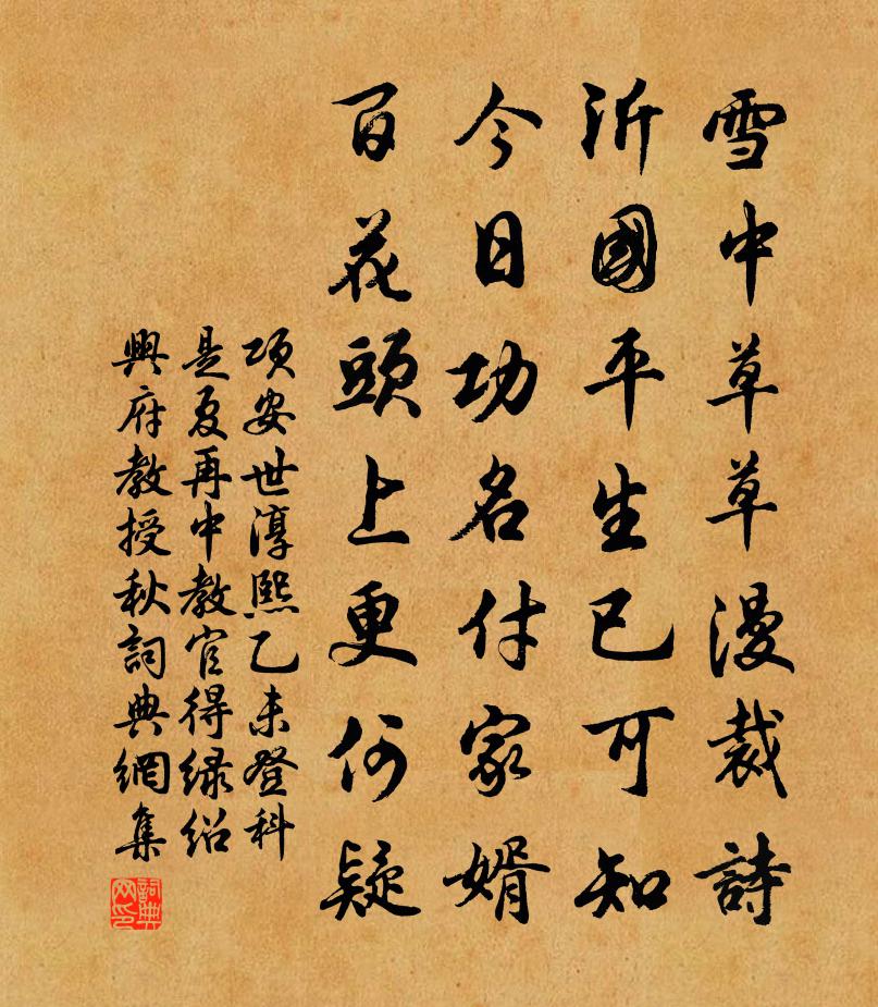 詩詞名句歷史字典書法欣賞書法字典國語詞典說文解字康熙字典古漢語字典標 題 作 者 詩 句 淳熙乙未登科是夏再中教官得綠紹興府教授秋作者:項安世 朝代:宋代原文雪中草草漫裁詩,沂國平生已可知。今日功名付家婿,百花頭上更何疑。詩詞問答問:《淳熙乙未登科是夏再中教官得綠紹興府教授秋》的作者是誰?答:項安世問:該詩寫於哪個朝代?答:宋代書法欣賞淳熙乙未登科是夏再中教官得綠紹興府教授秋書法作品詩文賞析【原題】:淳熙乙未登科是夏再中教官得綠紹興府教授秋末還家待闕時楊樞密為師送程先生赴省八絕句詩詞推薦鸛雀樓晴望馬戴〔唐代〕堯女樓西望,人懷太古時。海波通禹鑿,山木閉虞祠。鳥道殘虹掛,龍潭返照移。行雲如可馭,萬里赴心期。贈僧惟益金君卿〔宋代〕益也非庸僧,黃卷粗漁獵。身雖闤{上門下貴}中,恥與喧囂接。朝彈側楸局,暮杵青黏葉。妙理脫扃鍵,高談騰有感戴復古〔宋代〕皺眉觀世事,把酒讀離騷。天下無公論,胸中有古刀。徒然成耿耿,何以制滔滔。不逐群飛轉,孤鴻畢竟高。臘初小雪後圃梅開二首張耒〔宋代〕風格孤高又國香,故教小雪發新妝。修行嗟我無功力,卻使天魔入道場。送江陰簽判晁太祝梅堯臣〔宋代〕去無珠履為上賓,進船申浦憶春申。江田插秧鵓姑雨,絲網得魚雲母鱗。青天折桂香未滅,紫豉煮蓴甘更新。平時句劉筠〔宋代〕柔桑蔽野鳴雛雉,高柳含風變早蟬。鷓鴣天朱敦儒〔宋代〕通處靈犀一點真。忺隨紫橐步紅茵,箇中自是神仙住,花作簾櫳玉作人。偏澹靜,最尖新。等閒舞雪振歌塵。若教亭西牆下伊渠水中置石,激流潺湲成韻,頗有白居易〔唐代〕嵌巉嵩石峭,皎潔伊流清。立為遠峰勢,激作寒玉聲。夾岸羅密樹,面灘開小亭。忽疑嚴子瀨,流入洛陽城。是時記夢二首釋雲岫〔宋代〕兔角崢嶸出象頭,六街齊打鳳皇球。烏投墨沼雲將合,鷺宿銀河月正秋。華發李泳〔宋代〕華發中年感,青陽萬物和。倦尋先友記,貧羨力田科。江遠千帆落,天空一雁過。還家得新歲,童稚想婆娑。閒吟四首邵雍〔宋代〕欲有一瓢樂,曾無二頃田。丹誠未貫日,白髮已華顛。雲意寒尤淡,松心老益堅。年來疏懶甚,時憶舊林泉。青玉案 喝馬譚處端〔元代〕師真引入修行路。默默無言句。慢慢持修歸真素。般般返照盡成空,馬兒悟。證內外無塵慮。真清真淨投真處。細送客歸登淨遠亭二首楊萬里〔宋代〕犯寒送客只勞神,上到危亭眼頓新。雪汁滈人清入髓,莫將杉袖障頭巾。吳尉東閣西亭劉過〔宋代〕襲桂行香徑,朱欄稍轉西。水風颼石冷,雲月墮檐低。棋敗深杯罰,詩豪健筆題。舞忙釵鬢亂,更為捧柔荑。滿江紅葛長庚〔宋代〕鈞天高處,元自有、瓊樓玉闕。又那更、九霞隱映,五雲斗絕。八面玲瓏光不夜,四圍晃耀寒如月。有廣寒、宮殿時充之訪盤溪有詩次韻王柏〔宋代〕聖賢不出此心公,有為為之未必充。絕學當歸三洞左,正源慾障百川東。坐春立雪誰能繼,弄月吟風豈浪從。方己挽史魯公李曾伯〔宋代〕自出權衡下,當從履屐間。舊遊今歷落,往事幾危艱。紀德哀辭痛,酬知老淚潸。哲人今已矣,魂夢繞鄞山。金縷詞/賀新郎佚名〔宋代〕瑞氣重閩宇。小春餘、璇霜避暖,斂威青女。一點陽和鍾英氣,崧岳今朝誕甫。正兩莢、尚留蓂舞。應想寧川稱壽望江南(晚晴)劉辰翁〔宋代〕朝朝暮,雲雨定何如。花日穿窗梅小小,雪風灑雨柳疏疏。人唱晚晴初。鷺鷥徐照〔宋代〕一點白如雪,頂黏絲數莖。沙邊行有跡,空外過無聲。高柳巢方穩,危灘立不驚。每看閒意思,漁父是前生。名句推薦白頭空負雪邊春,著意問春春不語。劉鎮《玉樓春·東山探梅》 庸德之行,庸言之謹;有所不足,不敢不勉子思《中庸·第十三章》 未老莫還鄉,還鄉須斷腸。韋莊《菩薩蠻·人人盡說江南好》 繡袂捧琴兮,登君子堂。貫休《善哉行·傷古曲無知音》 是親不是親,非親卻是親。佚名《增廣賢文·上集》 天朗氣清,惠風和暢王羲之《蘭亭集序 / 蘭亭序》 泉眼無聲惜細流,樹陰照水愛晴柔楊萬里《小池》 喜無以賞,怒無以殺管仲《管子·版法》 笑時猶帶嶺梅香。試問嶺南應不好。蘇軾《定風波·南海歸贈王定國侍人寓娘》 雨雪雰雰,益之以霢霂。佚名《信南山》