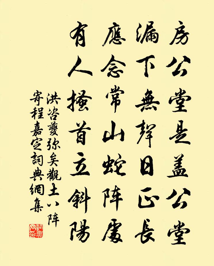 詩詞名句歷史字典書法欣賞書法字典國語詞典說文解字康熙字典古漢語字典標 題 作 者 詩 句 彌矣觀土八陣寄程嘉定作者:洪咨夔 朝代:宋代彌矣觀土八陣寄程嘉定原文房公堂是蓋公堂,漏下無聲日正長。應念常山蛇陣處,有人搔首立斜陽。詩詞問答問:彌矣觀土八陣寄程嘉定的作者是誰?答:洪咨夔問:彌矣觀土八陣寄程嘉定寫於哪個朝代?答:宋代洪咨夔彌矣觀土八陣寄程嘉定書法欣賞彌矣觀土八陣寄程嘉定書法作品詩詞推薦池上梅爛開一枝橫竹間方蕊錢時〔宋代〕臨池滿樹玉離披,縱有餘香已不奇。蹈雪過來亭上坐,竹閒疏蕊忽橫枝。眼兒媚(壽錢德成)洪咨夔〔宋代〕花光燈影浸簾櫳。蓬島現仙翁。瑤裾織翠,詩瞳點碧,酒臉潮紅。竇郎陰德知多少,萬卷奏新功。前庭梧竹,後園侯塘渡孔武仲〔宋代〕空山宿雨漲前溪,芳草連雲欲渡時。落日人心急星火,招招舟子更來遲。滿江紅(丹青閣)游次公〔宋代〕一舸歸來,何太晚、鬢絲如織。謾嘆息、淒涼往事,盡成陳跡。山迫暮煙浮紫翠,溪搖寒浪翻金碧。看長虹、渴飲華亭百詠西庵許尚〔宋代〕蚤為儒冠誤,齊心學竺乾。而今林下塔,夜夜戒光圓。題畫冊花草四首墨竹宋高宗〔宋代〕墨花垂免頴,千古尚漓漓。翠羽風前葉,秋聲雨一枝。詩題春粉節,繃脫玉嬰兒。湘浦人何在,空聞鳳管吹。雨中花(和)葛立方〔宋代〕寄徑濉陽,陌上忽看,夭桃穠李爭春。又見楚宮,行雨洗芳塵。紅艷霞光夕照,素華瓊樹朝新。為奇姿芳潤,擬倩定風波魏初〔元代〕長日心邊一事無。放痴兒女走相扶。不道犖衣緣底事。笑指。杖藜門外看平湖。好借西鄰霜羽鶴。更著。青松和月酴醿宋祁〔宋代〕來自蠶叢國,香傳弱水神。析酲疑破鼻,並艷欲留春。偈二首釋休〔宋代〕結夏時左眼半斤,解夏時右眼八兩。謾雲九十日安居,贏得一肚皮妄想。直饒七穴八穿,未免山僧拄杖。題臧子儀扇陳造〔宋代〕買鄰千萬許兒賒,老子詩成賴指瑕。門枕醴泉交讓木,行人不問識君家。改作池亭子安弟賦二絕因和韻程公許〔宋代〕榿隴低風呈遠碧,稻勝分溜溢方池。簿書課辦心如不,獨岸烏紗琢詩。戲答野人陸游〔宋代〕日飲雲根一脈泉,知君骨相自應仙。曲肱閒臥茅檐下,買斷南山不用錢。上元夫人楊維楨〔元代〕仙人在世間,招之還可來。何用三韓外,樓船言蓬萊。颯然精爽合,偕入東華台。怖我以蛇虎,令我心死灰。叔卿上已玉津園賜宴楊億〔宋代〕禊飲逢元已,春遊盛舞雩。流杯傳楚俗,飫賜出堯廚。玉樹天開苑,銀潢水貫都。肆筵環曲沼,飛蓋塞交衢。洛邑安居瀕江小藍留三小詩李新〔宋代〕觀水觀瀾見會同,人情難似水朝東。寄聲囑付王家老,深鎖堂前悲翠籠。淳熙七年春帖子壽聖齊明廣慈太上皇后合六崔敦詩〔宋代〕玉壓闌乾日影長,雲窗侍女晝焚香。琅函自檢長生籙,金管時書急就章。聞五月八日宸翰口號十首劉克莊〔宋代〕三重茅喜無乾雨,一瓣香祈大有年。卻笑痴人即山鑄,不如老子仰天田。戲作簡朱天球吳則禮〔宋代〕江頭雪花一尺圍,不妨屋角梅垂垂。江頭三日浪簸船,不妨老子被底眠。權奇突兀眾所嗔,大是箇中英特人。何曾披襟胡宏〔宋代〕小小池台亭榭,披襟風月清明。不向情邊造作,知音遍滿乾坤。名句推薦朝作輕寒暮作陰,愁中不覺已春深。屈大均《壬戌清明作》 令公桃李滿天下,何用堂前更種花。白居易《奉和令公綠野堂種花》 怕相思,已相思,輪到相思沒處辭,眉間露一絲。俞彥《長相思·折花枝》 一年一度,爛漫離披,似長江去浪。吳澄《渡江雲·揭浩齋送春和韻》 不知戒,後必有,恨後遂過不肯悔,讒夫多進荀子《荀子·成相》 攜壺酌流霞,搴菊泛寒榮。李白《九日》 百里不同風,千里不同俗班固《漢書·傳·王貢兩龔鮑傳》 山不厭高,海不厭深曹操《短歌行》 晨起開門雪滿山,雪晴雲淡日光寒。鄭燮《山中雪後》 巴子城頭青草暮。巴山重疊相逢處。張先《漁家傲·和程公辟贈》