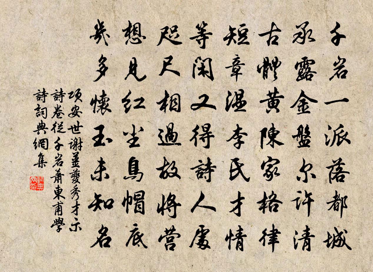 詩詞名句歷史字典書法欣賞書法字典國語詞典說文解字康熙字典古漢語字典標 題 作 者 詩 句 謝姜夔秀才示詩卷從千岩蕭東甫學詩作者:項安世 朝代:宋代原文千岩一派落都城,承露金盤爾許清。古體黃陳家格律,短章溫李氏才情。等閒又得詩人處,咫尺相過故將營。想見紅塵鳥帽底,幾多懷玉未知名。詩詞問答問:《謝姜夔秀才示詩卷從千岩蕭東甫學詩》的作者是誰?答:項安世問:該詩寫於哪個朝代?答:宋代書法欣賞謝姜夔秀才示詩卷從千岩蕭東甫學詩書法作品詩詞推薦都中次韻申季山戴復古〔宋代〕車馬喧臨十二門,樂從閒處度朝昏。詩書豈為功名重,軒冕何如道誼尊。志士不能行所學,明君亦或諱忠言。世間一公新泉(一作題靈一上人院新泉)嚴維〔唐代〕山下新泉出,泠泠北去源。落池才有響,噴石未成痕。獨映孤松色,殊分眾鳥喧。唯當清夜月,觀此啟禪門。湖西雜感詩釋智圓〔宋代〕白犬宵行似有情,為防暴客到天明。近來守禦無功績,不吠人形祇吠聲。寄李次翁黃庭堅〔宋代〕兩斷山川明,花深鳥烏樂。枯骨不沾名,古今同一壑。惟有在世時,聊厚不為薄。南箕與北斗,親友多離索。斯文句趙崇嶓〔宋代〕月入星辰大,山明天地秋。頌古三十八首釋慧方〔宋代〕台山路上人難進,獨有趙州親到來。勘破老婆回首處,從此行人眼不開。天宮閣早春白居易〔唐代〕天宮高閣上何頻,每上令人耳目新。前日晚登緣看雪,今朝晴望為迎春。林鶯何處吟箏柱?牆柳誰家曬麴塵?可惜念奴嬌佚名〔宋代〕砌紅慵掃,問東風、應念西園寥落。簾卷垂楊鶯囀巧,才見還因飛卻。捻指光陰,關心節序,總在鞦韆索。翻翻雙金剛隨機無盡頌如法受持分第十三釋印肅〔宋代〕庾嶺問南能,踏碓到三更。誰知憨俗漢,紹祖列傳燈。行營即事劉商〔唐代〕萬姓厭干戈,三邊尚未和。將軍夸寶劍,功在 * 多。用坡仙郁孤台韻送鄭繡使還朝曾由基〔宋代〕人人羨登仙,去作上界游。誰知世蒙恩,公其晦叔流。眾芳正回春,一葉偶似秋。靈修豈數化,宿莽休檻洲。卻憐又和前韻十首廖行之〔宋代〕勁氣由來不可摧,年年偏向臘前開。清芬肯為冰霜減,好在含章檐下栽。春雪李建勛〔唐代〕南國春寒朔氣回,霏霏還阻百花開。全移暖律何方去,似誤新鶯昨日來。平野旋銷難蔽草,遠林高綴卻遮梅。不知山中喜靜和子見訪施肩吾〔唐代〕絕壁深溪無四鄰,每逢猿鶴即相親。小奴驚出垂藤下,山犬今朝吠一人。次韻楊明叔四首黃庭堅〔宋代〕全德備萬物,大方無四隅。身隨腐草化,名與太山俱。道學歸吾子,言詩起老夫。無為蹈東海,留作濟川桴。與嚴二郎奉禮別杜甫〔唐代〕別君誰暖眼,將老病纏身。出涕同斜日,臨風看去塵。商歌還入夜,巴俗自為鄰。尚愧微軀在,遙聞盛禮新。山東春到村居好四絕鄭剛中〔宋代〕春至村居好,枯腸飽可圖。筍尖將露角,麥秀欲生須。送游堯臣歸閩六首王炎〔宋代〕松楸不掃灑,吾甚思江東。七閩在其南,雲間無去鴻。關山共明月,何時一尊同。小游忘年友,努力翰墨中。鑄金偈頌七十六首釋子益〔宋代〕一槌便就,顢顢頇頇。不假一槌,無端無端。忙裡工夫閒處覓,鬧中訊息靜中觀。挽林進士劉克莊〔宋代〕一門皆擢第,君獨老儒冠。試卷年年納,經書日日看。文為前輩賞,命合主司難。遙想泉台恨,銘旌未寫官。名句推薦齊唱憲王春樂府,金梁橋外月如霜。李夢陽《汴京元夕》 故人不可見,新知萬里外。文天祥《端午即事》 關山多雨雪,風水損毛衣。李遠《詠雁》 停杯投箸不能食,拔劍四顧心茫然。李白《行路難·其一》 夜聽胡笳折楊柳,教人意氣憶長安。王翰《涼州詞二首》 國破山河在,城春草木深。杜甫《春望》 君子以成德為行,日可見之行也。佚名《易傳·文言傳·乾文言》 沙上並禽池上暝。雲破月來花弄影。張先《天仙子·水調數聲持酒聽》 撥雪尋春,燒燈續晝。毛滂《踏莎行·元夕》 但恨處非位,愴悢使心傷。阮籍《詠懷八十二首·其七十九》