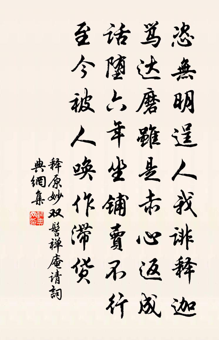 詩詞名句歷史字典書法欣賞書法字典國語詞典說文解字康熙字典古漢語字典標 題 作 者 詩 句 雙髻禪庵請作者:釋原妙 朝代:宋代雙髻禪庵請原文恣無明,逞人我。誹釋迦,罵達磨。雖是赤心,返成話墮。六年坐鋪賣不行,至今被人喚作滯貨。詩詞問答問:雙髻禪庵請的作者是誰?答:釋原妙問:雙髻禪庵請寫於哪個朝代?答:宋代釋原妙雙髻禪庵請書法欣賞雙髻禪庵請書法作品詩詞推薦哭李三白居易〔唐代〕去年渭水曲,秋時訪我來。今年常樂里,春日哭君回。哭君仰問天,天意安在哉?若必奪其壽,何如不與才?落然寄福州從事殷堯藩鮑溶〔唐代〕越嶺寒輕物象殊,海城台閣似蓬壺。幾回入市鮫綃女,終歲啼花山鷓鴣。雷令劍龍知去未,虎夷雲鶴亦來無。就中程密學知益州宋祁〔宋代〕墀塗晝對光堯蓂,細札芝泥襲綬馨。三獨舊台呼輻寵,十連新府夢刀靈。雲梯霽日明鉤棧,雨閣蒼苔蝕劍銘。只恐和君錫雪後招控春司馬光〔宋代〕莫嫌微雪壓梅牙,已有歸鴻泊浦沙。天上詔來難久駐,直須早看洛陽花。送王道士還京賈至〔唐代〕一片仙雲入帝鄉,數聲秋雁至衡陽。借問清都舊花月,豈知遷客泣瀟湘。郊居與八弟無斁讀書晁補之〔宋代〕坐狂得世捐,作官故不了。十年未弛負,半世不黔灶。居然顏玉雪,及是鬢蓬葆。碧山已焚魚,白水初種稻。瓜區頌證道歌證道歌釋印肅〔宋代〕祗知犯重障菩提,彼者堪修我不宜。龍女化身來警世,畜生驢馬我同伊。有感譚嗣同〔清代〕世間無物抵春愁,合向蒼冥一哭休。四萬萬人齊下淚,天涯何處是神州。敷水歌,送竇漸入京岑參〔唐代〕羅敷昔時秦氏女,千載無人空處所。昔時流水至今流,萬事皆逐東流去。此水東流無盡期,水聲還似舊來時。岸花早發杜荀鶴〔唐代〕東窗未明塵夢蘇,呼童結束登征途。落葉鋪霜馬蹄滑,寒猿嘯月人心孤。時逆帽檐風颳頂,旋呵鞭手凍粘須。青雲華清宮張玉孃〔宋代〕柳暗春風遠,花飛香夢殘。夜深明月度,寂寞玉雕蘭。省中二首王安石〔宋代〕萬事悠悠心自知,強顏於世轉參差。移床獨臥秋風裡,靜看蜘蛛結網絲。冬懷三首張耒〔宋代〕揚雄老不遇,寂寞玩文史。廁身虎狼間,乃卒脫其死。中恬遺外慕,獨樂異眾喜。但有載酒人,何用求知己。寓嘆陸游〔宋代〕久矣門無客,高齋獨掩扉。敢言消壯志,要是息危機。清露夜自滴,孤雲寒不歸。晨炊勿關念,更典篋中衣。書齋壁仇遠〔宋代〕苔色排檐綠上階,詵詵衿佩集虛齋。耳根厭聽閒風雨,惟有讀書聲最佳。小星佚名〔先秦〕嘒彼小星,三五在東。肅肅宵征,夙夜在公。寔命不同。嘒彼小星,維參與昴。肅肅宵征,抱衾與裯。寔命不猶。失題孫處玄〔唐代〕漢家輕壯士,無狀殺彭王。一遇風塵起,令誰守四方。宿法華寺嚴維〔唐代〕一夕雨沉沉,哀猿萬木陰。天龍來護法,長老密看心。魚梵空山靜,紗燈古殿深。無生久已學,白 * 相侵。答李任道謝分豆粥黃庭堅〔宋代〕豆粥能驅晚瘴寒,與公同味更同餐。安知天上養賢鼎,且作山中煮菜看。風流子利登〔宋代〕梨園花柳地,扶殘醉、曾記問妖嬈。嘆惹住輕煙,柔絲未改,霏零疏雨,膩粉先飄。更低道,花無三日艷,柳有一名句推薦寒隨一夜去,春逐五更來。史青《應詔賦得除夜》 被酒莫驚春睡重,賭書消得潑茶香,當時只道是尋常。納蘭性德《浣溪沙·誰念西風獨自涼》 思欲委符節,引竿自刺船。元結《賊退示官吏》 聚散匆匆,雲邊孤雁,水上浮萍。劉過《柳梢青·送盧梅坡》 凡彼禍難也,先者恆凶,後者恆吉。佚名《黃帝四經·十大經·雌雄節》 元方難為兄,季方難為弟。劉義慶《世說新語·德行》 燕支落漢家,婦女無華色。李白《塞上曲》 小人錯其在己者,而慕其在天者。荀子《荀子·天論》 北極朝廷終不改,西山寇盜莫相侵。杜甫《登樓》 不管煙波與風雨,載將離恨過江南。鄭文寶《柳枝詞》