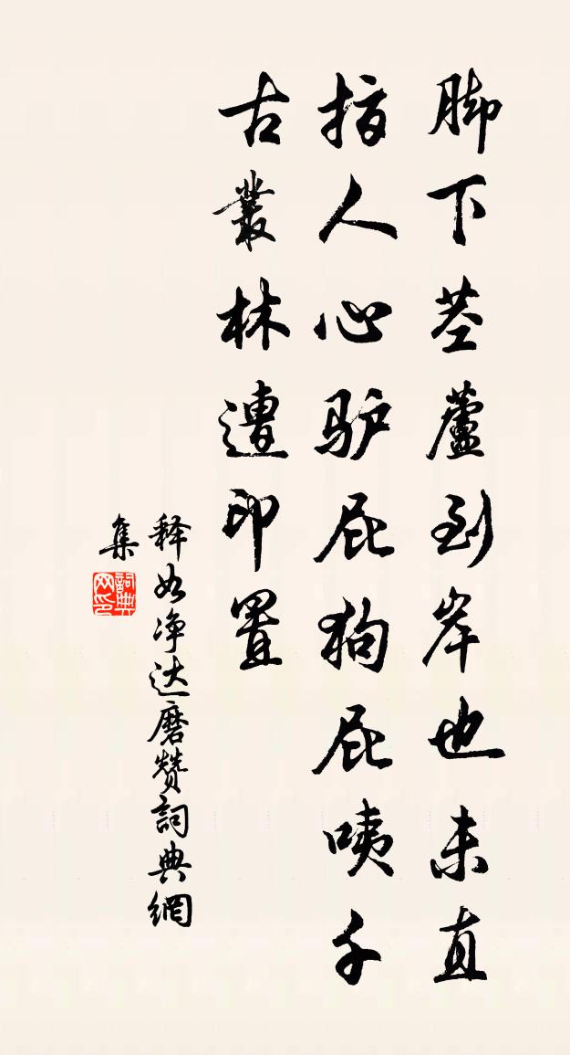 詩詞名句歷史字典書法欣賞書法字典國語詞典說文解字康熙字典古漢語字典標 題 作 者 詩 句 達磨贊作者:釋如淨 朝代:宋代達磨贊原文腳下莖蘆,到岸也未。直指人心。驢屁狗屁。咦,千古叢林遭印置。詩詞問答問:達磨贊的作者是誰?答:釋如淨問:達磨贊寫於哪個朝代?答:宋代釋如淨達磨贊書法欣賞達磨贊書法作品詩詞推薦寄晦庵二首趙蕃〔宋代〕道大誰能與,才難聖所嘆。浮雲雖蹔掩,寶氣不終蟠。走卒稱司馬,蒼生起謝安。縱無臨賀送,當有翰林觀。橫吹曲辭。折楊柳張祜〔唐代〕紅粉青樓曙,垂楊仲月春。懷君重攀折,非妾妒腰身。舞帶縈絲斷,嬌娥向葉嚬。橫吹凡幾曲,獨自最愁人。次章房陵韻四首陳造〔宋代〕詩法究源委,今古有正傳。寥寥風騷後,誰定執此權。杜韓到黃陳,刃藏牛無全。愧我蟁負山,良夜卓兩肩。邀涼亭五首彭龜年〔宋代〕簿書本不俗,定能礙涼颸。少陵冰壑心,卻恨與事違。廣州登蓋海樓曾豐〔宋代〕他求無可洗塵勞,蓋海樓余百尺高。十萬人煙城繚繞,三千世界水週遭。偏於物外有雙眼,正以胸中無一毫。非與送契寧上人釋祖欽〔宋代〕道契佛祖,身自康寧。行篤言寡,名香德馨。一塵不染,千里前程。番陽浩浩,集雲青青。穩泛扁舟短櫂,西風浪遣懷釋紹嵩〔宋代〕落拓無生計,放懷使所便。托心時散帙,即事偶成篇。此道欣逢泰,平生祗信緣。殷勤伴幽獨,松亞小窗前。追和東坡郭熙秋山示王覺民王之道〔宋代〕平生最愛煙水閒,不知歲月磨江山。干戈七載厭奔走,清霜夜入飛蓬間。我家山水擅平遠,未向郭熙見秋晚。驚鴻定風波(次楊茶使七夕韻)京鏜〔宋代〕何必穿針上彩樓。剖瓜插竹訴窮愁。聞道天孫相會處,銀漢無津,不待泛蘭舟。動是隔年尋素約,何似,每逢清夢海山樓陳瓘〔宋代〕勝事荒湮久,高城觀閣宜。均勞青瑣客,餘事海山詩。次幽獨君韻陸龜蒙〔唐代〕靈氣獨不死,尚能成綺文。如何孤窆里,猶自讀三墳。落日送萬古,秋聲含七哀。枯株不蕭瑟,枝幹虛崔嵬。伊昔續舊句蘇泂〔宋代〕人人不識句中眼,請問吾家岩壑翁。只把荒耽譏晉士,那知經濟在其中。和《分水嶺》白居易〔唐代〕高嶺峻稜稜,細泉流娓娓。勢分合不得,東西隨所委。悠悠草蔓底,濺濺石罅里。分流來幾年?晝夜兩如此。朝宗簡柳濬卿沈說〔宋代〕一別僅三年,相看事宛然。旋添新蒜髮,猶聳舊吟肩。紅日征途外,黃花喜氣邊。不須勞寄問,姓字有人傳。宿吉祥寺贈應上人王之道〔宋代〕窗前修竹翠摩雲,清閟題軒念昔人。三紀重來驚隔世,一言相契定前因。攜尊得得紛親友,抉藕累累萃里民。祖意見王宣子侍郎二首楊萬里〔宋代〕老去渾多難,愁來敢怨天。生遭文字誤,更結簿書緣。苦憶懸間榻,難回雪後船。三年才一見,百歲幾三年。游白狼山兩首鄭燮〔清代〕懸岩小閣碧梧桐,似有人聲在半空。百叩銅環渾不應,松花滿地午蔭濃。送許判官志仁王之道〔宋代〕是行猶及豫章春,聞說逢迎有故人。傾蓋為君殊快意,摻祛令我重傷神。向陽花木初開葉,得雨蛟龍已轉身。江上新亭薄暮錢時〔宋代〕讀罷羲經笑倚空,蜀溪溪上蜀溪翁。詩成斷雨流雲外,人在光風霽月中。句宋祁〔宋代〕再來戴公宅,客過孝王家。名句推薦人學始知道,不學非自然。孟郊《勸學》 料黛眉重鎖隋堤,芳心還動梁苑。盧祖皋《宴清都·初春》 女大不中留。馮夢龍《警世通言·卷三十八》 家住層城臨漢苑,心隨明月到胡天。皇甫冉《春思》 終然獨不見,流淚空自知。李白《獨不見》 女也不爽,士貳其行。士也罔極,二三其德。佚名《氓》 試澆橋下水,今夕到湘中。陳與義《臨江仙·高詠楚詞酬午日》 金玉其外,敗絮其中劉基《賣柑者言》 何處是歸程?長亭連短亭。李白《菩薩蠻·平林漠漠煙如織》 時人不識農家苦,將謂田中谷自生。顏仁郁《農家》