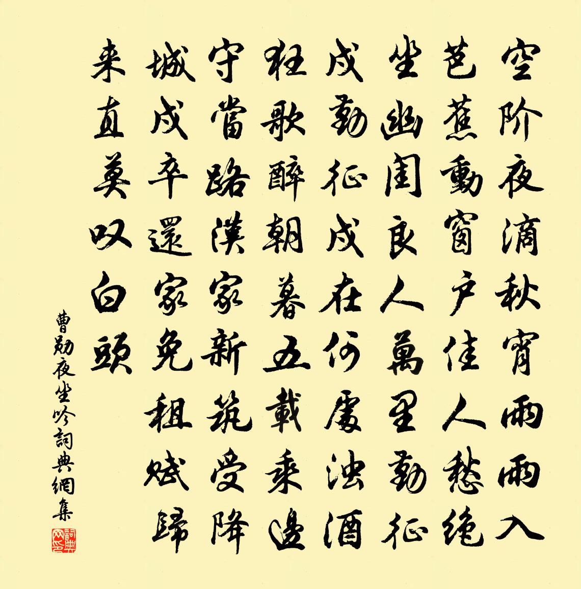 詩詞名句歷史字典書法欣賞書法字典國語詞典說文解字康熙字典古漢語字典標 題 作 者 詩 句 夜坐吟作者:曹勛 朝代:宋代夜坐吟原文空階夜滴秋宵雨,雨入芭蕉動窗戶。佳人愁絕坐幽閨,良人萬里勤征戍。勤征戍,在何處,濁酒狂歌醉朝暮。五載乘邊守當路。漢家新築受降城,戍卒還家免租賦。歸來直莫嘆白頭,詩詞問答問:夜坐吟的作者是誰?答:曹勛問:夜坐吟寫於哪個朝代?答:宋代曹勛夜坐吟書法欣賞夜坐吟書法作品詩詞推薦次劉曉窗九日韻十首楊公遠〔宋代〕西風搖落雁南飛,黃葉深深擁竹扉。佳節只消拚酩酊,牛山何事淚沾衣。句錢惟演〔宋代〕客亭厭見名長短,村酒那能辨聖賢。送徐仲洪尉南安八首彭龜年〔宋代〕作尉之難似胗屍,一生一死總吾為。是心倘有分毫歉,脫手翻車悔莫追。送蜀李道士白玉蟾〔宋代〕我居瓊海子潼川,相望西南路八千。乃祖青牛今不返,予家白鹿尚閒眠。雲萍莫測真如夢,琴劍相逢亦宿緣。多少早起偶成張耒〔宋代〕枕席清如水,蕭然一老僧。雞聲消壁月,曉日失窗燈。山葉寒逾響,江雲薄易凝。老僧曾教我,任運且騰騰。言志寄劉鈞秀才李中〔唐代〕童稚親儒墨,時平喜道存。酬身指書劍,賦命委乾坤。秋爽鼓琴興,月清搜句魂。與君同此志,終待至公論。詠夾徑菊薛能〔唐代〕夾徑盡黃英,不通人並行。幾曾相對綻,元自兩行生。叢比高低等,香連左右並。畔搖風勢斷,中夾日華明。間隔對酒奉懷無咎二首張耒〔宋代〕城門失火池魚窮,樹頭風聲酒榼空。雖貧家婦有旨蓄,一一可口不待豐。往來曳杖兩足健,醉後喔詩雙頰紅。最憶題琳老所攜二蘇書帖毛滂〔宋代〕道人此書欲在眼,扁舟一宿亦隨身。霽月光風開玉軸,千年彷佛見斯人。採蓮曲齊己〔唐代〕越溪女,越江蓮。齊菡萏,雙嬋娟。嬉遊向何處,採摘且同船。浩唱發容與,清波生漪連。時逢島嶼泊,幾共鴛鴦偶書張鎡〔宋代〕花柳無情浪占春,浴鵝波暖草方熏。催畊野曠鳴黃犢,瞰客籬疎立茜裙。拚睡工夫便日永,得閒滋味苦愁分。行行送李寺丞歸臨江王曾〔宋代〕辭榮知退出塵埃,澤國皆推隱逸才。清世不為王事累,白雲重向帝鄉來。僧因好古留棋訣,鷗為忘機戀釣台。應見虎柙葉茵〔宋代〕生長古林丘,擒來鐵繫囚。休憐廣變豹,尚覺氣吞牛。檻陷終難況,咆哮亦可休。山中藜藿少,君合早為謀。沁園春 送劉牧之同知歸江南張之翰〔元代〕昨日送春,今日送君,難禁別離。正桃花水滿,遠歸江浙,楝花風起,輕出京師。早把功名,置之身外,世上何愁壯椿歲(壽趙丞相)佚名〔宋代〕恭審某官間期淑氣,特立高標。仰維岳之生賢,一朝獻頌;賦緇衣而入相,四海同聲。欣逢五百年之期,願上八千人送岩桂二首姜特立〔宋代〕香馥清晨可療飢,飽人勝食齋房芝。便好架巢枝上宿,不愁無酒呼愁詩。梁父吟葉適〔宋代〕依大麓之遺址兮,儲后土之神靈。樂天地之休嘉兮,皇涓潔而薦誠。集后土之雍容兮,刺百聖之禮文。卻大輅而御呈毛伯明李叔器趙蕃〔宋代〕陰雨春三月,倦遊天一隅。故難同類我,還復嘆猶吾。不惑防終蔽,無聞恐遂愚。猶欣得師友,可以慰羈孤。逍遙詠宋太宗〔宋代〕豈將容易話長生,辛苦徒勞業未精。安肯便教貪上得,先須禮讓後純誠。絳霄音旨人難解,白雪消停豎有橫。象外乾道聖德頌曹勛〔宋代〕維聖有作,紹隆興運。天經地義,宗堯越舜。風俗惇厚,日星清潤。冰天桂海,鹹祗成訓。皇矣藝祖,肇開宗祊。名句推薦留戀海棠顏色、過清明。張輯《南歌子·柳戶朝雲濕》 青山欲共高人語。聯翩萬馬來無數。辛棄疾《菩薩蠻·金陵賞心亭為葉丞相賦》 信命者,亡壽夭;信理者,亡是非;信心者,亡逆順;信性者,亡安危。列子及其弟子《列子·力命》 心似雙絲網,中有千千結。張先《千秋歲·數聲鶗鴂》 並刀如水,吳鹽勝雪,縴手破新橙。周邦彥《少年游·並刀如水》 甚荒唐,到頭來都是為他人作嫁衣裳!曹雪芹《紅樓夢·第一回》 牛困人飢日已高,市南門外泥中歇。白居易《賣炭翁》 君子恥其言而過其行。孔子弟子《論語·憲問篇》 寒泉貯、紺壺漸暖,年事對、青燈驚換了。吳文英《花犯·謝黃復庵除夜寄古梅枝》 暗教愁損蘭成,可憐夜夜關情張炎《清平樂·候蛩淒斷》