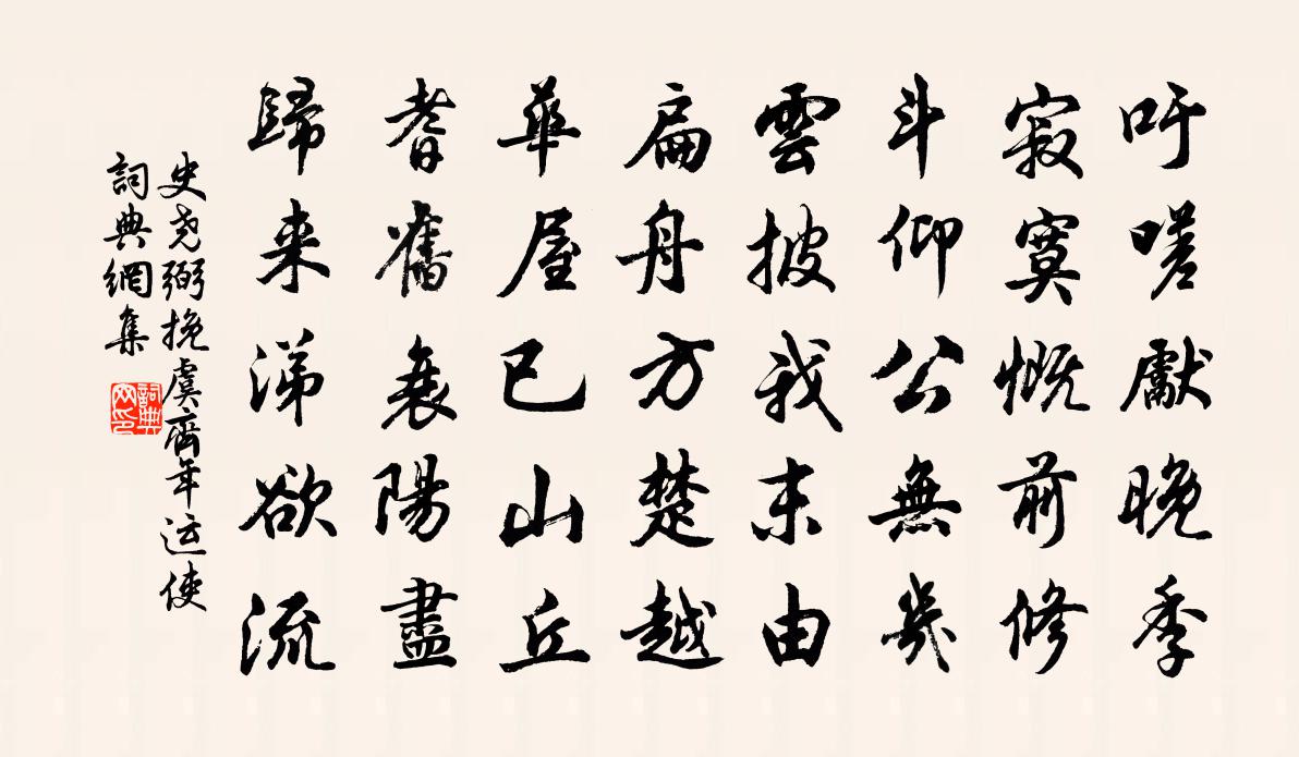 詩詞名句歷史字典書法欣賞書法字典國語詞典說文解字康熙字典古漢語字典標 題 作 者 詩 句 挽虞齊年運使作者:史堯弼 朝代:宋代挽虞齊年運使原文吁嗟先晚季,寂寞慨前修。斗仰公無幾,雲披我末由。扁舟方楚越,華屋已山丘。耆舊衰陽盡,歸來涕欲流。詩詞問答問:挽虞齊年運使的作者是誰?答:史堯弼問:挽虞齊年運使寫於哪個朝代?答:宋代史堯弼挽虞齊年運使書法欣賞挽虞齊年運使書法作品詩詞推薦春日雜興方岳〔宋代〕鶴骨嶄嶄疾未廖,怯行山亦倦登樓。久知老去事當爾,自入春來雨不休。虛器甚慚居士屩,實封難覓醉鄉侯。小遲道室即事陸游〔宋代〕黃金堆屋無處用,甲第連雲誰與居?莫笑先生無仆馬,風雷萬里跨鯨魚。山中方岳〔宋代〕長嘯出門山月高,古來寧獨我蓬蒿。拙於生事豈無粥,猶有故情焉用袍。壠畝桑麻豳雅頌,亭皋木葉楚離騷。不知和王右司游南嶽得晴王炎〔宋代〕笑披鶴氅上坡陀,風籟無聲日氣和。絕頂瓊瑤蒙竹樹,上方宮殿隔藤蘿。雪花夜墮方如許,天宇晨開豈有他。一點和杜老人龍門寺題寶界東柱劉黻〔宋代〕招提有宿緣,坐此豁心境。風來松寄聲,月過竹移影。殿依鯉石古,井汲龜泉冷。究竟定慧門,如何日三省。生查子·短焰剔殘花納蘭性德〔清代〕短焰剔殘花,夜久邊聲寂。倦舞卻聞雞,暗覺青綾濕。天水接冥濛,一角西南白。欲渡浣花溪,遠夢輕無力。送計祖仁雒縣丞李流謙〔宋代〕青青楊柳灞橋斜,滿酌清樽莫嘆嗟。可是因循成別緒,只應咫尺便天涯。未論流水千竿竹,且看春風一縣花。渺渺寄趙簡叔知宗劉克莊〔宋代〕造物方將貴此翁,煌煌三印屈盤紅。箋天不受珠犀涴,表海新兼鈇鉞雄。詩滿名山留妙墨,舶歸外國說清風。何當贈進士顧雲張喬〔唐代〕潮檻煙波別釣津,西京同□荻□貧。不知守道歸何日,相對無言盡幾春。晴景遠山花外暮,雲邊高蓋水邊□。與君有懷十首劉子翬〔宋代〕青錢學士妙文章,便合含毫侍帝傍。寂寂閩山余舊隱,憶君時到讀書堂。朝陽穿破衲二首釋智朋〔宋代〕骨相寒,毳寒衲。不朝陽,難提掇。正與麽時,大地火發。鹽城阻冰雪贈陳德美三首陳造〔宋代〕斷港冰初合,窮塗歲欲除。臨年仍此悔,議道得無疎。撫事空搔首,何人為寄書。海風吹浩蕩,側望正愁予。送智遷首座釋重顯〔宋代〕雲蘿杳杳藏岩曲,碧疊清飛冷相促。瘦藤輕衲休便休,短焰殘芳續何續。禪家本自冥羈絆,洲渚園林曾不憚。十影齊天樂劉辰翁〔宋代〕海枯泣盡天吳淚。又漲經天河水。萬古魚龍,雷收電卷,宇宙剎那間戲。沉蘭墜芷。想重整荷衣,頓驚腰細。尚有謁慈恩寺題奘法師房李治〔唐代〕停軒觀福殿,游目眺皇畿。 * 含日轉,花蓋接雲飛。翠煙香綺閣,丹霞光寶衣。幡虹遙 * ,定水迥分暉。蕭然書越州能仁寺壁劉過〔宋代〕流年轉眼一飛梭,如此頭顱奈老何。狼籍落花春不老,竹雞滂處雨聲多。偈頌二十三首釋雲岫〔宋代〕大覺世尊,臘月八夜,字正四刻,睹明星而悟道,引得後代兒孫,夜半染皂。智門昨夜傷風,打嚏湊得恰好。豹李嶠〔唐代〕車法肇宗周,鼷文闡大猷。還將君子變,來蘊太公籌。委質超羊鞟,飛名列虎侯。若令逢雨露,長隱南山幽。長亭怨/長亭怨慢張炎〔宋代〕記橫笛、玉關高處。萬里沙寒,雪深無路。破卻貂裘,遠遊歸後與誰譜。故人何許。渾忘了、江南舊雨。不擬重逢蝶戀花(賦艾花)張炎〔宋代〕巧結分枝粘翠艾。翦翦香痕,細把泥金界。小簇葵榴芳錦隘。紅妝人見應須愛。午鏡將拈開鳳蓋。倚醉凝嬌,欲戴名句推薦朔吹飄夜香,繁霜滋曉白。柳宗元《早梅》 關關雎鳩,在河之洲。窈窕淑女,君子好逑。佚名《關雎》 江南幾度梅花發,人在天涯鬢已斑。劉著《鷓鴣天·雪照山城玉指寒》 雙星何事今宵會,遺我庭前月一鉤。德容《七夕二首·其一》 治民者,禁奸於未萌。韓非及後人《韓非子·心度》 舊苑荒台楊柳新,菱歌清唱不勝春。李白《蘇台覽古》 不及夜台塵土隔,冷清清、一片埋愁地納蘭性德《金縷曲·亡婦忌日有感》 春來秋去相思在,秋去春來信息稀。魚玄機《閨怨》 流年莫虛擲,華發不相容。方乾《送從兄郜 / 韋郜 / 途中別孫璐》 明日近長安,客心愁未闌。納蘭性德《菩薩蠻·白日驚飈冬已半》