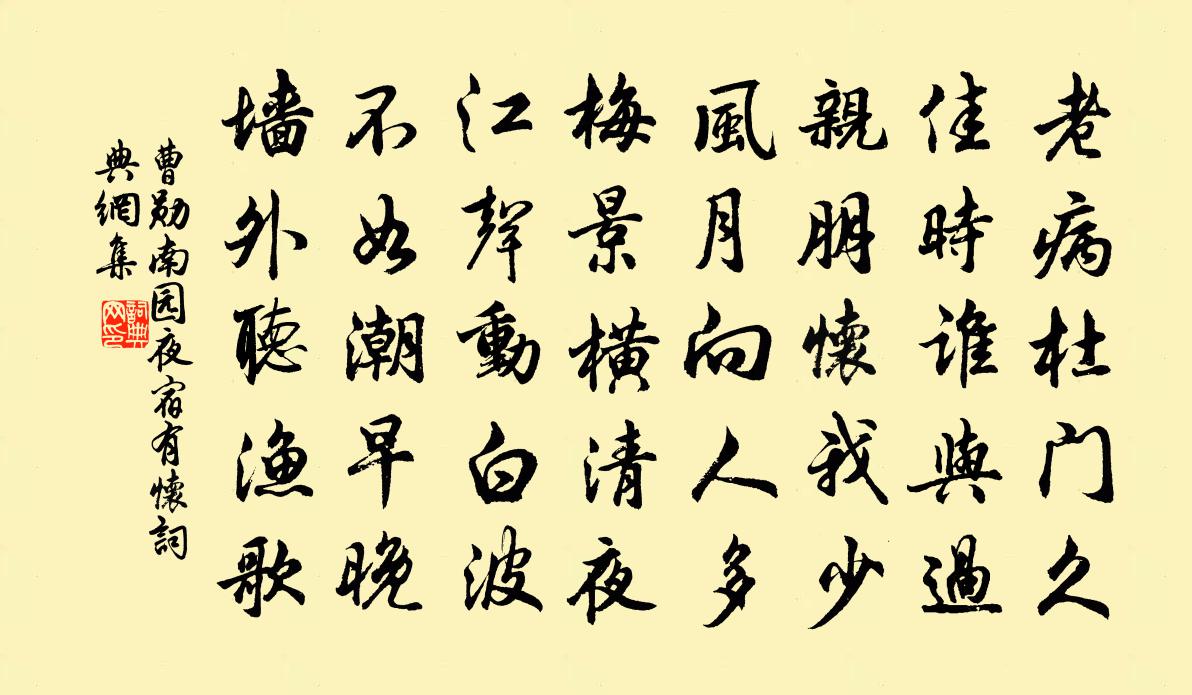 詩詞名句歷史字典書法欣賞書法字典國語詞典說文解字康熙字典古漢語字典標 題 作 者 詩 句 南園夜宿有懷作者:曹勛 朝代:宋代南園夜宿有懷原文老病杜門久,佳時誰與過。親朋懷我少,風月向人多。梅景橫清夜,江聲動白波。不如潮早晚,牆外聽漁歌。詩詞問答問:南園夜宿有懷的作者是誰?答:曹勛問:南園夜宿有懷寫於哪個朝代?答:宋代曹勛南園夜宿有懷書法欣賞南園夜宿有懷書法作品詩詞推薦次韻王誨夜坐蘇軾〔宋代〕愛君東閣能延客,顧我閒官不計員。策杖頻過如未厭,卜居相近豈辭遷。莫將詩句驚搖落,漸喜樽罍省撲緣。待約冬雪呈太守張嵇仲三首李彌遜〔宋代〕夜氣凝空作暮寒,平時積雪欲藏山。定知連臘連三白,已喜先春見一斑。神力巧將人意改,物華陰逐歲功還。憂民壽曾漕徐璣〔宋代〕洪波混浩深無底,分作江河合成海。由來分合必有源,一點清澄元不改。皇家德澤在人深,人心已洽天眷臨。愛產飽食陸游〔宋代〕飽食無功媿汗青,燈前顧影嘆伶俜。馬衰猶養疑知路,龜久當捐為不靈。腰下徒夸綬若若,鏡中何止發星星。石帆聞語十方璉長老梅堯臣〔宋代〕舊居廬岳寺,新化給孤園。還享國人供,應無塵事喧。有來聽喻筏,一悟見吹幡。不憶爐峰下,臨溪看飲猿。次韻趙資道秋夜聞角鄭俠〔宋代〕蕭縈秋城五鼓前,月臨殘夢正團圓。彤樓一曲梅花落,玉枕誰家繡帶連。歌酒梁園人散後,弓刀秦戍雁南天。一般宋中耿湋〔唐代〕百戰無軍食,孤城陷虜塵。為傷多易子,翻吊淺為臣。漫漫東流水,悠悠南陌人。空思前事往,向曉淚沾巾。【雙調】湘妃怨_武夷山中落張可久〔元代〕武夷山中落花流水出桃源,暖翠晴雲滿藥田。流金古像開香殿,步虛聲未遠,鶴飛來認得神仙。傍草漫山徑,幽花桃源章碣〔唐代〕絕壁相欹是洞門,昔人從此入仙源。數株花下逢珠翠,半曲歌中老子孫。別後自疑園吏夢,歸來誰信釣翁言。山前排悶陸游〔宋代〕棄官謂逍遙,勞苦殊未既。荒疇須墾闢,破屋久塗塈。疾深藥難求,食盡谷暴貴。安能作經營,但覺睡有味。秋高會昌元年春五絕句。勸夢得酒白居易〔唐代〕誰人功畫麒麟閣,何客新投魑魅鄉。兩處榮枯君莫問,殘春更醉兩三場。野意陸游〔宋代〕久忝明恩返故鄉,全家衣食出耕桑。詩才適意寧求好?醉即成眠不暇狂。小雨荷鉏分藥品,乍涼扶杖看優場。此身燭影搖紅 淮南故將軍家有歌妓,才容自許,虞集〔元代〕願一見公,竟不及見而卒。客有為以賦此曲者雪映虛檐,夢魂正繞陽台近。朝來誰為護重籠,雲臥衣裳冷。應念蘭浣溪沙·傾國傾城恨有餘薛昭蘊〔五代〕傾國傾城恨有餘,幾多紅淚泣姑蘇,倚風凝睇雪肌膚。吳主山河空落日,越王宮殿半平蕪,藕花菱蔓滿重湖。腸李商隱〔唐代〕有懷非惜恨,不奈寸腸何。即席回彌久,前時斷固多。熱應翻急燒,冷欲徹微波。隔樹澌澌雨,通池點點荷。倦程百丈山李忱〔唐代〕大雄真跡枕危巒,梵宇層樓聳萬般。日月每從肩上過,山河長在掌中看。仙峰不間三春秀,靈境何時六月寒。更有西江月李之儀〔宋代〕宿雲收盡,纖塵不警,萬里銀河低掛。清冥風露不勝寒,無計學、雙鸞並駕。玉徽聲斷,寶釵香遠,空賦紅綾小砑袁居士輓詞林季仲〔宋代〕君看袁居士,蒼然松柏姿。生涯一樽酒,事業五言詩。去跨月邊鶴,空餘床下龜。江村相送處,尚憶杖過眉。幸蜀西至劍門李隆基〔唐代〕劍閣橫雲峻,鑾輿出狩回。翠屏千仞合,丹嶂五丁開。灌木縈旗轉,仙雲拂馬來。乘時方在德,嗟爾勒銘才。吊萬人冢張蠙〔唐代〕兵罷淮邊客路通,亂鴉來去噪寒空。可憐白骨攢孤冢,盡為將軍覓戰功。名句推薦為惡而畏人知,惡中猶有善路;為善而急人知,善處即是惡根。洪應明《菜根譚·概論》 青梅如豆柳如眉,日長蝴蝶飛。歐陽修《阮郎歸·南園春半踏青時》 孔子大聖,不免武叔之毀;子路至賢,猶有伯寮之訴。范曄《後漢書·列傳·列女傳》 書劍時將晚,丘園日已暮。孟浩然《田園作》 人迷洞庭水,雁度瀟湘煙。李白《郢門秋懷》 俯飲一杯酒,仰聆金玉章。韋應物《郡齋雨中與諸文士燕集》 秋色漸將晚,霜信報黃花。葉夢得《水調歌頭·秋色漸將晚》 恃人不如自恃也,明於人之為己者不如己之自為也。韓非及後人《韓非子·外儲說右下》 雲母屏風燭影深,長河漸落曉星沉。李商隱《嫦娥》 我本不棄世,世人自棄我。李白《送蔡山人》