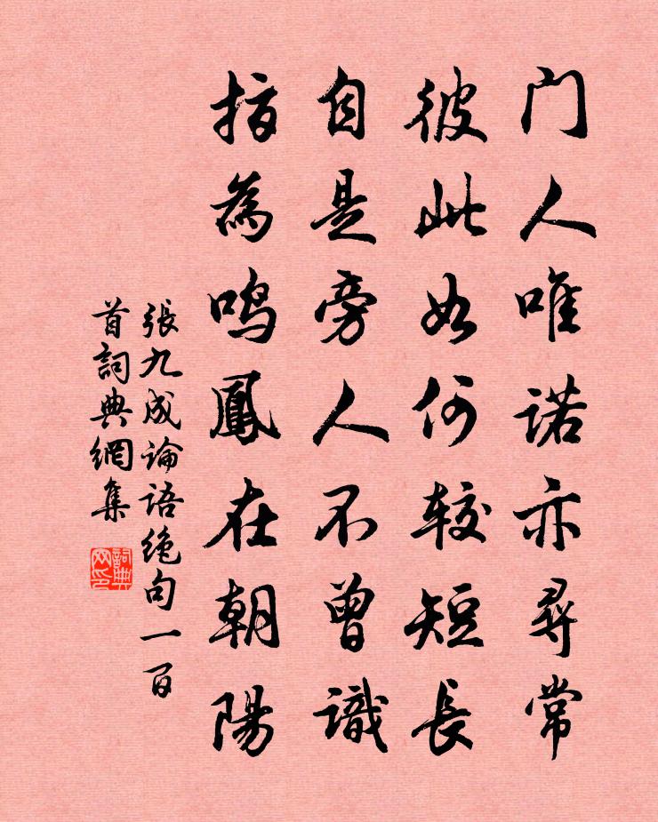 詩詞名句歷史字典書法欣賞書法字典國語詞典說文解字康熙字典古漢語字典標 題 作 者 詩 句 論語絕句一百首作者:張九成 朝代:宋代論語絕句一百首原文門人唯諾亦尋常,彼此如何較短長。自是旁人不曾識,指為鳴鳳在朝陽。詩詞問答問:論語絕句一百首的作者是誰?答:張九成問:論語絕句一百首寫於哪個朝代?答:宋代張九成論語絕句一百首書法欣賞論語絕句一百首書法作品詩詞推薦和令狐相公聞思帝鄉有感劉禹錫〔唐代〕當初造曲者為誰,說得思鄉戀闕時。滄海西頭舊丞相,停杯處分不須吹。天津水聲邵雍〔宋代〕洛水近吾廬,潺湲到枕虛。湍驚九秋後,波急五更初。細為輕風背,豪因驟雨餘。幽人有茲樂,何必待笙竽。滿庭芳 中州樂府吳激〔金代〕誰挽銀河,青冥都洗,故教獨步蒼蟾。露華仙掌,清淚向人沾。畫棟秋風裊裊,飄桂子、時入疏簾。冰壺裡,雲衣滿庭芳 嘆名利馬鈺〔元代〕利惹心猿,名牽意馬,無晝無夜賓士。波波劫劫,來往沒休期。一向貪饕越煞,心勞役、形苦神疲。休迷執,一個步王盧溪韻胡夢昱〔宋代〕瘴地人憂我莫支,人雖危我我何危。元來憂國不怕死,非為捐身要出奇。肯怨江山千里還,幸逢天地一時知。孔光有感蘇麟〔宋代〕近水樓台先得月,向陽花木易為春。有山堂曾幾〔宋代〕江南家家窗,何處無遠岫。唯有謝玄暉,眼中揖其秀。碧溪草堂六言二首劉克莊〔宋代〕素隱非君子志,獨樂豈賢者心。邀陶陸投蓮社,放山王入竹林。穗歌先秦無名〔先秦〕穗乎不得穫。秋風至兮殫零落。風雨之弗殺也。太上之靡弊也。次韻程觀過夜飲靈濟祠下喻良能〔宋代〕松月瀉清影,爐煙凝宿雲。檠燈寒照席,樽酒細論文。清漏轉三鼓,芳杯釂十分。紛勝銀燭里,妙舞盾榴裙。偶吟俞桂〔宋代〕降伏吾心法,無如去外魔。苦吟詩愈拙,著意字猶訛。荏苒青衫舊,消磨白髮多。不才為世棄,徒自詠卷阿。和仁仲春日十絕胡寅〔宋代〕年年綠水送殘紅,不怨東君只怨風。芳草連雲愁更遠,勸君當醉萬花中。次李參政所和五絕句韻因以為詩魏了翁〔宋代〕天如有定開平治,寧患無人安子思。到出手時須卓卓,逢開口處莫期期。和由字韻王之道〔宋代〕當年相望見無由,千里荊襄隔數州。時得新詩夸好句,服膺何止釣槎頭。予招賓和微之韓維〔宋代〕恩予琳宮庇病身,閒中得近酒杯頻。偶成五老追前會,仍喜三公作主賓。歡興到來歌自發,吝情消盡語皆真。時人夏日雜題陸游〔宋代〕衰疾沉綿短鬢疏,淒涼圯上一編書,中原久陷身垂老,付與囊中飽蠹魚。次韻葉碩夫南歸見貽二首李彌遜〔宋代〕飛花無數上衣裾,孤悶須憑酒破除。翻手作雲傷往事,轉頭如夢欲捐書。但知甘苦同薇蕨,不問辛勤有屋廬。後日長思仙侯善淵〔元代〕道心寧。慧燈明。玩寶童兒啟道經。清如佩玉聲。湛然澄。煥然凝。燕靜華池吞玉瑛。還純體自貞。古意呈補闕喬知之 / 古意 / 獨不見沈佺期〔唐代〕盧家少婦鬱金堂,海燕雙棲玳瑁梁。九月寒砧催木葉,十年征戍憶遼陽。白狼河北音書斷,丹鳳城南秋夜長。誰知三過垂虹施樞〔宋代〕秋來三度過垂虹,灝氣橫江水接空。帆影輕浮千幅月,漁竿冷浸一線風。楓初落葉前村近,荷有餘香別浦通。笑拍名句推薦黃河九天上,人鬼瞰重關。元好問《水調歌頭·賦三門津》 謫仙何處,無人伴我白螺杯。黃庭堅《水調歌頭·遊覽》 竹色溪下綠,荷花鏡里香。李白《別儲邕之剡中》 相思一夜梅花發,忽到窗前疑是君。盧仝《有所思》 凍臉有痕皆是血,酸心無恨亦成灰。曹雪芹《詠紅梅花得“梅”字》 為有雲屏無限嬌,鳳城寒盡怕春宵。李商隱《為有》 秋光一片,問蒼蒼桂影,其中何物?趙秉文《大江東去·用東坡先生韻》 獨出前門望野田,月明蕎麥花如雪。白居易《村夜》 君子以同道為朋,小人以同利為朋脫脫《宋史·列傳·卷七十八》 猶傶則疏之,毋使人圖之,猶疏則數之,毋使人曲之管仲《管子·侈靡》