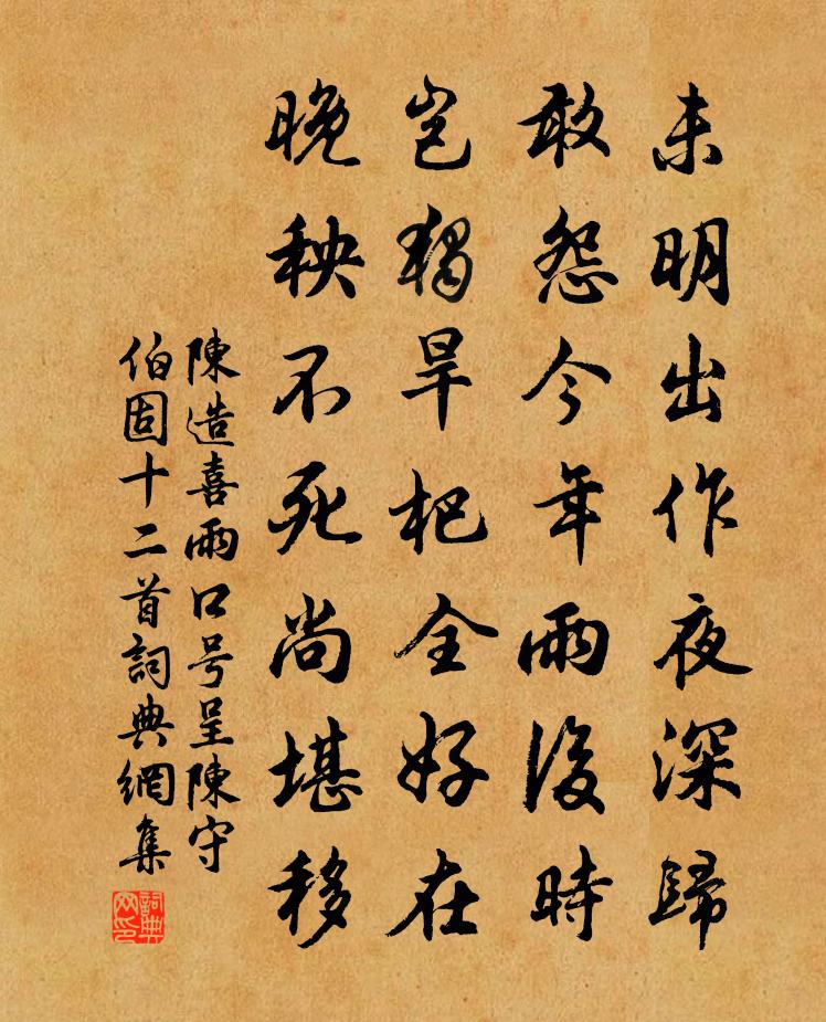 詩詞名句歷史字典書法欣賞書法字典國語詞典說文解字康熙字典古漢語字典標 題 作 者 詩 句 喜雨口號呈陳守伯固十二首作者:陳造 朝代:宋代喜雨口號呈陳守伯固十二首原文未明出作夜深歸,敢怨今年雨後時。豈獨旱杷全好在,晚秧不死尚堪移。詩詞問答問:喜雨口號呈陳守伯固十二首的作者是誰?答:陳造問:喜雨口號呈陳守伯固十二首寫於哪個朝代?答:宋代陳造喜雨口號呈陳守伯固十二首書法欣賞喜雨口號呈陳守伯固十二首書法作品詩詞推薦楊柳枝佚名〔宋代〕萬里長江一帶開,岸邊楊柳幾千栽。錦帆未落西風起,惆悵龍舟去不回。送李將軍赴定州 / 送彭將軍郎士元〔唐代〕雙旌漢飛將,萬里授橫戈。春色臨邊盡,黃雲出塞多。鼓鼙悲絕漠,烽戍隔長河。莫斷陰山路,天驕已請和。七八用喜雪韻四首吳潛〔宋代〕不持寸鐵事應難,何止空空竭兩端。遠麓遮藏山被檄,輕冰裁翦水能官。將梁兔苑瀛洲比,把蔡鶩池台閣看。獨羨巽上人以竹閒自采新茶見贈,酬之以詩柳宗元〔唐代〕芳叢翳湘竹,零露凝清華。復此雪山客,晨朝掇靈芽。蒸煙俯石瀨,咫尺凌丹崖。圓方麗奇色,圭璧無纖瑕。呼兒寶方山二首黃葊〔宋代〕平生不慣俗塵縈,才對南山眼便青。天與詩人張畫本,疏梅翠竹小池亭。時心堂記言五典也載賡前韻以歌之袁甫〔宋代〕習容齋戒適朝初,佩玉鏘鳴謹進趨。大分凜然冠履判,一誠不散若郊雩。秋夜讀書陸游〔宋代〕一雨濯殘熱,秋氣忽已深。青燈照空廊,重露滴高林。危坐讀周易,會我平生心。夜分徐掩卷,閒弄床上琴。簾外黃香梅李龍高〔宋代〕雲葉重重護雪花,玉人隱隱隔窗紗。雖然不帶微酸味,免與時人置齒牙。過玉山東三塘五首楊萬里〔宋代〕赤日中塗綠樹陰,肯將碧繖借行人。片雲忽在樹頭上,失卻勳勞庛得身。頌古四十四首釋法泰〔宋代〕趙州三度吃茶,禾山打鼓難比。休於句下尋求,識取口中滋味。若識得,觀音院裡有彌勒。次韻何學諭送行二首陳造〔宋代〕湖山迎客棹,觸目總宜詩。回首蓬萊近,平生汗漫期。衰年得奇觀,往事屬懷思。何日鴟夷去,扁舟共翠眉。大滌洞天留題彭大辯〔宋代〕松風到曉聲幽微,曲江漏盡天河低。平明遊子出門去,家住葛洪丹井西。漁父趙蕃〔宋代〕自得江湖樂,信無朝市求。扁舟載妻子,沒齒是春秋。見客如成愕,問魚多掉頭。嚴陵疑可亞,范蠡豈其流。減字木蘭花張元乾〔宋代〕客亭小會。可惜無歡容易醉。歸去更闌。細雨鳴窗一夜寒。昏然獨坐。舉世疏狂誰似我。強撥爐煙。也道今宵是上重陽前一日作邵雍〔宋代〕近來多病不堪言,長欲醺醺帶醉眠。新酒乍逢重九日,好花初接小春天。自知命薄臨頭上,不願事多來眼前。唯有秋晚滕岑〔宋代〕槭槭霜風勁,駸駸物象彫。屢遷憐蟋蟀,一敗笑芭蕉。林葉疏逾響,山雲薄易消。雖無遠行役,對此亦何聊。漁父詞二首鄧深〔宋代〕話計平生一釣船,將魚換酒不論錢。夜來醉倒蓬籠底,卻在蘆花宿雁邊。茉莉盧梅坡〔宋代〕京塵湫隘{左蟲右夢}蚊多,彼美繁英玉雪窠。見謂嬌柔能特立,肯憑他物學藤蘿。梅怨吳芾〔宋代〕我與梅花素有期,故應花怨我輕離。巡檐索笑寧無日,少待歸來酒作池。浪淘沙·賦虞美人草辛棄疾〔宋代〕不肯過江東。玉帳匆匆。至今草木憶英雄。唱著虞兮當日曲,便舞春風。兒女此情同。往事朦朧。湘娥竹上淚痕濃名句推薦愁一箭風快,半篙波暖,回頭迢遞便數驛周邦彥《蘭陵王·柳》 凡道字,重且舒。勿急疾,勿模糊。李毓秀《弟子規·信》 懷春情不斷,猶帶相思舊子。吳文英《丁香結·夷則商秋日海棠》 從臣皆半醉,天子正無愁。李商隱《陳後宮》 傍枯林古道,長河飲馬,此意悠悠。張炎《八聲甘州·記玉關踏雪事清游》 寵辱不驚,肝木自寧陳繼儒《小窗幽記·集靈篇》 觀今宜鑑古,無古不成今。佚名《增廣賢文·上集》 舞殿冷袖,風雨淒淒。杜牧《阿房宮賦》 靜言庸違,像恭滔天。佚名《尚書·虞書·堯典》 十二峰頭秋草荒,冷煙寒月過瞿塘。何景明《竹枝詞·十二峰頭秋草荒》