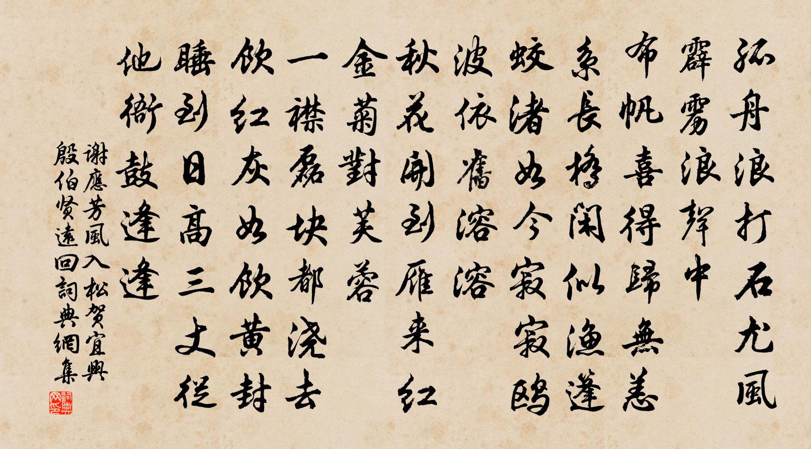 詩詞名句歷史字典書法欣賞書法字典國語詞典說文解字康熙字典古漢語字典標 題 作 者 詩 句 風入松 賀宜興殷伯賢遠回作者:謝應芳 朝代:元代風入松 賀宜興殷伯賢遠回原文孤舟浪打石尤風。霹靂浪聲中。布帆喜得歸無恙,系長橋、閒似漁篷。蛟渚如今寂寂,鷗波依舊溶溶。秋花開到雁來紅。金菊對芙蓉。一襟磊塊都澆去,飲紅灰、如飲黃封。睡到日高三丈,從他衙鼓逢逢。詩詞問答問:風入松 賀宜興殷伯賢遠回的作者是誰?答:謝應芳問:風入松 賀宜興殷伯賢遠回寫於哪個朝代?答:元代問:風入松 賀宜興殷伯賢遠回是什麼體裁?答:詞謝應芳風入松 賀宜興殷伯賢遠回書法欣賞風入松 賀宜興殷伯賢遠回書法作品詩詞推薦秦中初霽獻給事二首儲光羲〔唐代〕渭水收暮雨,處處多新澤。宮苑傍山明,雲林帶天碧。君子聳高駕,英聲邈今昔。鏘佩出中台,彯纓入仙掖。夙心西江月 秋暮,簡友人索酒謝應芳〔元代〕老大無人青眼,淒涼柰爾黃花。秋來杯酌斷流霞。兀對江山如畫。夢裡去尋東老,覺來欲喚西家。山童羞說未能賒賀新郎(壽陳新淥)趙必〔宋代〕壽酒浮萸菊。記年年、重陽嘉節,開尊華屋。綠鬢朱顏春不改,彼美人兮如玉。有錦繡、珠璣滿腹。戶外紅塵飛不履春冰舒元輿〔唐代〕投跡清冰上,凝光動早春。兢兢愁陷履,步步怯移身。鳥照微生水,狐聽或過人。細遷形外影,輕躡鏡中輪。咫尺偈頌一百六十首釋宗杲〔宋代〕四月二十五,久晴忽爾雨。竺士大仙心,東西密相付。這個猶是時節因緣,未是衲僧門下訊息。北山老大蟲,咬殺偈頌十七首釋智愚〔宋代〕二月十五入寂,四月八日復生。虛空開笑口,大地絕人行。攤破醜奴兒/採桑子向滈〔宋代〕自笑好痴迷。只為俺、忒雛兒。近來都得傍人道,帖兒上面,言兒語子,那底都是虛脾。樓上等多時。兩地里、晨興書所見葛紹體〔宋代〕等閒日月任西東,不管霜風著鬢蓬。滿地翻黃銀杏葉,忽驚天地告成功。滿庭芳 冰雪亭題晏子禮馬鈺〔元代〕瑞靄浮浮,祥氛冉冉,捲簾縞夜幽光。清奇峻潔,有類布濃霜。恰似山侗內景,瓊花綻、玉蕊芬芳。瑤瑛結,連城歲除李洪〔宋代〕客里光陰又一年,人情真復似憐蚿。家貧尚有春名酒,才拙安能雪命篇。弱柳經霜半凋落,修篁沐雨更便娟。親交出東城門見牧牛曾豐〔宋代〕出逢春客放牛天,浩嘆微官久自纏。回首未能收白牯,歸家猶可養烏犍。寒食許昌道中寄幕府諸君司馬光〔宋代〕原上煙蕪淡復濃,寂寥佳節思無窮。竹林近水半邊綠,桃樹連村一片紅。盡日解鞍山店雨,晚天回首酒旗風。遙知滄浪煙雨李翔〔宋代〕峰澗煙波翠靄濃,危亭飛聳到晴空。鴛來菡萏紅香里,人在琉璃翠影中。洗出嵐光全是雨,卷回秋暑卻因風。使君二十六日與公擇步松嶺而返趙蕃〔宋代〕青山招我來,松風送我去。白髮頻脫幘,足適欲忘屨。春初更和悅,我亦除疾痼。莫作倥傯歸,茲游已成屢。昭君怨(賣花人)蔣捷〔宋代〕擔子挑春雖小。白白紅紅都好。賣過巷東家。巷西家。簾外一聲聲叫。簾里鴉鬟入報。問道買梅花。買梅花。江上趙崇鉘〔宋代〕清露初生紅蓼秋,爽風先到木蘭舟。釣絲不捲波痕穩,夢入蘆花數白鷗。和叔雪中見過王安石〔宋代〕捐書去寄老山林,無復追緣往事心。忽值故人乘雪興,玉堂前話得重尋。閒居陸游〔宋代〕生計淡無味,終焉樂有餘。灌畦親抱瓮,種秫學拈鋤。趙提荊輓詞樓鑰〔宋代〕客授早登龍,襟期一笑同。門清心似水,論正氣如虹。近問書猶濕,重來跡遂空。無因送丹旐,老淚灑西風。寄李十員外王仲舒〔唐代〕百丈懸泉舊臥龍,欲將肝膽佐時雍。惟愁又入煙霞去,知在廬峰第幾重。名句推薦秋聲萬戶竹,寒色五陵松。李頎《望秦川》 萬里平湖秋色冷,星辰垂影參然。牛希濟《臨江仙·洞庭波浪颭晴天》 但存方寸地,留與子孫耕。馮夢龍《喻世明言·卷二十二》 招魂楚些何嗟及,山鬼暗啼風雨。元好問《摸魚兒·雁丘詞 / 邁陂塘》 燈火萬家城四畔,星河一道水中央。白居易《江樓夕望招客》 皚如山上雪,皎若雲間月。卓文君《白頭吟》 聞誅一夫紂矣,未聞弒君也。孟子《孟子·梁惠王章句下·第八節》 凡知說,有益於理者,為之;無益於理者,舍之。荀子《荀子·儒效》 一片春愁待酒澆。江上舟搖,樓上簾招。蔣捷《一剪梅·舟過吳江》 但信己,不信人,此取敗之由也。王永彬《圍爐夜話·第八五則》