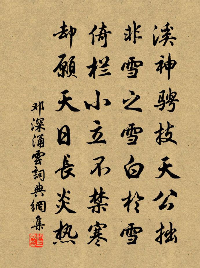 詩詞名句歷史字典書法欣賞書法字典國語詞典說文解字康熙字典古漢語字典標 題 作 者 詩 句 涌雲作者:鄧深 朝代:宋代涌雲原文溪神騁技天公拙,非雪之雪白於雪。倚欄小立不禁寒,卻願天日長炎熱。詩詞問答問:涌雲的作者是誰?答:鄧深問:涌雲寫於哪個朝代?答:宋代鄧深涌雲書法欣賞涌雲書法作品詩詞推薦瓊花蔡戡〔宋代〕平生湖海氣,浪自青雲期。一為蓬萊游,時動泉石思。徒糜太倉粟,飽食終日嬉。屍素亦已甚,勇退夫何疑。直道早朝十絕趙子潚〔宋代〕廿載承恩侍九重,泰階玉燭喜遭逢。嘉禾瑞協當年兆,佇看遠夷貢獻同。送董伯懿歸吉州王安石〔宋代〕我來以喪歸,君至因謫徙。蒼黃憂患中,邂逅遇於此。去年服初除,聽赦相助喜。看君數歸月,但屈兩三指。茫然山居詩釋延壽〔宋代〕青山一坐萬緣休,努力應須與古儔。散誕襟懷因絕趣,消疏活計為無求。花明小砌和春月,松暗前軒帶雨秋。景像江城子 寄王元輔馬需庵〔元代〕百年浮世幾人閒。說求官。近長安。不道長安,行路古來難。白璧明珠天地里,人不識,暗中看。自憐東野一生寒八聲甘州(偶書)魏了翁〔宋代〕被西風吹不斷新愁。吾歸欲安歸。望秦雲蒼憺,蜀山渺渀,楚澤平漪。鴻雁依人正急,不奈稻粱稀。獨立蒼茫外,絳都春(夷則羽,俗名仙呂調為郭清華內子壽)吳文英〔宋代〕香深霧暖。正人在、錦瑟華年深院。舊日漢宮,分得紅蘭滋吳苑。臨池羞落梅花片。弄水月、初勻妝面。紫煙籠處和郡倅陳校書祈雨韻劉宰〔宋代〕麥隴收黃槁,秧田欠綠滋。三時猶好在,一雨未為遲。精意能先物,神明敢後期。邦人孚至意,可但不能欺。子瞻去歲春侍立邇英子由秋冬間相繼入侍作詩黃庭堅〔宋代〕封掌絲綸罷記言,職親黃屋傍堯軒。雁行飛上猶回首,不受青雲富貴吞。夜宿閔灘下王炎〔宋代〕歙江兩岸山立壁,一水潭潭浮紺碧。嵌空老石出中流,觸碎玻璃成沸白。灘高水落定難行,莫雨淋浪新漲生。三更改作池亭子安弟賦二絕因和韻程公許〔宋代〕榿隴低風呈遠碧,稻勝分溜溢方池。簿書課辦心如不,獨岸烏紗琢詩。詠玉朱灣〔唐代〕歌玉屢招疑,終朝省復思。既哀黃鳥興,還復白圭詩。請益先求友,將行必擇師。誰知不鳴者,獨下董生帷。攤破浣溪沙·菡萏香銷李璟〔唐代〕菡萏香銷翠葉殘,西風愁起綠波間。還與韶光共憔悴,不堪看。細雨夢回雞塞遠,小樓吹徹玉笙寒。多少淚珠無限昭君辭沈約〔南北朝〕朝發披香殿,夕濟汾陰河。於茲懷九逝,自此斂雙蛾。沾妝如湛露,繞臆狀流波。日見奔沙起,稍覺轉蓬多。朔風奉和長兄歲晏抒懷宋祁〔宋代〕天暮雪雲繁,相將客兔園。老從星發見,歲伴日車翻。別葉晴猶舞,征鴻暝更軒。事君纔寸祿,知我是空言。競進宋江三十六贊龔開〔宋代〕昔樊將軍,鴻門直撞。斗酒肉肩,其言甚壯。秋蕊香(重陽)曹勛〔宋代〕秋色宮庭,黃花禁御,西風乍透羅衣。龍山意漸爽,瑤砌葉初飛。喜天宇、明潔曉晴時。翠樓都捲簾帷。奉宴賞,短歌曲白居易〔唐代〕世人求富貴,多為奉嗜欲。盛衰不自由,得失常相逐。問君少年日,苦學將乾祿。負笈塵中游,抱書雪前讀。布衾江南五首劉克莊〔宋代〕宣勸猶疑鴆,龍顏笑引觴。絡鞍奉明主,執梃長降王。感舊歌者戴表元〔宋代〕牡丹紅豆艷春天,檀板朱絲錦色箋。頭白江南一尊酒,無人知是李龜年。名句推薦獨上江樓思渺然,月光如水水如天。趙嘏《江樓舊感》 華表月明歸夜鶴,嘆當時、花竹今如此吳文英《金縷歌·陪履齋先生滄浪看梅》 漸行漸遠漸無書,水闊魚沉何處問。歐陽修《玉樓春·別後不知君遠近》 落日胡塵未斷,西風塞馬空肥。辛棄疾《木蘭花慢·席上送張仲固帥興元》 爾曹身與名俱滅,不廢江河萬古流。杜甫《戲為六絕句·其二》 荷葉五寸荷花嬌,貼波不礙畫船搖;石濤《荷花》 春閨月,紅袖不須啼。元好問《江月晃重山·初到嵩山時作》 和戎詔下十五年,將軍不戰空臨邊。陸游《關山月》 吹笳暮歸野帳,雪壓青氈。陸游《漢宮春·初自南鄭來成都作》 清水出芙蓉,天然去雕飾。李白《經亂離後天恩流夜郎憶舊遊書懷贈江夏韋太守良宰》