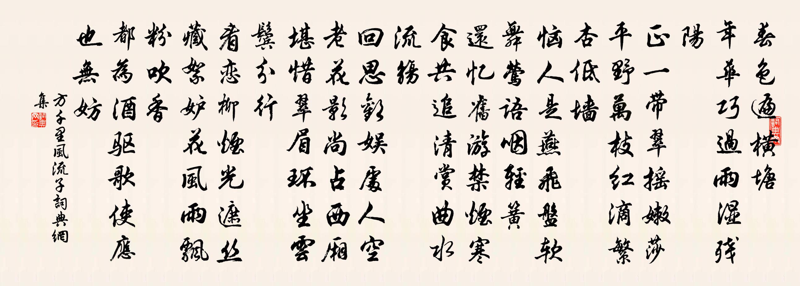 詩詞名句歷史字典書法欣賞書法字典國語詞典說文解字康熙字典古漢語字典標 題 作 者 詩 句 風流子作者:方千里 朝代:宋代風流子原文春色遍橫塘。年華巧、過雨濕殘陽。正一帶翠搖,嫩莎平野,萬枝紅滴,繁杏低牆。惱人是,燕飛盤軟舞,鶯語咽輕簧。還憶舊遊,禁菸寒食,共追清賞,曲水流觴。回思歡娛處,人空老,花影尚占西廂。堪惜翠眉環坐,雲鬢分行。看戀柳煙光,遮絲藏絮,妒花風雨,飄粉吹香。都為酒驅歌使,應也無妨。詩詞問答問:風流子的作者是誰?答:方千里問:風流子寫於哪個朝代?答:宋代問:風流子是什麼體裁?答:詞方千里風流子書法欣賞風流子書法作品詩詞推薦南鄉子 寶玄堂偶得尹志平〔元代〕本 * 疏慵。不厭無名不厭窮。落魄隨緣無所礙,心通。觀透人間事事空。得失本來同。動靜何勞問吉凶。兀兀前感梅屬周文顯二首趙蕃〔宋代〕玉薄冰輕不自持,可能當此惡風吹。要適此物堅牢質,不比渠儂耎脆姿。六十五春寒吟七首方回〔宋代〕性癖耽吟本不工,平生竟復坐詩空。狀頭浪說三千字,舉手行為七十翁。夜永自憐燈是伴,春寒最苦酒難中。王侯雨中宋伯仁〔宋代〕終日翻盆雨,池亭晚更涼。對琴思古意,釃酒惜韶光。綠漲便鷗懶,殘花笑蝶忙。高田皆可插,好與報君王。寄信道陳與義〔宋代〕衡山未見意如飛,浩蕩風帆不可期。卻憶府中三語掾,空吟江上四愁詩。高灘落日光零亂,遠岸叢梅雪陸離。剩欲晚步少微閣樓鑰〔宋代〕落山謝虛閣,橫琴相對閒。片雲將急雨,一笑失前山。偈頌九十三首釋梵琮〔宋代〕孤迥迥一塵不立,清寥寥目斷千峰。白雲片片,流水重重。驀忽和盤掇轉,卻要喚西作東。生鐵團上,迸開罅縫。旅次衡陽裴說〔唐代〕欲往幾經年,今來意豁然。江風長借客,岳雨不因天。戲鷺飛輕雪,驚鴻叫亂煙。晚秋紅藕里,十宿寄漁船。送陳霆之官連州劉克莊〔宋代〕郡接湖南境,孤城若個邊。茆寮愁問宿,峽石善驚船。官小無迎吏,詩工有續編。古人高妙處,不過覽山川。關山雪宋構〔宋代〕關山雪,關山雪,遠接洮西千裏白。試登隴首瞰八荒,表里高低都一色。日高融液流車轍,凍作堅冰敲不裂。早晚宿嚴維宅簡章八元(一作宿嚴秘書宅)清江〔唐代〕佳期曾不遠,甲第即南鄰。惠愛偏相及,經過豈厭頻。秋寒林葉動,夕霽月華新。莫話羈棲事,平原是主人。明道親享先農十首佚名〔宋代〕稼政之本,民食惟天。甫田兆幾,后稷其先。靈壇既祀,黛耜攸虔。乃聖能享,億萬斯年。野望葉茵〔宋代〕白水沿堤護綠苗,雞鳴犬臥柳邊橋。數家雖不成村落,一夢何曾到市朝。李氏池上賀鑄〔宋代〕湖外西風吹雨絲,半隨楊柳拂漣漪。女郎偷折藕花去,沙上鴛鴦睡不知。故西台侍郎上官公輓歌李乂〔唐代〕宇內文儒重,朝端禮命優。立言多啟沃,論道盛謀猷。顧日琴安在,術星劍不留。徒懷東武襚,更掩北原丘。梅二首李處權〔宋代〕可憐映竹深深見,似為催詩特特開。湖上林逋今老矣,揚州何遜未歸來。前村欲雨鳩呼婦,斷壠收晴雉應媒。幻境摸魚兒 次韻謝張古愚(原作謝張思古據景元本改)程文海〔元代〕漢江東、舊家文獻,風流意氣相許。金台早集荊山鳳,聲振一庭鷺。春幾處。須信道、甘棠樹樹含清露。平湖古正月十九日四更起讀朱文公年譜至天大明賦十方回〔宋代〕草制無知傅伯壽,問詩不答陳傅良。王淮林栗胡紘輩,仲尼日月曾可傷。題君山愛松軒李呂〔宋代〕青青窗外松,高下如羽蓋。不論霜雪晨,屹立風雨外。深根養茯苓,千歲坐可待。世情苦炎涼,一日幾變態。此物壽教授李劉〔宋代〕襟懷錦繡富多文,人物冰壺絕點塵。太華昨宵方誕呂,姑蘇今日恰生申。堂萱呈瑞年年綠,壇杏逢春日日新。更為名句推薦漸老念鄉國,先歸獨羨君。簡長《送僧南歸》 不自見,故明;不自是,故彰;不自伐,故有功;不自矜,故長。夫唯不爭,故天下莫能與之爭。老子《老子·道經·第二十二章》 岸柳垂金線,雨晴鶯百囀。顧敻《醉公子·岸柳垂金線》 我也不登天子船,我也不上長安眠。唐寅《把酒對月歌》 黃霧漲天雪晦冥,黑雲拂地風膻腥沈約《昭君辭》 斜陽外,寒鴉萬點,流水繞孤村。秦觀《滿庭芳·山抹微雲》 聲一無聽,物一無文左丘明《國語·鄭語·史伯為桓公論興衰》 君子藏器於身,待時而動佚名《易傳·繫辭傳下·第五章》 就解佩旗亭,故人相遇。吳文英《掃花游·西湖寒食》 中歲頗好道,晚家南山陲王維《終南別業》