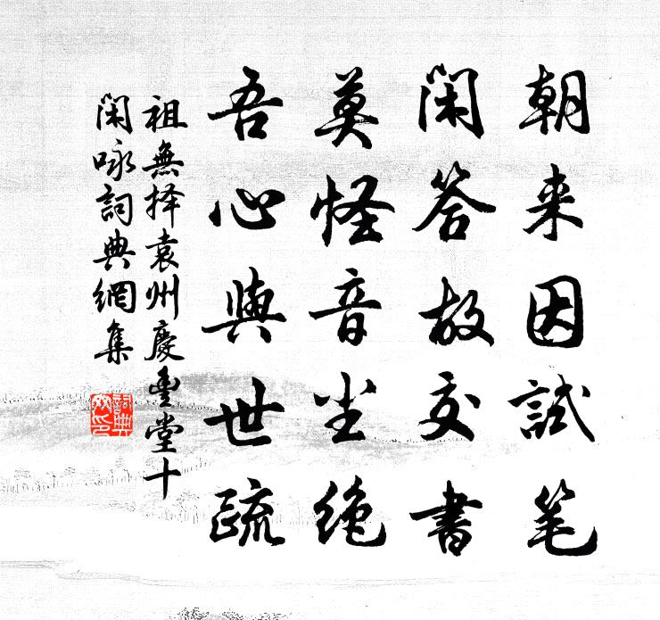詩詞名句歷史字典書法欣賞書法字典國語詞典說文解字康熙字典古漢語字典標 題 作 者 詩 句 袁州慶豐堂十閒詠作者:祖無擇 朝代:宋代袁州慶豐堂十閒詠原文朝來因試筆,閒答故交書。莫怪音塵絕,吾心與世疏。詩詞問答問:袁州慶豐堂十閒詠的作者是誰?答:祖無擇問:袁州慶豐堂十閒詠寫於哪個朝代?答:宋代祖無擇袁州慶豐堂十閒詠書法欣賞袁州慶豐堂十閒詠書法作品詩詞推薦仙都山胡份〔宋代〕鳥道盤空上,松根抱石生。羽人分兩舍,雞犬自聞聲。報恩寺南池聯句陸龜蒙〔唐代〕古岸涵碧落,虛軒明素波。 ——陸龜蒙坐來魚陣變,吟久菊□多。 ——皮日休秋草分杉露,危橋下竹坡。 —褒信新蔡兩令言飛蝗所過有大鳥如鸛數千為群劉敞〔宋代〕廣州奇禽鴻鵠群,勁羽長翼飛蔽雲。嘯儔命侶自共職,飲水棲林余不聞。今年飛蝗起東國,所過田疇畏蠶食。神假壽陽罷郡日有詩十首與追懷…兼紀瑞物物。初出淝口入淮李紳〔唐代〕東風百里雪初晴,淝口冰開好濯纓。野老擁途知意重,病夫拋郡喜身輕。人心莫厭如弦直,淮水長憐似鏡清。回首王君瑞秘丞同理青社宋祁〔宋代〕詔押平明出未央,便隨公府汎牙檣。即時趨坐多留幘,幾夕登樓共踞床。勝國遺官沉雪霧,從軍舊沼認蓮房。翹材題友人山花方乾〔唐代〕平明方發盡,為待好風吹。不見移來日,先愁落去時。濃香薰疊葉,繁朵壓卑枝。坐看皆終夕,游蜂似有期。送酒與呂令答所示詩文同〔宋代〕君無彭澤五十畝,我有謫仙三百杯。聞道山中足春意,滿壺聊為撥新醅。送曹晉伯令尹之官真德秀〔宋代〕此邑吾鄰境,嘗聞嘆恨深。有田盡增稅,無楮可為衾。原布中和政,毋懷忿疾心。歸田當有日,好聽宓生琴。頌古四十四首釋法泰〔宋代〕嵯峨萬仞是曹山,氣岸雄雄坐祖關。橫按鏌鋣全正令,太平寰宇斬痴頑。滿庭芳 李社長壽姬翼〔元代〕桃蘊蒸紅,杏開微白,仲春風物宜人。冥疏九葉,隴右降天真。應瑞蔥蔥佳氣,寶猊炷、劫外濃薰。鳴金玉,琅琅清渭八景指崖一覽何子舉〔宋代〕指崖屹立鎮山川,萬丈巍巍勢插天。風日雙清時有限,乾坤一覽景無邊。東西峴丹青與獻,南北群峰紫翠邊。我欲如夢令·昨夜雨疏風驟李清照〔宋代〕昨夜雨疏風驟,濃睡不消殘酒,試問捲簾人,卻道海棠依舊。知否,知否,應是綠肥紅瘦。頌古十一首釋普濟〔宋代〕臘月火燒山,胡僧入漢關。一頭卷螺發,兩耳帶金環。通填致政姚君輓詩魏了翁〔宋代〕一生官偪仄,幾處獄平反。夜雨滴歸思,凱風唳淚痕。竟令駒入夢,莫盡桂銷冤。點檢慈恩舊,秋空幾斷魂。西林寺劉克莊〔宋代〕將謂如廬阜,因迂數里行。問俱無古蹟,來等慕虛名。借榻眠難熟,逢碑眼暫明。殘僧逃似鼠,難結社中盟。送夔門丁帥赴召崔與之〔宋代〕議論方前席,功名早上坡。去帆瓜蔓水,遺愛生枝歌。同志晨星少,孤愁暮雨多。倚風窮望眼,碧色涉平莎。報謁徐大雅仁因以題贈三首趙蕃〔宋代〕好在東都孺子孫,壯年曾謁舍人門。只今此道同終少,君獨深藏恥自論。十月十四夜三鼓壺天月佳甚以詩招道祖葛立方〔宋代〕壺天有勝事,玉宇淨纖埃。有意嚼復嚼,今宵來不來。山公須酩酊。令名莫咍台。明月隔溪共,只今腸九回。與鮮于庶子自梓州成都少尹自褒城同行至利州道中作岑參〔唐代〕剖竹向西蜀,岷峨眇天涯。空深北闕戀,豈憚南路賒。前日登七盤,曠然見三巴。漢水出嶓冢,梁山控褒斜。棧道己亥十月送成父弟絜兩戶幼累歸玉山五首趙蕃〔宋代〕已辦知津送去舟,重臨快閣亦悠悠。黃知橘柚江行好,此去況經龍霧洲。名句推薦海棠不惜胭脂色,獨立濛濛細雨中。陳與義《春寒》 瀉水置平地,各自東西南北流。鮑照《擬行路難十八首》 涼風起天末,君子意如何。杜甫《天末懷李白》 沾衣欲濕杏花雨,吹面不寒楊柳風。志南《絕句》 仁暴者,皆亡國者也。韓非及後人《韓非子·八說》 客子光陰詩卷里,杏花訊息雨聲中。陳與義《懷天經智老因訪之》 揚子江頭楊柳春,楊花愁殺渡江人。鄭谷《淮上與友人別》 孤客傷逝湍,徒旅苦奔峭。謝靈運《七里瀨》 事業文章隨身銷毀,而精神萬古如新洪應明《菜根譚·概論》 守經事而不知其宜,遭變事而不知其權。司馬遷《史記·太史公自序》