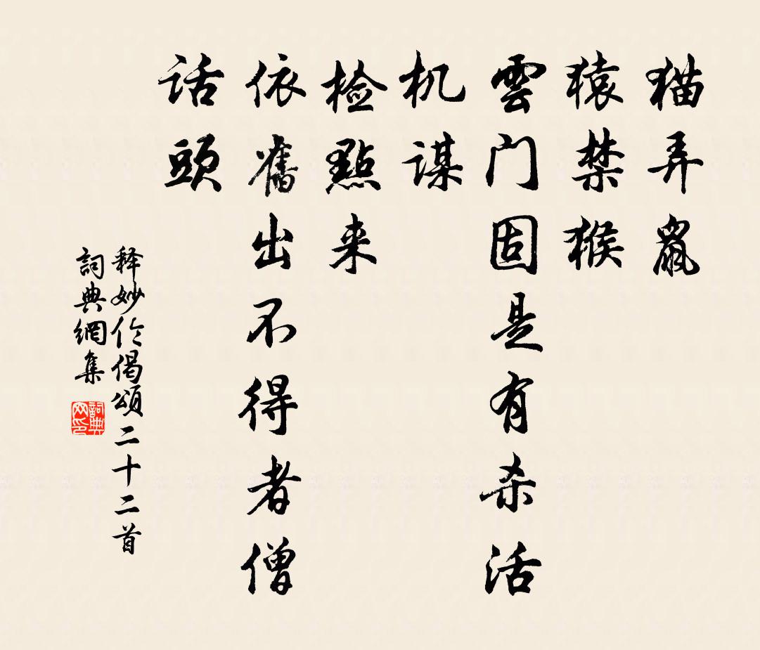 詩詞名句歷史字典書法欣賞書法字典國語詞典說文解字康熙字典古漢語字典標 題 作 者 詩 句 偈頌二十二首作者:釋妙倫 朝代:宋代偈頌二十二首原文貓弄鼠,猿禁猴,雲門固是有殺活機謀。檢點來。依舊出不得者僧話頭。詩詞問答問:偈頌二十二首的作者是誰?答:釋妙倫問:偈頌二十二首寫於哪個朝代?答:宋代釋妙倫偈頌二十二首書法欣賞偈頌二十二首書法作品詩詞推薦漁家傲梵琦〔元代〕聽說西方無量樂。琉璃田地金城郭。翡翠鮮明珠磊落。蓮披萼。幾多青赤並黃白。大士聲聞隨所適。天華爛漫沾衣次韻信倅練定夢雪中過王侍郎晁補之〔宋代〕夢覓毗耶看雨華,玉城銀澗過縈斜。乍疑霧廓千峰障,未覺雷驚萬谷芽。碧落清談元物外,金閨高興共天涯。寒雞有會而作陶淵明〔魏晉〕弱年逢家乏,老至更長飢。菽麥實所羨,孰敢慕甘肥!惄如亞九飯,當暑厭寒衣。歲月將欲暮,如何辛苦悲。常浣溪沙趙必〔宋代〕只為相思怕上樓。離鶯一操恨悠悠。十二翠屏煙篆冷,曉窗秋。繡線未拈心已懶,花箋欲寄寫還羞。懊恨郎邊無個扇子詩李石〔宋代〕蜂蜜新房日課,燕泥舊壘年勞。睡起香爐圓覺,醉中山芋離騷。登樓有感倪龍輔〔宋代〕好趁西風理釣舟,半生書劍兩悠悠。憑高有恨無人識,空負關河萬里秋。歲除思歸周弼〔宋代〕春風冰斷千尺,曉霽雲開百重。何處溪橋爭渡,誰家山寺聞鍾。定海甲寅口號七首陳造〔宋代〕長官清苦舊傳聞,檢放禾苗近四分。畢竟不緣胥吏手,旱頭科斂枉紛紜。奉餞萬安贊府兄長之官姚勉〔宋代〕吾族年來亦自奇,兩年兩度報瓜時。班行笑我難安腳,州縣輸君省皺眉。學不濟時非有用, * 及物盡堪為。山林秋雨未已客懷不佳夜誦少陵遣興詩至生涯能幾章甫〔宋代〕今晨氣候佳,萬里來西風。舉頭看浮雲,已歸天漢東。野人還負暄。帝澤流無窮。心隨鴻雁飛,不離霄壤中。秋夜有懷二首羅公升〔宋代〕稍稍暝色添,悠悠遠山縮。秋聲何方起,餘韻入修竹。興來不知痴,橋外一筇獨。燈光小市鬧,人語深院肅。惟應謝朱宰借船陳造〔宋代〕書生祿遫空自憐,三年官滿囊無錢。身如絆驥心千里,安得一舸西風前。令君磊落濟川手,留滯亦憐窮獨叟。大舟戀梅趙時韶〔宋代〕月下敲推到夜深,情知未稱惜花心。玉兒已死雲英嫁,誰唱梅詞伴我吟。和李都官春日見寄葛密〔宋代〕聞說年來絕世榮,更將高節傲時明。詩腴偏得味中味,琴的靜彈聲外聲。宴榭日長花影駐,春池風細水紋生。相望送劉燁大著移任龍門知縣魏野〔宋代〕天上書先夢裡傳,到施仁政減春寒。尚虛鰲嶺神仙任,暫作龍門父母官。愁悶豈惟增假寐,笑談直恐絕真歡。不緣送師道弟赴官靖州陳宓〔宋代〕去佐湖陰郡,炎征六十程。東南疆尚狹,朝暮騎仍輕。民困恩宜厚,蠻驕隙易生。廉勤先訓在,遲汝振家聲。贈日者雲谷俞喜釋文珦〔宋代〕十載唯耕谷口雲,倚鋤時復看天文。世間貴賤君皆識,卻恐嚇無人解識君客身猶臥玲瓏石,鄉夢長懸岝崿山。詹尹南堂雜興陸游〔宋代〕奔走當年一念差,歸休別覺是生涯。茆檐喚客家常飯,竹院隨僧自在茶。禪欠遍參寧得髓?詩緣獨學不名家。如今次南陽陳與義〔宋代〕今日東北雲,景氣何佳哉。我馬且忽驅,當有吉語來。春寒欺客子,滿意旗下杯。百年耳頻熱,萬事首不回。臥龍性情吟邵雍〔宋代〕君子任性,小人任情。任性則近,任情則遠。名句推薦人心不足蛇吞象。馮夢龍《警世通言·卷二十五》 愁中看、好天良夜,知道盡成悲咽。納蘭性德《琵琶仙·中秋》 天迥雲垂草,江空雪覆沙劉基《古戍》 財不患其不得,患財得,而不能善用其財王永彬《圍爐夜話·第四四則》 行人夜宿金陵渚,試聽沙邊有雁聲。李頎《送劉昱》 石卵不敵。蛇龍不鬥。馮夢龍《警世通言·卷九》 璇室群酣夜,璜溪獨釣時。劉基《題太公釣渭圖》 故國山川,故園心眼,還似王粲登樓。周密《一萼紅·登蓬萊閣有感》 單于北望拂雲堆,殺馬登壇祭幾回。王之渙《涼州詞二首》 重陽佳節意休休,與客攜壺共上樓。姜塘《摘星樓九日登臨》