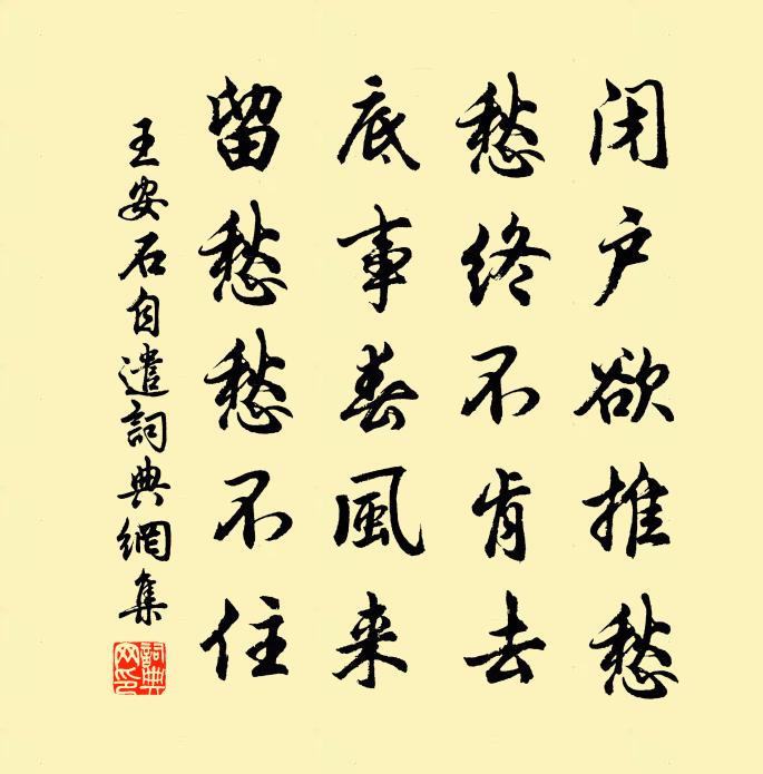 詩詞名句歷史字典書法欣賞書法字典國語詞典說文解字康熙字典古漢語字典標 題 作 者 詩 句 自遣作者:王安石 朝代:宋代自遣原文閉戶欲推愁,愁終不肯去。底事春風來,留愁愁不住。詩詞問答問:自遣的作者是誰?答:王安石問:自遣寫於哪個朝代?答:宋代問:王安石的名句有哪些?答:王安石名句大全王安石自遣書法欣賞自遣書法作品詩詞推薦偈頌二十四首釋智遇〔宋代〕春入湖山,先放花明。御苑人歸上國,南山鶴唳青公。壯皇都人傑地靈,窺紫府洞天風月。戛金釵佚名〔宋代〕梅蕊破初寒,春來何太早。輕傅粉、向人先笑。比並年時較些少。愁底事,十分清瘦了。影靜野塘空,香寒霜月曉對竹鄭剛中〔宋代〕勞生分素定,大患天所辱。時於法埃中,許我對修竹。此君風味高,瘦骨不生肉。煙梢墮新籜,當面變蒼玉。風邀參寥泉董嗣杲〔宋代〕湖曲春風正禁菸,試茶味此石間泉。坡仙忽憶黃州夢,潛老初拈智果禪。幾客醉游三月里,一聯詩兆七年前。題梁成都書事陸游〔宋代〕劍南山水盡清暉,濯錦江邊天下稀。煙柳不遮樓角斷,風花時傍馬頭飛。芼羹筍似稽山美,斫膾魚如笠澤肥。客報紀時華岳〔宋代〕古今多少好英雄,未必奸邪未必忠。上黨鼎膏流地白,長平坑血濺天紅。三邊傳檄兵雖息,二榷開場貨未通。更願送趙子直貳卿帥三山樓鑰〔宋代〕一蹴登從班,人胡謂公遲。建牙帥七閩,人胡為公疑,公今第一流,志操古與期。兩州有遺愛,江西憺霜威。重來和游堯臣出郊二首王炎〔宋代〕崎嶇深谷與崇岡,王事有期行李忙。玉佩泉鳴清醉耳,劍鋩山峭割愁腸。鳥鳴花發牛華改,雨暗雲昏客路長。且喜見劉後村先生吳龍翰〔宋代〕雪碗冰甌淬筆鋒,篇篇琢出玉玲瓏。鶴鳴遠岫千林曉,鯨展洪濤萬里雄。暮雪寒梅吟思外,春風芳草夢魂中。詩瓢贈樂間居士方鳳〔宋代〕市遠塵囂隔,神閒幽事並。埽花憐竹影,煮茗訝松聲。月與詩如約,琴將鶴互賡。冷香生碧落,秋夢不勝清。大閱回馬口號崔敦禮〔宋代〕前驅小隊立元戎,一點台星喜氣濃。凱奏歸來鈴閣靜,精神端已折遐沖。淮南聞雁呈何復初同年黎廷瑞〔宋代〕孤棹翩翩北渡淮,相逢一笑意悠哉。關河萬里忽秋晚,風雨五更聞雁來。好夢驚回頻輾轉,壯心平盡復崔嵬。吾生頌古二十五首釋崇岳〔宋代〕大梅梅子熟,龐老已先知。正眼驗深要,相逢拍手歸。尋易尊師不遇陳嶰〔唐代〕爛熳紅霞光照衣,苔封白石路微微。華陽洞裡何人在,落盡松花不見歸。送杭州使君蘇內相先生某用先生舊詩方丈仙人李廌〔宋代〕小人雖嗜學,歲月空屢勤。同門盡鴛鸞,登瀛校書芸。嗟余老西河,索居久離群。從龍從上下,愧彼油油雲。飲酒二十首同蘇翰林先生次韻追和陶淵明十二晁補之〔宋代〕東漢有兩士,才智炫一時。三公往訪事,臥痾亦見辭。偉明獨不然,小道安取茲。斯人似水鏡,與世破昏疑。憂國山居晚眺贈王道士王勃〔唐代〕金壇疏俗宇,玉洞侶仙群。花枝棲晚露,峰葉度晴雲。斜照移山影,回沙擁籀文。琴尊方待興,竹樹已迎曛。塞上杜荀鶴〔唐代〕草白河冰合,蕃戎出掠頻。戍樓三號火,探馬一條塵。戰士風霜老,將軍雨露新。封侯不由此,何以慰征人?景祐饗先農五首佚名〔宋代〕在昔神逐,首茲播殖。無有污萊,盡為稼檣。乃粒斯民,實惟帝力。嘉薦令芳,儜瞻來格。柳邊杜甫〔唐代〕只道梅花發,那知柳亦新。枝枝總到地,葉葉自開春。紫燕時翻翼,黃鸝不露身。漢南應老盡,霸上遠愁人。名句推薦君行四月草萋萋,柳花桃花半委泥。納蘭性德《送蓀友》 聞名不如見面,見面勝似聞名。施耐庵《水滸傳·第三回》 九日黃花酒,登高會昔聞。岑參《奉陪封大夫九日登高》 待到山花爛漫時,她在叢中笑。 * 《卜運算元·詠梅》 暗暗淡淡紫,融融冶冶黃。李商隱《菊花》 洞門高閣靄餘輝,桃李陰陰柳絮飛。王維《酬郭給事 / 贈郭給事》 山邊幽谷水邊村,曾被疏花斷客魂。張嵲《墨梅》 慈母倚門情,遊子行路苦。王冕《墨萱圖·其一》 忽然更作漁陽摻,黃雲蕭條白日暗。李頎《聽安萬善吹觱篥歌》 命里無時,求之不來。馮夢龍《醒世恆言·卷十八》
