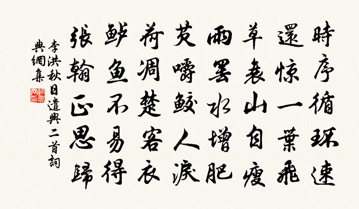 詩詞名句歷史字典書法欣賞書法字典國語詞典說文解字康熙字典古漢語字典標 題 作 者 詩 句 秋日遣興二首作者:李洪 朝代:宋代秋日遣興二首原文時序循環速,還驚一葉飛。草衰山自瘦,雨罷水增肥。芡嚼鮫人淚,荷凋楚客衣。鱸魚不易得,張翰正思歸。詩詞問答問:秋日遣興二首的作者是誰?答:李洪問:秋日遣興二首寫於哪個朝代?答:宋代李洪秋日遣興二首書法欣賞秋日遣興二首書法作品詩詞推薦題魏吉老若水軒王之道〔宋代〕世情紀甘似醇酒,沾沾未必應心口。覆手為雨翻手雲,余耳安能保長久。魏侯風味真可人,汪汪萬頃江湖春。相從玉胡蝶/玉蝴蝶吳文英〔宋代〕角斷竿鳴疏點,倦螢透隙,低弄書光。一寸悲秋,生動萬種淒涼。舊衫染、唾凝花碧,別淚想、妝洗蜂黃。楚魂傷醉落魄/一斛珠沈瀛〔宋代〕致知格物。初學工夫參聖域。天高地遠無窮極。欲造精微,莫若守惟一。純全天理明如日。都緣人慾來相惑。且將和子瞻濠州七絕逍遙堂蘇轍〔宋代〕猖狂戰國古神仙,曳尾泥葎老更安。厭世乘雲人不見,空墳聊復葬衣冠。送周縣尉滿秩歸姚勉〔宋代〕方今天下少貞廉,廉有如公豈暫淹。見說東皇思柄用,姓名已向玉瓶拈。詠史上王褒陳普〔宋代〕彭祖呼噓不可為,碧雞使節豈堪持。區區含糗羹藜厚,聊似相如衣錦時。京使回自臨川,得從兄書寄詩,依韻和徐鉉〔唐代〕珍重還京使,殷勤話故人。別離長掛夢,寵祿不關身。趣向今成道,聲華舊絕塵。莫嗟客鬢老,詩句逐時新。和君俞歲暮偶成韓維〔宋代〕凍水迎風解,芳芽逐日新。不驚身慚老,還喜物皆春。發短頻添雪,心虛不受塵。雞豚如有燕,莫忘社中人。緣識宋太宗〔宋代〕上短下長人莫笑,信緣披得便前行。衣裳不是顛來倒,憑仗丹青畫取成。感皇恩晁端禮〔宋代〕蜀錦滿林花,三年重到。應被花枝笑人老。半開微謝,占得幾多時好。便須拼痛飲、花前倒。醉中但記,紅圍綠繞二士避雨岩李廌〔宋代〕遇險思共濟,胡粵無異心。而我與夫子,義烈真斷金。陰崖避飛雨,群龍方恕吟。岩中歌式微,相和相知音。王若夫謂水晶蒲萄本出其家求詩吳芾〔宋代〕君家蒲萄天下奇,奴視百果何其卑。種成滿架日蕃衍,清似水晶甘若飴。八月江南風日美,正是人家酒熟時。盤中菩薩蠻陳義〔宋代〕天生體態腰肢細。新詞唱徹歌聲利。出口便清奇。揚塵簌簌飛。主人恩義重。宴出紅妝寵。便要賞新荷。時光也不宿廬阜歸宗題正覺禪師黃榦〔宋代〕稽首歸宗正覺師,長懷千里鬢如絲。早知具眼番成闇,不作人間了事痴。訪陸處士羽(一作訪陸羽處士不遇)皎然〔唐代〕太湖東西路,吳主古山前。所思不可見,歸鴻自翩翩。何山賞春茗,何處弄春泉。莫是滄浪子,悠悠一釣船。詠拳石菖蒲徐僑〔宋代〕岩泉潠灑著根纖,拳石相依自糾纏。土葉漸除青帶冗,細莖初發綠毛鮮。一塵不許渭幽雅,百草誰能並潔娟。日課詩應璩〔魏晉〕京師何繽紛。車馬相奔起。借問乃爾為。將欲要其仕。孝廉經述通。誰能應此舉。將歸二首蘇轍〔宋代〕久客初何事,言歸似有名。騰騰且隨俗,落落竟無成。病苦醫猶厭,囊空身自輕。家人驚別後,無限白鬚生。留別王盧二拾遺李頎〔唐代〕此別不可道,此心當報誰。春風灞水上,飲馬桃花時。誤作好文士,只令遊宦遲。留書下朝客,我有故山期。題少室故居李呂〔宋代〕拾遺舊隱居,一畝長蓬蒿。在昔考槃初,擇勝得無勞,羊腸罕人跡,丘壑方自豪。鳳凰景星睹,奔走紛兒曹。屈伸名句推薦醉里乾坤大,壺中日月長施耐庵《水滸傳·第二十九回》 綺席凝塵,香閨掩霧。晏殊《踏莎行·碧海無波》 黃河之水天上來,奔流到海不復回。李白《將進酒》 煙柳畫橋,風簾翠幕,參差十萬人家。柳永《望海潮·東南形勝》 雪虐風饕愈凜然,花中氣節最高堅。陸游《落梅》 郎騎竹馬來,繞床弄青梅。李白《長干行二首》 望斷金馬門,勞歌采樵路。孟浩然《田園作》 君子贈人以言,庶人贈人以財。荀子《荀子·大略》 無材可去補蒼天,枉入紅塵若許年。曹雪芹《紅樓夢·第一回》 見了你朝霞的顏色,便感到我落月的沉哀戴望舒《山行(見了你朝霞的顏色)》
