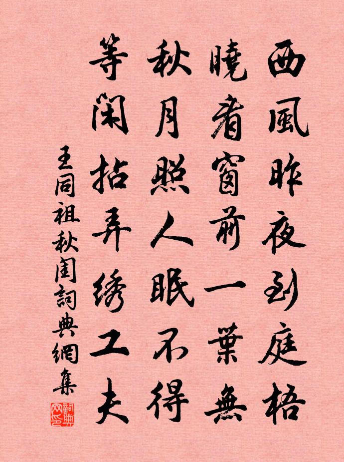 詩詞名句歷史字典書法欣賞書法字典國語詞典說文解字康熙字典古漢語字典標 題 作 者 詩 句 秋閨作者:王同祖 朝代:宋代秋閨原文西風昨夜到庭梧,曉看窗前一葉無。秋月照人眠不得,等閒拈弄繡工夫。詩詞問答問:秋閨的作者是誰?答:王同祖問:秋閨寫於哪個朝代?答:宋代王同祖秋閨書法欣賞秋閨書法作品詩詞推薦題群仙圖仇遠〔宋代〕世代雖殊道不殊,衣冠氣貌列仙儒。自憐無計攀靈轡,豈意相從入畫圖。把袂拍肩歸福地,抗塵走俗笑泥塗。苔痕和張文通書懷強至〔宋代〕仕塗眾偽雜吾真,誰信千鈞重一身。赫赫朱門公相遠,寥寥黃卷聖賢親。府居此日嗟孤宦,鄉飲當年謬上賓。猶喜廣寒游趙汝鐩〔宋代〕九秋半矩月團團,瓊瑤世界夜氣寒。羽士躍身導阿瞞,麾斥八極青雲端。老柯擲桂香不死,銀橋跨空一萬里。飛步家君為張丈明叔段丈處厚作詩集序小子贊之李處權〔宋代〕二老學而窮,超然以詩鳴。雍容三百篇,一一韶與韺。挺特汜水詩,強梁與古爭。寂寥會隱篇,澹蕩遺心營。珠璣贈喻景山陳宓〔宋代〕去時恨輕分,歸路喜忽值。如何七八月,兩作別離味。方沖臘雪還,可待秋風至。讀書我無訣,須君授奇秘。閨怨 / 怨詩張汯〔唐代〕去年離別雁初歸,今夜裁縫螢已飛。征客去來音信斷,不知何處寄寒衣。玉茗花范成大〔宋代〕折得瑤華付與誰?人間鉛粉弄妝遲。直須遠寄驂鸞客,鬢腳飄飄可一枝。中秋前夕三首方回〔宋代〕山頭月到天心小,林下秋生夜半寒。不待明朝已三五,四更仍續五更看。寄梁中砥仇遠〔宋代〕句曲峰巒翠倚天,琳宮瓊館宴神仙。水程才隔一百里,腳債未償三十年。幾擬看山攜酒去,相期聽雨對床眠。何當仲晦昆仲求近稿戲答二首劉克莊〔宋代〕辛苦搜揚更撚鬚,適資談者指瑕瑜。中郎碑好猶名愧,吏部銘高未免諛。餘忿燕泥能道否,遺言鶴唳可聞乎。從今臨江仙(壽師幕)李廷忠〔宋代〕秋到三山呈瑞氣,斑斑繡虎廣章。早分桂殿一枝香。婉謀參幕府,華署等朝行。駕月姮娥來獻壽,勝如昨夜輝光。雜詩李濤〔唐代〕燕雀賀廈屋,蟲蟻慕腥羶。野花引飛蝶,古木來新蟬。秋天百蟲吟,春天百鳥喧。翟公真闇事,喜慍見色言。翠微峰陳岩〔宋代〕嵐氣陰陰淺色山,更分黛墨染松關。噴雲泄霧空濛外,濕翠冷沾襟袖間。陌頭釋文珦〔宋代〕陌頭遊子矜年少,爭把夭桃林貌紅。老眼看來渾似夢,開時便與落時同。舍北搖落景物殊佳偶作陸游〔宋代〕小聚鷗沙北,橫林蟹舍東。船頭眠醉叟,牛背立村童。日落雲全碧,霜余葉半紅。窮鱗與倦翼,終勝在池籠。吊房十五次卿少府孟郊〔唐代〕日高方得起,獨賞些些春。可惜宛轉鶯,好音與他人。昔年此氣味,還走曲江濱。逢著韓退之,結交方殷勤。蜀客題胡運乾別墅二首白玉蟾〔宋代〕博山一炷小蛇寒,無人獨自從 * 。柴門卻倩冷風關,檐外白雲時往還。喻時王建〔唐代〕去者如弊帷,來者如新衣。鮮華非久長,色落還棄遺。詎知行者夭,豈悟壯者衰。區區未死間,回面相是非。好聞昭君怨 詠荷上雨楊萬里〔宋代〕午夢扁舟花底,香滿西湖煙水。急雨打篷聲,夢初驚。卻是池荷跳雨,散了真珠還聚。聚作水銀窩,泛清波。讀伍子胥史事釋文珦〔宋代〕惆悵當年死屬鏤,到頭忠義竟何如。眼懸城郭空懷舊,魂寄江濤尚賈余。向使君王從諫諍,未應宮闕便丘墟。唯應名句推薦茅檐長掃淨無苔,花木成畦手自栽。王安石《書湖陰先生壁》 富而不驕,貴而不舒。司馬遷《史記·五帝本紀》 山雪河冰野蕭瑟,青是烽煙白人骨。杜甫《悲青坂》 至誠而不動者,未之有也;不誠,未有能動者也。孟子《孟子·離婁章句上·第十二節》 惆悵南朝事,長江獨至今。劉長卿《秋日登吳公台上寺遠眺》 一向年光有限身,等閒離別易銷魂,酒筵歌席莫辭頻。晏殊《浣溪沙·一向年光有限身》 只有天在上,更無山與齊寇準《詠華山》 錦里開芳宴,蘭缸艷早年。盧照鄰《十五夜觀燈》 留連光景惜朱顏,黃昏獨倚闌。李煜《阮郎歸·呈鄭王十二弟》 煙開蘭葉香風暖,岸夾桃花錦浪生。李白《鸚鵡洲》