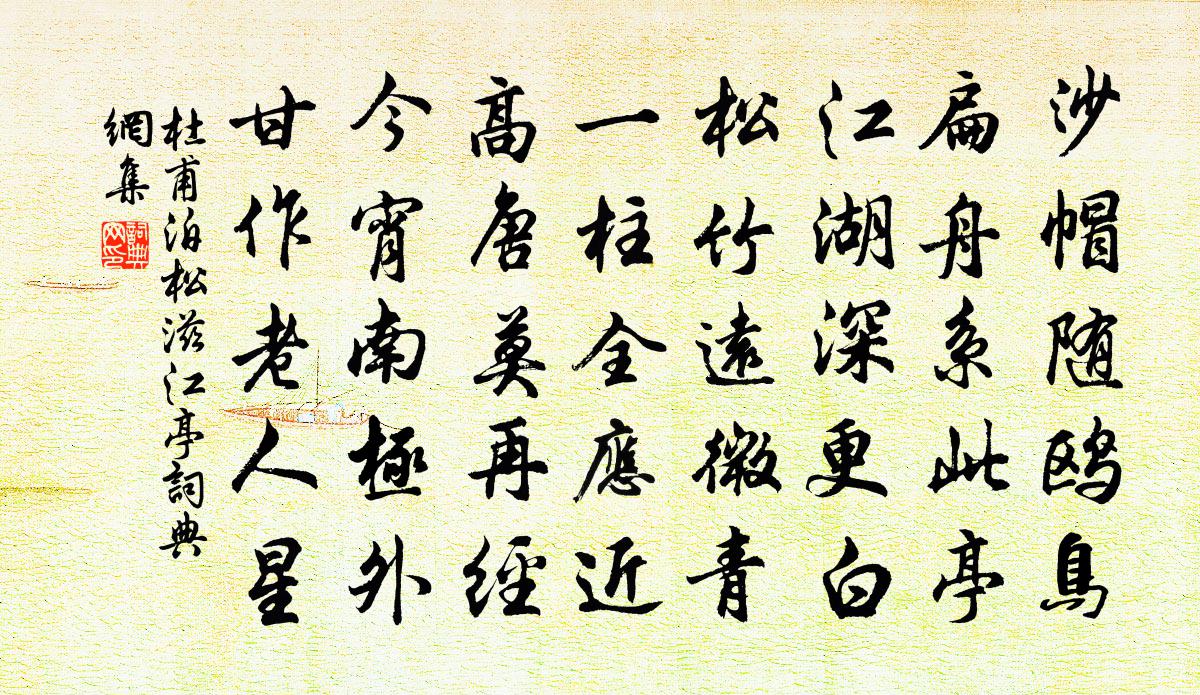 沙帽隨鷗鳥,扁舟系此亭。江湖深更白,松竹遠微青。