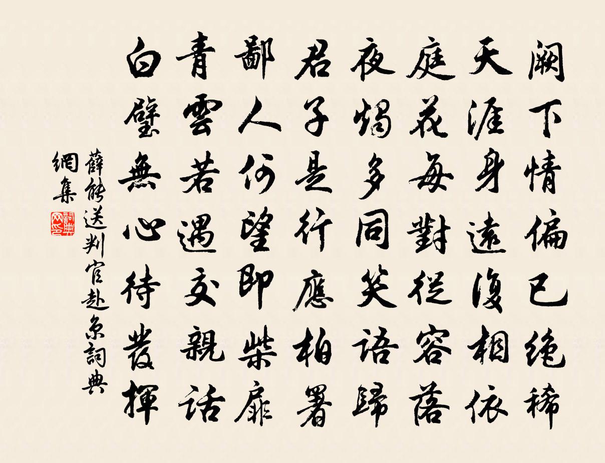 詩詞名句歷史字典書法欣賞書法字典國語詞典說文解字康熙字典古漢語字典標 題 作 者 詩 句 送判官赴京作者:薛能 朝代:唐代送判官赴京原文闕下情偏已絕稀,天涯身遠復相依。庭花每對從容落,夜燭多同笑語歸。君子是行應柏署,鄙人何望即柴扉。青雲若遇交親話,白璧無心待發揮。詩詞問答問:送判官赴京的作者是誰?答:薛能問:送判官赴京寫於哪個朝代?答:唐代問:送判官赴京是什麼體裁?答:七律薛能送判官赴京書法欣賞送判官赴京書法作品注釋全唐詩:卷884-20詩詞推薦酸棗令劉熊碑詩蔡邕〔兩漢〕有父子然後有君臣。理財正辭。束帛戔戔。□夢刻像。鶴鳴一震。天臨保漢。實生□勛。明試賦授。夷夏已親。嘉感皇恩王庭珪〔宋代〕羸馬怯征鞍,駸駸欲驟。昨夜文星動南斗。廣寒宮近,欲上煙霄攜手。素娥不奈冷,淒涼久。知是謫仙,肝腸錦繡清平樂張炎〔宋代〕蘭曰國香,為哲人出,不以色香自炫,乃得天之清者也。楚子不作,蘭今安在?得見所南翁枝上數筆,斯可矣。賦卜運算元 送鮑浩然之浙東王觀〔宋代〕水是眼波橫,[1]山是眉峰聚。[2]欲問行人去那邊,眉眼盈盈處。[3]才始送春歸,又送君歸去。若到江送高司直尋封閬州杜甫〔唐代〕丹雀銜書來,暮棲何鄉樹。驊騮事天子,辛苦在道路。司直非冗官,荒山甚無趣。借問泛舟人,胡為入雲霧。與子添築橫玉再賦陳宓〔宋代〕一花爛熳一花殘,先後無時不傍欄。春到園林元不老,請君細把化工看。感皇恩王千秋〔宋代〕天氣過燒燈,初閒人倦。曉色曈曨繡簾卷。聚星歌扇,一簇雪香瓊軟。壽杯爭要把,從他滿。低低笑祝,年齡遐遠送家連父解綿竹丞李流謙〔宋代〕猿臂將軍數自奇,白頭州縣竟何為。斲墁未盡成風巧,測管才窺澤霧姿。流水繞除空日日,西山拄笏謾時時。一杯出真州文天祥〔宋代〕秦庭痛哭血成川,翻訝中行背可鞭。南北共知忠義苦,平生只少兩淮緣。上元思京輦舊遊三首張耒〔宋代〕萬雉春城逼絳霄,上元雕輦盛游遨。遲遲瑞日低彤傘,焯焯榮光上赭袍。雲卷朱簾開彩雉,山盤玉闕枕仙鰲。長安和答潘端叔見寄孫應時〔宋代〕發白念少年,萬事風雨過。倦遊得來歸,一切付懶惰。獨抱杞天憂,傍徨意無奈。濠魚定何樂,幕燕渠敢賀。嘆君應真二首劉克莊〔宋代〕五百逋逃士,劉郎不放心。教醒阿羅漢,飛空無處尋。浮丘道人招魂歌汪元量〔宋代〕有女有女清且淑,學母曉妝顏如玉。憶昔狼狽走空谷,不得還家收骨肉。關河喪亂多殺戮,白日驅人夜燒屋。一雙泊楚州鎖外六首張耒〔宋代〕水榭疏簾秋夜涼,清歌一曲釂瑤觴。明朝回首高城處,只有西風卻斷腸。抱疾謝李吏部贈訶黎勒葉包佶〔唐代〕一葉生西徼,齎來上海查。歲時經水府,根本別天涯。方士真難見,商胡輒自誇。此香同異域,看色勝仙家。茗飲寧浦書事六首秦觀〔宋代〕洛邑太師奄謝,龍川僕射雲亡。他日巋然獨在,不知誰似靈光。挽楊茂原二首趙蕃〔宋代〕玉美終懷璞,蘭香竟死林。名期百世後,恨獨九原深。夜雨長形夢,秋風遂絕音。扁舟載孤旐,行路亦沾襟。度桂嶺歌劉禹錫〔唐代〕桂陽嶺,下下復高高。人稀鳥獸駭,地遠草木豪。寄言遷金子,知余歌者勞。晚出府舍與獨孤兵曹、令狐士曹南尋朱雀街歸里第韋應物〔唐代〕分曹幸同簡,聯騎方愜素。還從廣陌歸,不覺青山暮。翻翻鳥未沒,杳杳鍾猶度。尋草遠無人,望山多枉路。聊參詩一首陳摶〔宋代〕華陰高處是吾宮,出即凌空跨曉風。台殿不將金鎖閉,來時自有白雲封。名句推薦興國在於務農。陳壽《三國志·魏書·辛毗楊阜高堂隆傳》 勞歌一曲解行舟,紅葉青山水急流。許渾《謝亭送別》 記當日、門掩梨花,翦燈深夜語。史達祖《綺羅香·詠春雨》 飢不擇食,寒不擇衣,慌不擇路,貧不擇妻。施耐庵《水滸傳·第三回》 雪霏霏,風凜凜,玉郎何處狂飲?魏承班《滿宮花·雪霏霏》 肥水東流無盡期。當初不合種相思。姜夔《鷓鴣天·元夕有所夢》 何當擊凡鳥,毛血灑平蕪。杜甫《畫鷹》 早歲那知世事艱,中原北望氣如山。陸游《書憤五首·其一》 東風楊柳欲青青。煙淡雨初晴。晏殊《訴衷情·東風楊柳欲青青》 雲鬟綠鬢罷梳結,愁如回飆亂白雪。李白《久別離》