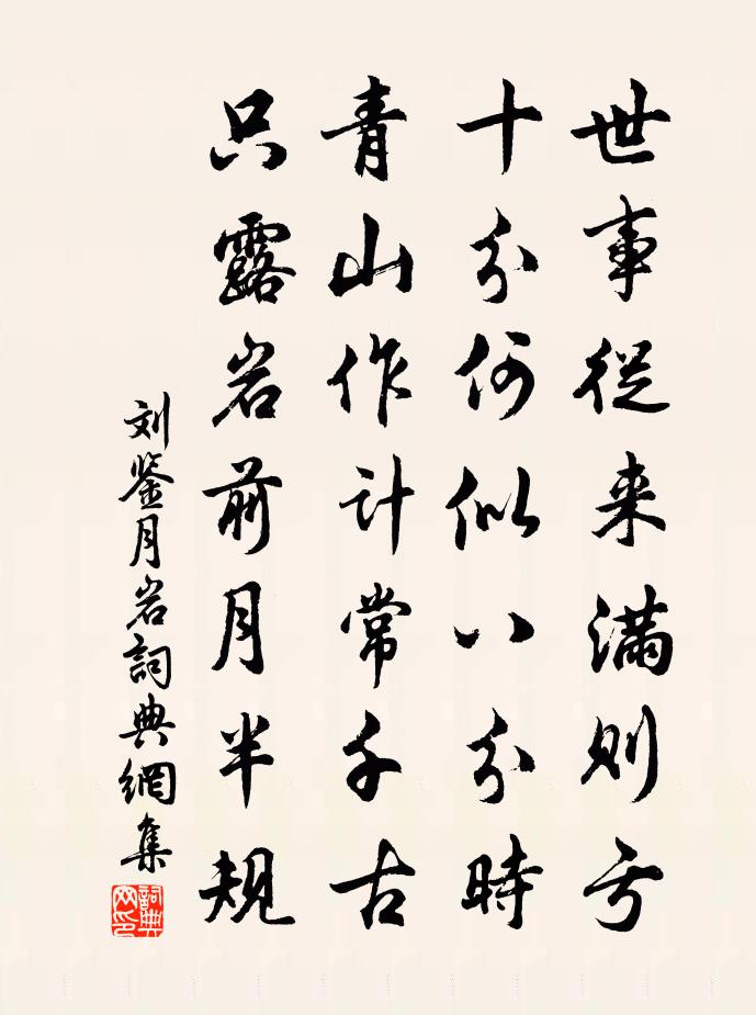 詩詞名句歷史字典書法欣賞書法字典國語詞典說文解字康熙字典古漢語字典標 題 作 者 詩 句 月岩作者:劉鑒 朝代:宋代月岩原文世事從來滿則虧,十分何似八分時。青山作計常千古,只露岩前月半規。詩詞問答問:月岩的作者是誰?答:劉鑒問:月岩寫於哪個朝代?答:宋代劉鑒月岩書法欣賞月岩書法作品詩詞推薦次余靜庵寒夜詩思二首楊公遠〔宋代〕地爐煨芋栗,兀坐數寒更。香篆消重爇,銀釭剔復明。月穿窗隙過,風拂樹梢鳴。喚醒吟邊興,敲推睡不成。寄西湖房灝〔宋代〕昔年曾向西湖住,日夕閒行湖上路。東風二月梅花開,香得孤山無著處。六尺瘦藤雙翠屨,眼前物物皆詩具。被人夜坐讀書聞瓶梅之香口占五絕趙蕃〔宋代〕一從叢桂落秋風,佳處長孤阿堵中。及至梅花又冰雪,一枝雖少與多同。從趙崇道求蜀紙五首趙蕃〔宋代〕紫岩黟歙略相同,小字緘題寄子公。縱使分沾能到我,質粗肉緩不堪攻。昌英知縣叔作歲坐上,賦瓶里梅花,時坐上九楊萬里〔宋代〕膽樣銀瓶玉樣梅,此枝折得未全開。為憐落莫空山里,喚入詩人几案來。阮郎歸(同十二叔泛濟州環溪)晁補之〔宋代〕西城北渚舊追隨。荒台今是非。白苹無主綠蒲迷。停舟憶舊時。雙鴨戲,亂鷗飛。人家煙雨西。不成攜手摺芳菲。鶯鶯詩(一作離思詩之首篇)元稹〔唐代〕殷紅淺碧舊衣裳,取次梳頭暗淡妝。夜合帶煙籠曉日,牡丹經雨泣殘陽。低迷隱笑原非笑,散漫清香不似香。頻動月中仙 對松丘處機〔元代〕落落長松,倚浮雲大山高占幽僻。亭亭隱士,愛洞天岩穴,深藏虛極。對門開是景,掛猿狹*、離羅峭壁。盡日無唐鐃歌鼓吹曲十二篇。既克東蠻群臣請圖蠻…東蠻第十二柳宗元〔唐代〕東蠻有謝氏,冠帶理海中。自言我異世,雖聖莫能通。王卒如飛翰,鵬鶱駭群龍。轟然自天墜,乃信神武功。系虜句謝希孟〔宋代〕句牽主人衣,一步行不得。水調歌頭(張文伯生日)王之道〔宋代〕瓊樹掛初日,珠箔卷清霜。夜來溪上微雨,佳節過重陽。共慶當年此際,曾見天麟協夢,華閥掛蓬桑。人作魯侯祝有感十首吳芾〔宋代〕漠漠黃雲塞草低,南人空說翠輿歸。孤臣淚盡仍嘗膽,白首江湖雁北飛。幽步釋文珦〔宋代〕僻好唯泉石,深居任草萊。寧辭幽步遠,且放好懷開。綠樹鶯求友,青坡雉應媒。因逢道人語,月出始能回。九日送人陳顏〔宋代〕今夕遂獨坐,今晨已別離。同此良宵中,秋意各自知。灩灩潮與汐,來往亦何為。嗟爾扁舟子,何時老藩籬。憶仙姿·曾宴桃源深洞李存勖〔五代〕曾宴桃源深洞,一曲清歌舞鳳。長記欲別時,和淚出門相送。如夢!如夢!殘月落花煙重。過秦樓佚名〔宋代〕燕蹴飛紅,鶯遷新綠,幾陣晚來風急。謝家池館,金谷園林,還又把春虛擲。年時恨雨愁雲,物換星移,有誰曾憶題晚節香亭喻良能〔宋代〕周侯人中英,為文若翻水。苦節凌雪霜,香名馥蘭芷。考槃在幽谷,篁竹富清美。竹邊兩桂樹,碧葉光薿薿。扁堂壺關道中作韋莊〔唐代〕處處兵戈路不通,卻從山北去江東。黃昏欲到壺關寨,匹馬寒嘶野草中。命解度正〔宋代〕世謂臧倉解譖軻,豈知天意在干戈。如天便欲平天下,縱百臧倉不奈何。偶成李流謙〔宋代〕樂天已貴杯常把,元亭雖貧飲亦豪。等是逍遙吾自擇,不能為白但為陶。名句推薦自笑好山如好色,只今懷樹更懷人。閒愁閒恨一番新。辛棄疾《浣溪沙·偕叔高子似宿山寺戲作》 仁者愛萬物而智者備禍於未形,不仁不智,何以為國?司馬遷《史記·趙世家》 將軍發白馬,旌節度黃河。李白《發白馬》 原濁者,流不清;行不信者,名必耗。墨子《墨子·02章 修身》 沉憂能傷人,綠鬢成霜蓬。李白《怨歌行》 足以充虛繼氣,強股肱,耳目聰明,則止。墨子《墨子·21章 節用(中)》 一曲陽關,斷腸聲盡,獨自憑蘭橈柳永《少年游·參差煙樹灞陵橋》 春城無處不飛花,寒食東風御柳斜。韓翃《寒食 / 寒食日即事》 一晌憑欄人不見,鮫綃掩淚思量遍。馮延巳《鵲踏枝·梅落繁枝千萬片》 執子之手,與子偕老。詩經《擊鼓》