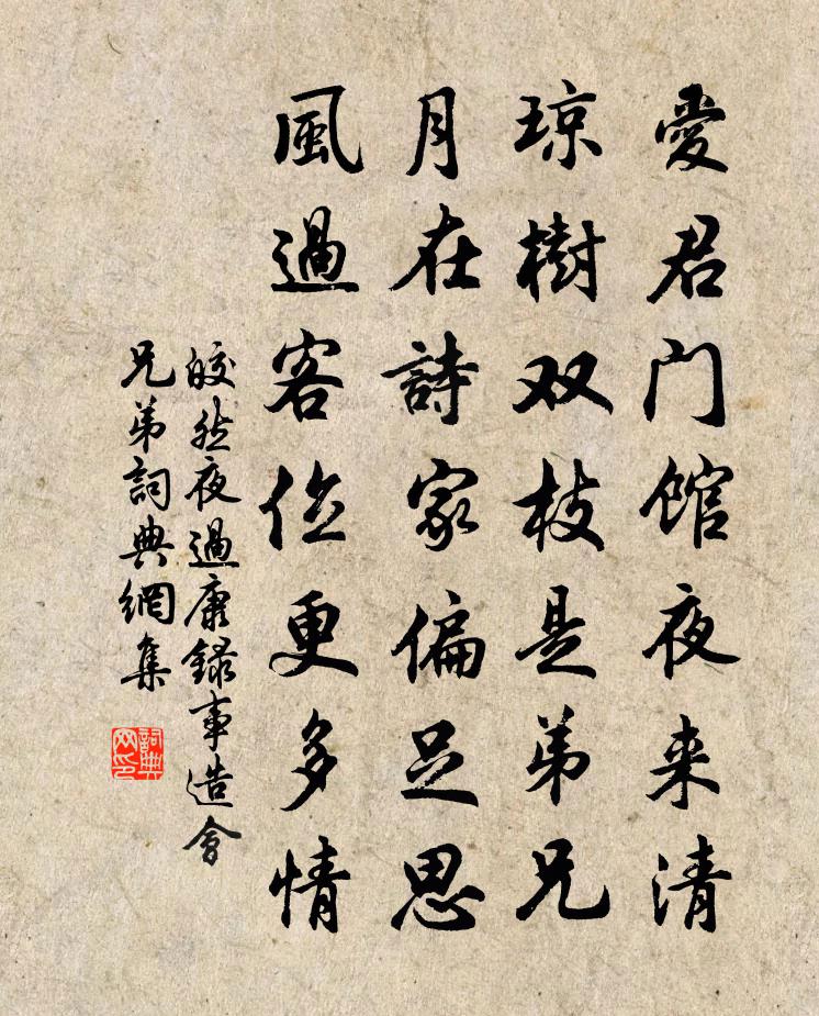 詩詞名句歷史字典書法欣賞書法字典國語詞典說文解字康熙字典古漢語字典標 題 作 者 詩 句 夜過康錄事造會兄弟作者:皎然 朝代:唐代夜過康錄事造會兄弟原文愛君門館夜來清,瓊樹雙枝是弟兄。月在詩家偏足思,風過客位更多情。詩詞問答問:夜過康錄事造會兄弟的作者是誰?答:皎然問:夜過康錄事造會兄弟寫於哪個朝代?答:唐代問:夜過康錄事造會兄弟是什麼體裁?答:七絕皎然夜過康錄事造會兄弟書法欣賞夜過康錄事造會兄弟書法作品注釋全唐詩:卷817-69詩詞推薦偶泛釋文珦〔宋代〕偶泛扁舟向海埏,初非有意訪神仙。蓬萊方丈不可問,漢武秦皇空復然,水上樓台皆蜃氣,石間膏馥是龍涎。 * 春雨寇準〔宋代〕漠漠霏霏著柳條,輕寒爭信杏花嬌。江南二月如煙細,誰正春愁在麗譙。過新豐村偶成衛宗武〔宋代〕咫尺是江城,欲前猶未能。舟行尋宿泊,村近問名稱。愁聚眉常斂,吟窮思屢凝。新豐舊遊地,過騎免憑陵。張仲良久約出郊以詩督之楊萬里〔宋代〕只道今春不肯晴,已晴誰遣不郊行。忍違花底提壺語,不慮屋頭鳩婦鳴。鷓鴣天鄒應龍〔宋代〕壽母開年九十三。佳辰就養大江南。緹屏晃耀新寧國,繡斧斕斑老朴庵。傾玉斝,擘黃柑。兩孫垂綬碧於藍。便當點絳唇(寒香水仙)王十朋〔宋代〕清夜沉沉,攜來深院柔枝小。儷蘭開巧。雪裡乘風裊。溫室寒祛,旖旎仙姿早。看成好。花仙歡笑。不管年華老。代書寄襄陽令於去非趙蕃〔宋代〕來往豐城縣,尋君總不遭。如聞漾鳧舄,已復用牛刀。往事多遺蹟,邊庭簡吏曹。莫由同古訪,尚擬見詩豪。雜詩吳大有〔宋代〕客行情最苦,草草共清尊。萬水千山路,今朝好出門。登辨覺寺王維〔唐代〕竹徑從初地,蓮峰出化城。窗中三楚盡,林上九江平。軟草承趺坐,長松響梵聲。空居法雲外,觀世得無生。贈李樞乾三首姚勉〔宋代〕富貴功名不足夸,肯將一第博榮華。春分正欲均天下,何必長安看盡花。偈頌一百二十三首釋普度〔宋代〕山前一片閒田地,曠大劫來 * 至。今朝恢復又歸來,坐斷腳頭並腳尾。東也是,西也是,南北東西無不是。答友釋雲林〔宋代〕騷首何須更問天,此心灰盡不重然。休將瑣瑣塵寰事,換我山中枕石眠。於郡城送明卿之江西李攀龍〔明代〕青楓颯颯雨淒淒,秋色遙看入楚迷。誰向孤舟憐逐客?白雲相送大江西。臨江仙(送王叔濟)張元乾〔宋代〕玉立清標消晚暑,胸中一段冰壺。畫船歸去醉歌珠。微雲收未盡,殘月炯如初。鴛鷺行間催闊步,秋來乘興鳧趨。次韻吉老十小詩黃庭堅〔宋代〕日短循除廡,溪寒出臼科。官居圖畫裡,小鴨睡枯荷。雪夜感舊陸游〔宋代〕江月亭前樺燭香,龍門閣上馱聲長。亂山古驛經三折,小市孤城宿兩當。晚歲猶思事鞍馬,當時那信老耕桑?綠沉春鳩梅堯臣〔宋代〕鳴鳩識陰晦,聒聒雌逐雄。鵲巢汝得共,可蔽雨與風。春物況不晚,杏萼已半紅。試看池館間,燕雀隨西東。題花光畫黃庭堅〔宋代〕湖北山無地,湖南水徹天。雲沙真富貴,翰墨小神仙。送陳宗諭進叔晉接赴慶元添卒及乃弟泰來四首王邁〔宋代〕向來寅陛對,冷語頗冰人。未犯總神怒,先遭老鳳嗔。宗庠隨卻步,家食不憂貧。公語何當泯,題輿寵渥新。再見王進之於潭王即有岳鄂之行贈之四首趙蕃〔宋代〕我客猶湖外,君行返漢中。乖離從此異,邂逅復茲同。始見忘曾識,徐言乃漸通。怪來顏重渥,深感鬢成蓬。名句推薦教也者,長善而救其失者也。戴聖《禮記·學記》 一鼓作氣,再而衰,三而竭。左丘明《左傳·莊公·莊公十年》 但箭雁沈邊,梁燕無主。劉辰翁《蘭陵王·丙子送春》 待到山花爛漫時,她在叢中笑。 * 《卜運算元·詠梅》 毀譽從來不可聽,是非終久自分明。馮夢龍《警世通言·卷四》 春雲吹散湘簾雨,絮黏蝴蝶飛還住。納蘭性德《菩薩蠻·春雲吹散湘簾雨》 迸籜分苦節,輕筠抱虛心。柳宗元《巽公院五詠·苦竹橋》 拋家傍路,思量卻是,無情有思。蘇軾《水龍吟·次韻章質夫楊花詞》 今日漢宮人,明朝胡地妾。李白《王昭君二首》 中庭月色正清明,無數楊花過無影。張先《木蘭花·乙卯吳興寒食》