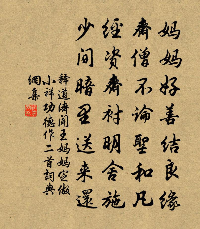 詩詞名句歷史字典書法欣賞書法字典國語詞典說文解字康熙字典古漢語字典標 題 作 者 詩 句 聞王媽媽定做小祥功德作二首作者:釋道濟 朝代:宋代原文媽媽好善結良緣,齋僧不論聖和凡。經資齋襯明舍施,少間暗裡送來還。詩詞問答問:《聞王媽媽定做小祥功德作二首》的作者是誰?答:釋道濟問:該詩寫於哪個朝代?答:宋代書法欣賞聞王媽媽定做小祥功德作二首書法作品詩詞推薦三月二十九日舟中作晁公溯〔宋代〕今晨天氣佳,晴光被茂草。草際含余滋,粲然泫清曉。舟師催解纜,及此風色好。江神似相予,扁舟若輕矯。山坡羊·侍牧庵先生西湖夜飲劉時中〔元代〕微風不定,幽香成徑,紅雲十里波千頃。綺羅馨,管弦清,蘭舟直入空明鏡。碧天夜涼秋月冷。天,湖外影;湖,天姥道中釋行海〔宋代〕春風陌上野花香,目送北歸鴻雁行。百里青山行不盡,隔煙啼鳥又斜陽。臨江仙曾紆〔宋代〕後院短牆臨綠水,春風急管繁弦。問誰親按小嬋娟。玉堂真學士,琳館地行仙。安得此身來此處,依稀一夢梨園。耆英會詩張燾〔宋代〕洛城今昔衣冠盛。韓國園林景物全。功在三朝尊二相,數逾九老萃群賢。當時鄉社為高會,此日居留許款延。多幸送董信州晏殊〔宋代〕鳳闕承丹詔,麟符得舊鄉。雨中吳岫碧,林罅楚梅黃。使節江湖外,城樓翼軫旁。吾知召南樹,從此接維桑。回山僧書就題書尾周弼〔宋代〕憶昔同行題落葉,寺前枯樹鶴巢邊。不知今度苔枝上,多少秋蟲已化蟬。題招隱寺王琪〔宋代〕蒼崖何蟠回,嘗為隱君宅。孰謂人琴亡,松風正蕭瑟。花閒雪英舞,鹿去岩泉冽。經聲草堂迥,天香中夜發。月落平遠台喻良能〔宋代〕平遠台高俯翠微,海天煙雨正霏霏。登臨何處明人眼,烏石山前白鳥飛。寄永州徐三掾曹翁卷〔宋代〕聞說居官睡,千峰近九疑。合流皆楚水,高石半唐碑。香草寒猶錄,清猿夜更悲。其中多隱者,君去得逢誰。南鄉子蔡伸〔宋代〕木落雁南翔。錦鯉殷勤為渡江。淚墨銀鉤相憶字,成行。滴損雲箋小鳳皇。陳事費思量。回首煙波卷夕陽。盡道憑奉和御製旋師喜捷裴漼〔唐代〕殊類驕無長,王師示有徵。中軍才受律,妖寇已亡精。斬虜還遮塞,綏降更築城。從來攻必克,天策振奇兵。定風波葉夢得〔宋代〕渺渺空波下夕陽。睡痕初破水風涼。過雨歸雲留不住。何處。遠村煙樹半微茫。莫笑經年人老矣。歸計。得遲留處題西湖畫軸吳龍翰〔宋代〕丹青誰寫滿軸蓮,濯濯西施一段妍。汴水百年塵隔斷,可無人作畫圖傳。幽谷種花洗山歐陽修〔宋代〕洗出峰巒看臘雪,栽成花木趁新年。史君功行今將滿,誰肯同來作地仙。藏春塢蘇軾〔宋代〕朱閣前頭露井多,碧桃花下美人過。寒泉未必能勝此,奈有銀瓶素綆何。偈頌七十六首釋師範〔宋代〕健時要坐禪,困時要打眠。肚飢須吃飯,陸地要行船。九日三首宋白〔宋代〕霜冷風清九月九,茱萸 * 家園有。何時玉殿接千官,稱觴共進南山壽。帷李嶠〔唐代〕久閉先生戶,高褰太守車。羅將翡翠合,錦逐鳳皇舒。明月彈琴夜,清風入幌初。方知決勝策,黃石受兵書。南歌子楊無咎〔宋代〕露寵妝成態,風扶醉里身。謾勞驛使走征塵。嶺外隴頭處、不知春。詩思如清水,毫端妙入神。可憐徒效越娘顰。名句推薦善不積不足以成名,惡不積不足以滅身。佚名《易傳·繫辭傳下·第五章》 無邊落木蕭蕭下,不盡長江滾滾來。杜甫《登高》 山迴路轉不見君,雪上空留馬行處。岑參《白雪歌送武判官歸京》 圖難於其易,為大於其細老子《老子·德經·第六十三章》 折戟沉沙鐵未銷,自將磨洗認前朝。杜牧《赤壁》 古人學問無遺力,少壯工夫老始成。陸游《冬夜讀書示子聿》 何夜無月?何處無竹柏?但少閒人如吾兩人者耳。蘇軾《記承天寺夜遊 / 記承天夜遊》 雁聚河流濁,羊群磧草膻。齊己《送人游塞》 江燕話歸成曉別,水花紅減似春休。西風梧井葉先愁。吳文英《浣溪沙·秋情》 手攜稚子夜歸院,月冷空房不見人。白居易《為薛台悼亡》
