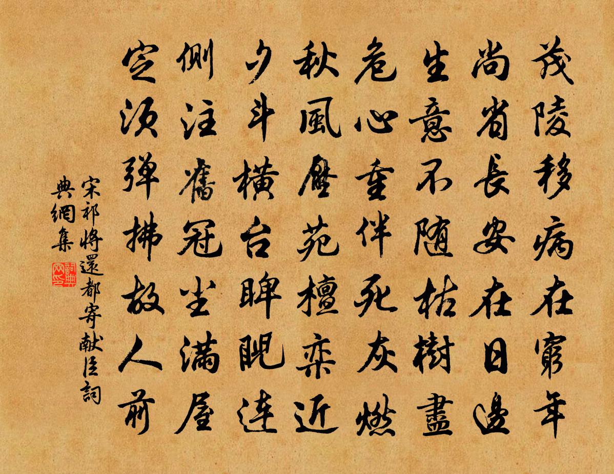詩詞名句歷史字典書法欣賞書法字典國語詞典說文解字康熙字典古漢語字典標 題 作 者 詩 句 將還都寄獻臣作者:宋祁 朝代:宋代將還都寄獻臣原文茂陵移病在窮年,尚省長安在日邊。生意不隨枯樹盡,危心重伴死灰燃。秋風壓苑檀欒近,夕斗橫台睥睨連。側注舊冠塵滿屋,定須彈拂故人前。詩詞問答問:將還都寄獻臣的作者是誰?答:宋祁問:將還都寄獻臣寫於哪個朝代?答:宋代問:宋祁的名句有哪些?答:宋祁名句大全宋祁將還都寄獻臣書法欣賞將還都寄獻臣書法作品詩詞推薦百雁圖戴表元〔宋代〕近看分明遠欲無,水天空闊好江湖。幸然不入虞人眼,又被間中畫作圖。朱粹索詩作三絕謝之陳造〔宋代〕多謝詩翁肯唱予,挑燈泚筆復踟躕。龍文虎脊渠皆有,鶴膝蜂腰我未除。題江樂陳氏江亭程公許〔宋代〕漁艇間撐過水東,亂雲含雨晚溟濛。絕憐郊野依林壑,更拓軒窗貯竹風。剩與煙波開靄杳,卻須菑翳略疏通。間居寄題黃靜齋王義山〔宋代〕靜中樂處是琴書,此樂輸君二美俱。明鏡無塵佛關捩,內丹養火夜工夫。梅花窗下參同契,翠草庭前太極圖。探得陪韓退之、竇貽、周同尋劉尊師不遇,得師字韋執中〔唐代〕早尚逍遙境,常懷汗漫期。星郎同訪道,羽客杳何之。物外求仙侶,人間失我師。不知柯爛者,何處看圍棋。贈章虞卿陳傅良〔宋代〕章子一別二十年,此來銜袖書一編。自出己意說百篇,至說五誥尤愕然。我今萬事付幽屏,是書插架漫不省。子之木蘭陂龔茂良〔宋代〕木蘭春漲與江能,日日江潮送曉風。此水還應接鄞水,為誰流下海門東。將母赴贛道西昌文天祥〔宋代〕重來鷗閣曉,帆影漲新晴。倚檻雲來去,閉簾花送迎。江湖春汗漫,歲月老崢嶸。手把忘憂草,夔夔繞太清。送袁景宗之荊渚寧覲魏野〔宋代〕荊渚北堂寧聖善,棠陰東閣別嚴君。雪村山館思親夢,二十餘宵兩處分。行香子侯善淵〔元代〕天地玄黃。率化無疆。太虛高、日月飛。龍磨星斗,鳳熾玄網。見海神潮,江神會,穀神張。煥煥煌煌。照耀十潞公與梅聖俞論古人有純用平聲字為詩如枯桑鄭剛中〔宋代〕江梅非凡根,先春花南枝。玲瓏皆瑤英,雕鐫誰為之。天高孤芳寒,風來幽香隨。朝暾晞霜華,蘭膏塗真妃。移之宋帥移廚就市樓並飯胡黎州項安世〔宋代〕天明喜氣滿沙頭,小隊行廚下楚樓。太白穩歸雲闕去,德星聊向雪山游。澹翁不為重溟怯,令子何辭九折愁。榮殺六言樂語蘇軾〔宋代〕桃園未必無杏,銀礦終須有鉛。荇帶豈能攔浪,藕花卻解留蓮。所懷文天祥〔宋代〕英英香蕙瑩朝華,收拾東風作一家。燕語鶯啼春又夏,燈花剔盡暗窗斜。奉和賈至舍人早朝大明宮杜甫〔唐代〕五夜漏聲催曉箭,九重春色醉仙桃。旌旗日暖龍蛇動,宮殿風微燕雀高。朝罷香菸攜滿袖,詩成珠玉在揮毫。欲知江城子張泌〔唐代〕碧闌乾外小中庭,雨初晴,曉鶯聲。飛絮落花,時節近清明。睡起捲簾無一事,勻面了,沒心情。浣花溪上見卿卿致仕後歲事有望欣然賦詩陸游〔宋代〕聖時恩厚賜餘生,日與鄉閭樂太平。已棄胡床無長物,尚攜拄杖有同行。新裁烏帽人爭看,小摘青蔬手自烹。買得歙縣歲寒堂蘇轍〔宋代〕檻外甘堂錦繡屏,長松何者擅亭名。浮花過眼無多日,勁節凌寒盡此生。暗長茯苓根自大,旋收金粉氣尤清。長官賦西淙瀑布得斷字劉克莊〔宋代〕蒼山七百畝,主人新買斷。於時積霧開,素瀑掛青漢。泠泠瑟初鏗,璀璀珠乍貫。久晴雨瓢翻,忽暖冰柱泮。恍如苦雨中又作四聲詩寄魯望平去聲皮日休〔唐代〕狂霖昏悲吟,瘦桂對病臥。檐虛能彯斜,舍蠹易漏破。宵愁將琴攻,晝悶用睡過。堆書仍傾觴,富貴未換個。名句推薦去年五月黃梅雨,曾典袈裟糴米歸。與恭《思母》 江皋樓觀前朝寺,秋色入秦淮。徐再思《人月圓·甘露懷古》 西風稍急喧窗竹,停又續,膩臉懸雙玉。閻選《河傳·秋雨》 喜遇重陽,更佳釀今朝新熟。宋江《滿江紅·喜遇重陽》 牆裡鞦韆牆外道。牆外行人,牆裡佳人笑。蘇軾《蝶戀花·春景》 君子之學也,以美其身;小人之學也,以為禽犢。荀子《荀子·勸學》 應是天仙狂醉,亂把白雲揉碎。李白《清平樂·畫堂晨起》 夏條綠已密,朱萼綴明鮮。韋應物《夏花明》 霜威出塞早,雲色渡河秋。李白《太原早秋》 春思遠,誰嘆賞、國香風味。周密《繡鸞鳳花犯·賦水仙》