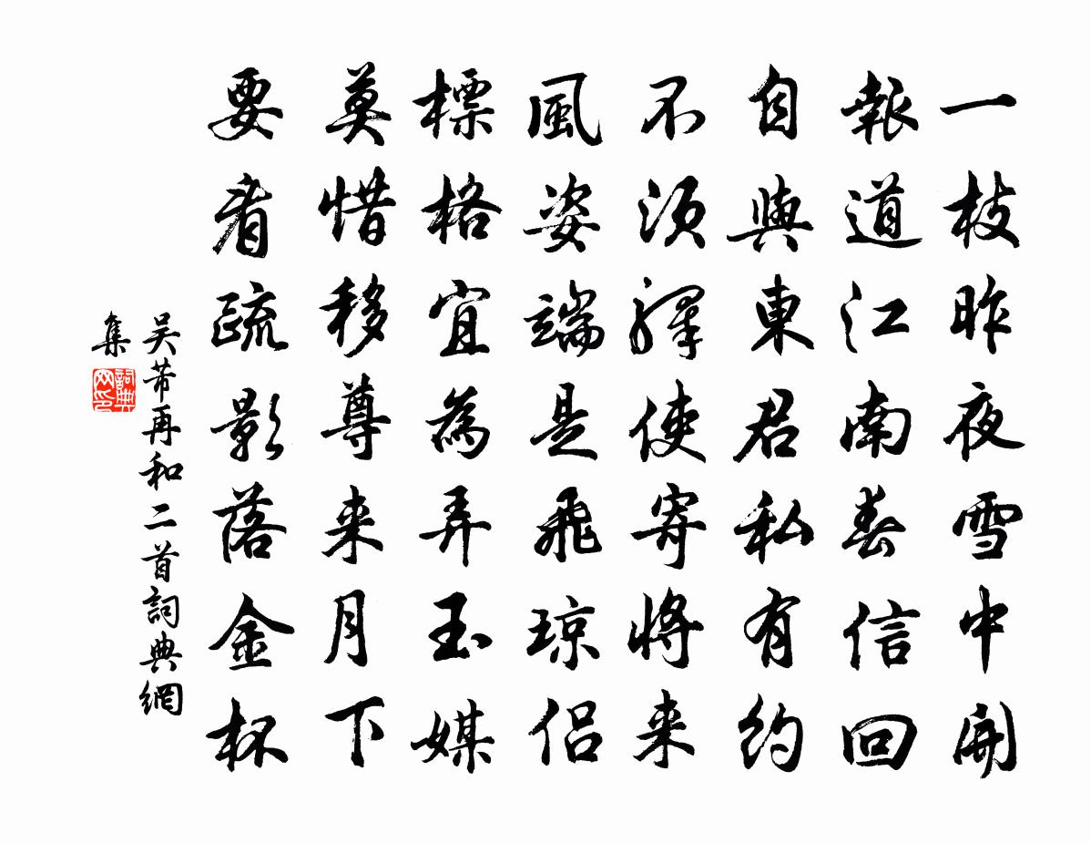 詩詞名句歷史字典書法欣賞書法字典國語詞典說文解字康熙字典古漢語字典標 題 作 者 詩 句 再和二首作者:吳芾 朝代:宋代再和二首原文一枝昨夜雪中開,報導江南春信回。自與東君私有約,不須驛使寄將來。風姿端是飛瓊侶,標格宜為弄玉媒。莫惜移尊來月下,要看疏影落金杯。詩詞問答問:再和二首的作者是誰?答:吳芾問:再和二首寫於哪個朝代?答:宋代吳芾再和二首書法欣賞再和二首書法作品詩詞推薦偶成楊簡〔宋代〕風雲雨雪自何來,我有乾元大矣哉。萬景出奇供杖履,群峰環翠拱樓台。興來吟詠誰裁剪,飯罷遊行豈去回。信口竹枝詞二首·其二劉禹錫〔唐代〕楚水巴山江雨多,巴人能唱本鄉歌。今朝北客思歸去,回入紇那披綠羅。忠州項安世〔宋代〕耕鑿林廬滿四山,人家境象極寬閒。不妨五馬雲根住,小市孤城自掩關。雜興五首艾性夫〔宋代〕孤鳳不食粟,舉世無琳琅。渴去飲湘水,飢來臥首陽。雲天遲羽翼,歲晚飽風霜。棲棲豈不苦,羞與燕雀翔。安得廣陵歐陽永叔贈寒林石硯屏梅堯臣〔宋代〕磷磷石岸上,濃淡樹林分。隔水見寒島,暗枝藏宿雲。賢哉吾益友,持以贈離群。琥珀不須問,中心多化蚊。洗竹十八韻李新〔宋代〕誰倣王郎子,庭前種修竹。清陰生曉雲,遠意近幽谷。歲久太昏翳,客來為湔沐。掠地芟蒙茸,揮空除樸樕。碧篠漁家邵定〔宋代〕漁家臨水住,春盡無花開。年年謝流水,流得好花來。上瀘帥梁公陳天麟〔宋代〕六轡澄清日,三軍指顧中。關山都識面,草木尚傾風。飲馬伊吾北,迴鑾澗水東。廟謨應富有,傾倒莫匆匆。聞雁盧汝弼〔唐代〕秋風蕭瑟靜埃氛,邊雁迎風響咽群。瀚海應嫌霜下早,湘川偏愛草初薰。蘆洲宿處依沙岸,榆塞飛時度晚雲。何處次韻和謝江陵楊縣丞投贈四首項安世〔宋代〕與君齊宦五雲東,與我齊生一歲中。今日天涯須共笑,半生頭鬢備相同。觀中香火無官守,庭下吟{左口右名}少南嶽路口懷胡氏兄弟項安世〔宋代〕奕奕神山照遠天,美人家在此山前。待儂了卻公家事,來借書堂十日眠。南浦篇孟郊〔唐代〕南浦桃花亞水紅,水邊柳絮由春風。鳥鳴喈喈煙濛濛,自從遠送對悲翁。此翁已與少年別,唯憶深山深谷中。酬暉上人夏日林泉陳子昂〔唐代〕聞道白雲居。窈窕青蓮宇。岩泉萬丈流。樹石千年古。林臥對軒窗。山陰滿庭戶。方釋塵事勞。從君襲蘭杜。次王帥韻後詩呈葉教授陳造〔宋代〕功名回首負年華,梨棗諸雛未克家。老計生涯須下澤,才非世用但匏瓜。為儒僅博肱三折,謀食寧羞手一叉。青眼行香子·秋入鳴皋許古〔元代〕秋入鳴皋。爽氣飄蕭。掛衣冠、初脫塵勞。窗間岩岫,看盡昏朝。夜山低,晴山近,曉山高。細數間來,幾處村醪雪中尋梅陸游〔宋代〕幽香淡淡影疏疏,雪虐風饕亦自如。正是花中巢許輩,人間富貴不關渠。山行愁思羅與之〔宋代〕明月印野水,暮色進旅愁。仆痡主亦疲,心口相怨尤。茅台舍劣容膝,弛擔聊小休。會當理歸策,甘彼窮山囚。贈相者二首陳造〔宋代〕材同樗櫟將安用,官帶笭箵亦漫為。更欲品題人所棄,君痴尤勝老夫痴。夜大風雪次日快晴胡寅〔宋代〕造物非難料,寒溫本一家。衝風來雨雪,暖日放鶯花。行矣春方嫩,悠哉興未涯。蘆蒿媚煙渚,荻筍破江沙。題大安寺通禪師院貫休〔唐代〕應行諸岳遍,象屣半無綱。一法尋常說,此機仍未忘。窗閒藤影老,衲厚瀑痕荒。寄語迷津者,來茲問不妨。名句推薦迢迢新秋夕,亭亭月將圓。陶淵明《戊申歲六月中遇火》 征馬分飛日漸斜,見此空為人所嗟。孟浩然《高陽池送朱二》 飛光飛光,勸爾一杯酒。李賀《苦晝短》 無情有恨何人覺?月曉風清欲墮時。陸龜蒙《白蓮》 小樓一夜聽春雨,深巷明朝賣杏花。陸游《臨安春雨初霽》 鵲飛山月曙,蟬噪野風秋。上官儀《入朝洛堤步月》 選賢於野,則治身業弘;求士子朝,則飾智風起。沈約《宋書·列傳·卷五十五》 等閒識得東風面,萬紫千紅總是春。朱熹《春日》 長驅入,歌台舞榭,風卷落花愁徐君寶妻《滿庭芳·漢上繁華》 去年元夜時,花市燈如晝。歐陽修《生查子·元夕》