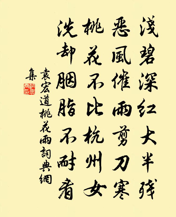 詩詞名句歷史字典書法欣賞書法字典國語詞典說文解字康熙字典古漢語字典標 題 作 者 詩 句 桃花雨作者:袁宏道 朝代:明代桃花雨原文淺碧深紅大半殘,惡風催雨剪刀寒。桃花不比杭州女,洗卻胭脂不耐看。詩詞問答問:桃花雨的作者是誰?答:袁宏道問:桃花雨寫於哪個朝代?答:明代袁宏道桃花雨書法欣賞桃花雨書法作品詩詞推薦竭陸宣公祠林景熙〔宋代〕冰玉為骨秋為神,堂堂內相真天人。諫草數百垂清芬,仁義一洗功利塵。刳肝瀝血空排雲,白日不鑒吾忠勤。奉天盛開梅方蒙仲〔宋代〕爛熳不須憐,搖落尤佳致。身臥積蘚中,受事天富貴。十分香色十分清,搖落都從盛處生。物理盈虛例如此,世間過弋陽趙師秀〔宋代〕三月三番過弋陽,吾生辛苦莫思量。磨圓灘石几年浪,丹盡江楓昨夜霜。已算中途當度臘,更憐抵舍未為鄉。高眠和李時發春日見寄孔武仲〔宋代〕聞道重湖路未通,悠然身在碧湘中。崎嶇水國猶千里,牢落春花已半空。江浪濺寒侵小睡,岳雲篩雨音疏篷。君詩頌古一○一首釋子淳〔宋代〕雲自高飛水自流,海天空闊泳孤舟。夜深不向蘆灣宿,迥出中間與兩頭。及第後憶舊山白居易〔唐代〕偶獻子虛登上第,卻吟招隱憶中林。春蘿秋桂莫惆悵,縱有浮名不繫心。琴齋乃予舊居以琴名齋吾為之也項先生與諸生張繼先〔宋代〕琴齋高致有真風,山合延賓未折中。來問死生非碌碌,為談莊老肯匆匆。喜今可與君還往,惜昨曾留客許同。處士寄盧致遠陳著〔宋代〕春來日日雪滿山,雪晴初放春風還。高人佳處獨先得,挼藍新漲溪一灣。垂楊隔岸竹隔水,梅花飛香莎草斑。市聲重過京口黃彥平〔宋代〕江北江南形勝地,憶傷遊子少年心。無波分楊柳邊碧,月帶薔薇笑里陰。鐵瓮只今雖料理,金山久已罷登臨。寄聲妙庭觀二首謝伋〔宋代〕雲軿一去遠難追,丹鼎埋光固不疑。承露仙人辭漢後,幾重深杳隔瑤池。邵武葉儀鳳〔宋代〕溪上千峰碧玉環,瞰溪台榭紫雲間。鳥啼花落非人世,似在金鰲山上山。送春趙友直〔宋代〕宿雨淹無霽,落花翠點苔。東君今日去,借問幾時回。西湖晚望釋斯植〔宋代〕久雨初晴睡正長,春蛙鳴遍舊池塘。小亭寂寞斜陽里,一陣東負過木香。挽趙東岩簡叔彥侯四首王邁〔宋代〕建炎戎馬滿神京,殿撰橫身活一城。時宰忌功無表勸,老天福善自分明。人稱簪紱一門盛,公是瑛瑤間世生。珍重己丑新年洪咨夔〔宋代〕幾度椒花頌歲朝,今年心事最蕭條。官雖有路猶窮轍,住豈無家卻寄巢。金盡床頭顏易改,樽空座上客難招。一般趙尉送菜方岳〔宋代〕山雲一塢住山翁,菘韭成畦帶雪忪。飛食肉奚關我事,乳蒸豚亦為誰供。衡茅高枕人間世,蓑笠歸鋤雨外峰。曾讀頌古十七首釋道行〔宋代〕土埋處處鐵菱角,半夜經由未覺難。天曉嶺根傷中倒,方知行過鐵門關。回程泗州道中虞儔〔宋代〕淮北燕南昔混同,相望卻恨馬牛風。往來未省誰為伴,言語從來自不通。百歲遺民悉緒外,數聲羌笛夢魂中。徑須用王司理韻送別二首洪咨夔〔宋代〕亨衢方四十,滿謂乃翁如。為底澼洸藥,依然城旦書。光塵風物裹,訊息事情初。束起東西玉,功名富貴余。送張南史戴叔倫〔唐代〕陋巷無車轍,煙蘿總是春。賈生獨未達,原憲竟忘貧。草座留山月,荷衣遠洛塵。最憐知己在,林下訪閒人。名句推薦惟將終夜常開眼,報答平生未展眉。元稹《遣悲懷三首·其三》 凍風時作,作則飛沙走礫。袁宏道《滿井遊記》 東風隨春歸,發我枝上花。李白《落日憶山中》 思則有備,有備無患左丘明《左傳·襄公·襄公十一年》 白鳥悠悠自去,汀洲外、無限蒹葭。王國維《滿庭芳·水抱孤城》 斜日更穿簾幕,微涼漸入梧桐。晏殊《破陣子·燕子欲歸時節》 深秋簾幕千家雨,落日樓台一笛風。杜牧《題宣州開元寺水閣閣下宛溪夾溪居人》 桂棹兮蘭枻,斵冰兮積雪;屈原《九歌》 又有牆頭千葉桃,風動落花紅蔌蔌。元稹《連昌宮詞》 海棠枝上立多時,飛向小橋西畔去。宋徵輿《玉樓春·燕雕樑畫棟原無數》