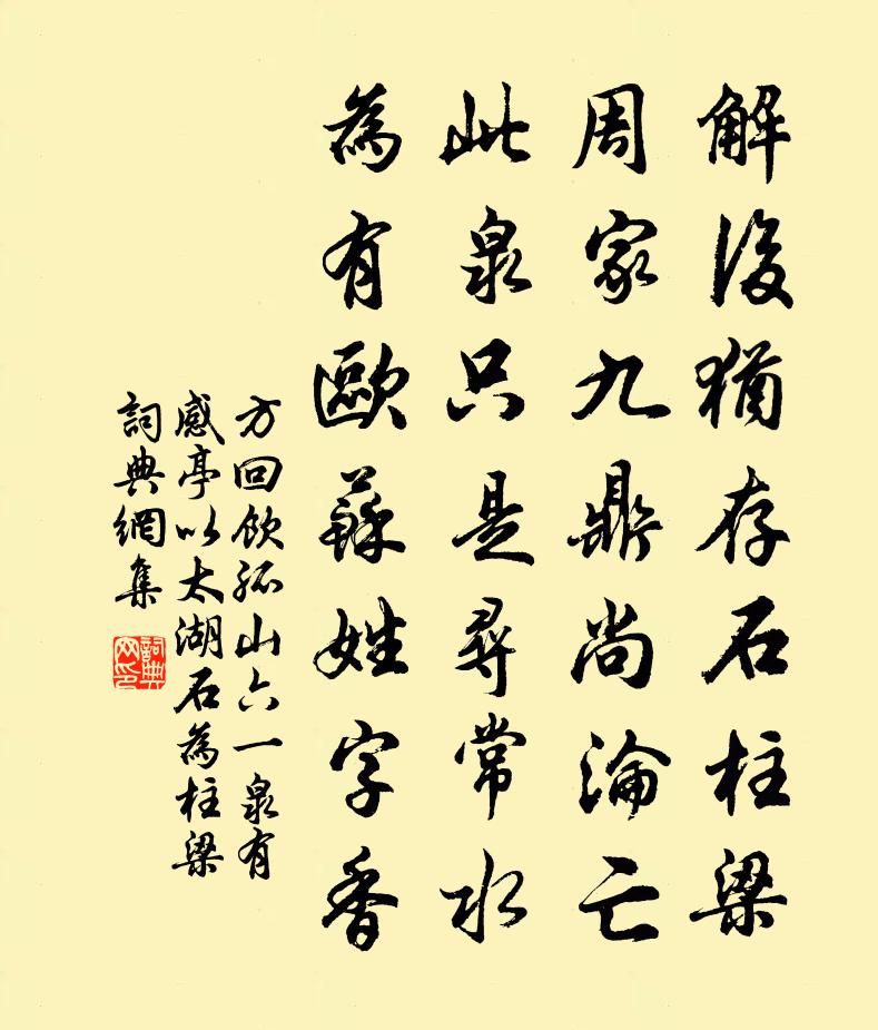 詩詞名句歷史字典書法欣賞書法字典國語詞典說文解字康熙字典古漢語字典標 題 作 者 詩 句 飲孤山六一泉有感亭以太湖石為柱樑作者:方回 朝代:宋代原文解後猶存石柱樑,周家九鼎尚淪亡。此泉只是尋常水,為有歐蘇姓字香。詩詞問答問:《飲孤山六一泉有感亭以太湖石為柱樑》的作者是誰?答:方回問:該詩寫於哪個朝代?答:宋代書法欣賞飲孤山六一泉有感亭以太湖石為柱樑書法作品詩詞推薦王德言樞密生日十首曹勛〔宋代〕每喜高情語甚真,讜言亹亹贊天鈞。不殊林下忘形態,定是因是地位人。雨後淨望河西連山愴然成詠李德裕〔唐代〕宿雨初收晚吹繁,秋光極目自銷魂。煙山北下歸遼海,鴻雁南飛出薊門。只恨無功書史籍,豈悲臨老事戎軒。唯懷被劾方岳〔宋代〕誰將物命作勤渠,黃雀頭行萬里余。每為世情三太息,不知吾亦是苞苴。玉抱肚佚名〔宋代〕若論玄妙,聽周風一訣。把嬰兒奼女,木金間隔。從頭分別。先擒六賊三屍滅。後捉玉兔飲鳥烏血。仗劍鋒,麾魔南軒羅必元〔宋代〕萬松盤嶺勢迴環,才抱青溪浸碧山。莫道南軒專一壑,古今天下共曾顏。短燈檠歌韓愈〔唐代〕長檠八尺空自長,短檠二尺便且光。黃簾綠幕朱戶閉,風露氣入秋堂涼。裁衣寄遠淚眼暗,搔頭頻挑移近床。太學好事近(甲申春益昌作)李曾伯〔宋代〕春在粉牆西,牆裡不知春色。惟有桃花一樹,似故園曾識。晚來攜客上南樓,山外又山隔。準擬清明何處,問東風奉和聖制喜雪應制宗楚客〔唐代〕飄飄瑞雪下山川,散漫輕飛集九埏。似絮還飛垂柳陌,如花更繞落梅前。影隨明月團紈扇,聲將流水雜鳴弦。共荷郡中西園白居易〔唐代〕閒園多芳草,春夏香靡靡。深樹足佳禽,旦暮鳴不已。院門閉松竹,庭徑穿蘭芷。愛彼池上橋,獨來聊徙倚。魚依縱筆二首劉克莊〔宋代〕發似秋霜身槁枝,相逢驚怪此翁誰。能啖范丈齏鹽日,曾識荊公疥癬時。不待姓名尊德齒,要知戒臘□鬚眉。融修句張環〔宋代〕人間獨有當時月,山際獨無後世樵。句楊炎正〔宋代〕吟詩報答閒。代崔家送客李賀〔唐代〕行蓋柳煙下,馬蹄白翩翩。恐隨行處盡,何忍重揚鞭。出都來陳,所乘船上有題小詩八首,不知何人蘇軾〔宋代〕煙火動村落,晨光尚熹微。田園處處好,淵明胡不歸。三和劉克莊〔宋代〕交疏認鹿為山友,客少呼猿作野賓。藏手澤書慚忝祖,食躬耕粟恥求人。腹無點墨寧非懶,腰有重金未是貧。已把南坡口號十八首鄭清之〔宋代〕紅紅白白共枝榮,怪底山茶有寧馨。倩得司花來判斷,不妨一姓養螟蛉。贈王順之歌晁補之〔宋代〕王郎見若不勝衣,眇然儒者未有奇。我知王郎有奇處,議論濤海拏蛟螭。由周而來逮五季,故事本朝能盡知。不惟歡喜吟邵雍〔宋代〕日往月來,終則有始。半行天上,半下地底。照臨之間,不憂則喜。予何人哉,歡喜不已。題贈宣州亢拾遺項斯〔唐代〕傳騎一何催,山門晝未開。高人終避世,聖主不遺才。坐次欹臨水,門中獨舉杯。誰為旦夕侶,深寺數僧來。從丘十四借韓文二首黃庭堅〔宋代〕吏部文章萬世,吾求善本編窺。散帙雲窗棐幾,同安得見丘遲。名句推薦積雪覆平皋,飢鷹捉寒兔。孟浩然《南歸阻雪》 曉雞驚樹雪,寒鶩守冰池。李商隱《幽居冬暮》 花隱掖垣暮,啾啾棲鳥過。杜甫《春宿左省》 玉人垂釣理纖鉤。月明池閣夜來秋。吳文英《浣溪沙·秋情》 天下大勢,分久必合,合久必分。羅貫中《三國演義·第一回》 嗟余聽鼓應官去,走馬蘭台類轉蓬。李商隱《無題·昨夜星辰昨夜風》 東風灑雨露,會入天地春。李白《送郄昂謫巴中》 激氣已能驅粉黛,舉杯便可吞吳越。史達祖《滿江紅·中秋夜潮》 白日淪西河,素月出東嶺。陶淵明《雜詩十二首·其二》 承恩不在貌,教妾若為容。杜荀鶴《 * 怨》