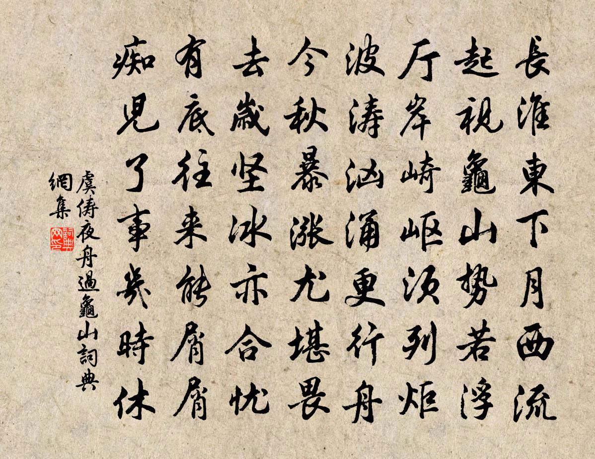 詩詞名句歷史字典書法欣賞書法字典國語詞典說文解字康熙字典古漢語字典標 題 作 者 詩 句 夜舟過龜山作者:虞儔 朝代:宋代夜舟過龜山原文長淮東下月西流,起視龜山勢若浮。廳岸崎嶇須列炬,波濤洶湧更行舟。今秋暴漲尤堪畏,去歲堅冰亦合憂。有底往來能屑屑,痴兒了事幾時休。詩詞問答問:夜舟過龜山的作者是誰?答:虞儔問:夜舟過龜山寫於哪個朝代?答:宋代虞儔夜舟過龜山書法欣賞夜舟過龜山書法作品詩詞推薦問四皓王禹偁〔宋代〕四冢累累豈是仙,避秦安滿道空全。紫芝探處應辛苦,何似腰金食萬錢。寒食日過棗團店白居易〔唐代〕寒食棗團店,春低楊柳枝。酒香留客住,鶯語和人詩。困立攀花久,慵行上馬遲。若為將此意,前字與僧期。南鄉子(有感)蘇軾〔宋代〕冰雪透香肌。姑射仙人不似伊。濯錦江頭新樣錦,非宜。故著尋常淡薄衣。暖日下重幃。春睡香凝索起遲。曼倩風送懷秀禪者釋重顯〔宋代〕 * 花草座思靈花徹,一食安閒更無別,倏忽遷流數百年,杳杳誰來繼其絕。吾兮亦是疏慵輩,冷淡身心存慷愷。方仙翁祠方有開〔宋代〕真仙祠館鎖層嵐,下瞰平疇十里寬。譜牒尚標唐篆額,風儀仍是漢衣冠。紫芝白兔靈如昨,石碣丹湖事不刊。千古敬報孫常州二首戴叔倫〔唐代〕衰病苦奔走,未嘗追舊遊。何言問憔悴,此日駐方舟。遠道曳故屐,餘春會高齋。因言別離久,得盡平生懷。頌證道歌證道歌釋印肅〔宋代〕非則善星生陷墜,廣說不明宗正理。名聞利養接群機,業滿生沈無間底。和仲良春晚即事楊萬里〔宋代〕筍改齋前路,蔬眠雨後畦。晴江明處動,遠櫥看來齊。我語真雕朽,君詩妙斫泥。殷勤報春去,恰恰一鶯啼。再和宿囊山三首劉克莊〔宋代〕恰似病沙門退院,又如老禪錄歸農。素無才調宴三閣,不願歌詞傳六宮。萬首漏名宗派農,百年占籍醉鄉中。暮齡鄞城火後見光遠戴表元〔宋代〕火後丘墟市,兵前風雨春。那知攜手地,俱是皺眉人。海柳吟猶弱,山鶯聽未真。明朝各分路,何處避風塵。樵父詞儲光羲〔唐代〕山北饒朽木,山南多枯枝。枯枝作採薪,爨室私自知。詰朝礪斧尋,視暮行歌歸。先雪隱薜荔,迎暄臥茅茨。清澗阮郎歸(做姜堯章體)黃升〔宋代〕粉香吹暖透單衣。金泥雙鳳飛。間來花下立多時。春風酒醒遲。桃葉曲,柳枝詞。芳心空自知。湘皋月冷佩聲微。送王誕渤海使赴李太守行營韓翃〔唐代〕少年結客散黃金,中歲連兵掃綠林。渤海名王曾折首,漢家諸將盡傾心。行人去指徐州近,飲馬回看泗水深。喜見新荷葉(金陵府會鼓子詞)侯置〔宋代〕柳幄飛綿,風池暖泛新萍。燕壘泥香,玉麟堂外春深。晴雲麗日,花濃處、蜂蝶紛紛。償春一醉,管弦聲里歡聲。奉使契丹二十八首其二十二學士院端午帖子二蘇轍〔宋代〕溽暑避華構,清風迎早朝。楓槐高自舞,冰雪晚初消。夷陵張仲孚以荊州無山為戲輒書二絕鄭獬〔宋代〕使君終日倚朱欄,綠樹高樓掩映間。自有碧江無限好,荊州佳境不須山。久過重陽菊英粲然即事十首方回〔宋代〕有酒泛菊釂美酒,無酒嗅菊倚闌乾。時人誰會先生意,常把霜枝子細看。陳後宮李商隱〔唐代〕玄武開新苑,龍舟宴幸頻。渚蓮參法駕,沙鳥犯句陳。壽獻金莖露,歌翻玉樹塵。夜來江令醉,別詔宿臨春。玉堂感舊宋祁〔宋代〕七年辭玉署,再入佐黃扉。樹與青春換,人將素領歸。磚花仍可記,廈雀稍驚飛。爐蕙非無意,逢人尚襲衣。醉中示梅山弟二首陳著〔宋代〕夜鐙曾醉藕花涼,{上竹下鋰}擔歸來雨亦香。閒里不妨長聚首,人生能得幾斜陽。名句推薦雁啼紅葉天,人醉黃花地,芭蕉雨聲秋夢裡。張可久《清江引·秋懷》 無常亂之國,無不可理之民者。吳兢《貞觀政要·卷五· * 平》 下馬飲君酒,問君何所之?王維《送別》 施惠勿念,受恩莫忘。朱柏廬《朱子家訓·全文》 秋風萬里芙蓉國,暮雨千家薜荔村。譚用之《秋宿湘江遇雨》 輪匠執其規、矩,以度天下之方圓墨子《墨子·天志(上)》 年來腸斷秣陵舟,夢繞秦淮水上樓王士禎《秦淮雜詩二十首·其一》 傍鄰聞者多嘆息,遠客思鄉皆淚垂。李頎《聽安萬善吹觱篥歌》 調角斷清秋,征人倚戍樓。張喬《書邊事》 相送巴陵口,含淚上舟行。陳子龍《三洲歌》