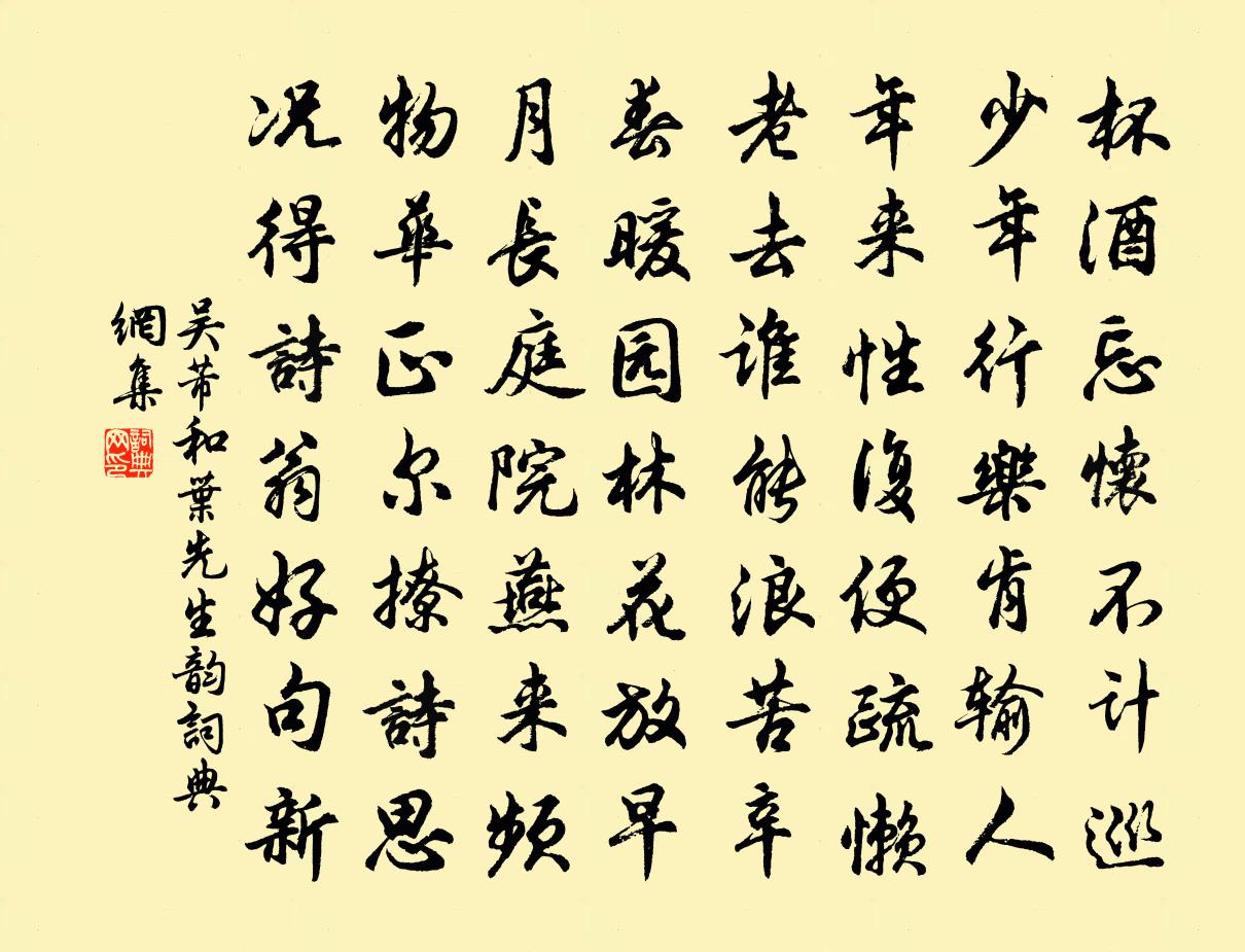 詩詞名句歷史字典書法欣賞書法字典國語詞典說文解字康熙字典古漢語字典標 題 作 者 詩 句 和葉先生韻作者:吳芾 朝代:宋代和葉先生韻原文杯酒忘懷不計巡,少年行樂肯輸人。年來性復便疏懶,老去誰能浪苦辛。春暖園林花放早,月長庭院燕來頻。物華正爾撩詩思,況得詩翁好句新。詩詞問答問:和葉先生韻的作者是誰?答:吳芾問:和葉先生韻寫於哪個朝代?答:宋代吳芾和葉先生韻書法欣賞和葉先生韻書法作品詩詞推薦七歌效杜陵體丘葵〔宋代〕我生辰逢亂離,四方蹙蹙何所之。欲登山兮有虎豹,欲入海兮有蛟螭。歸來歸來磨兜堅,毋與蛟斗兮毋充虎飢。嗚良鄉范成大〔宋代〕新寒凍指似排簽,村酒雖酸未可嫌。紫爛山梨紅皺棗,總輸易栗十分甜。送明老游雁盪五首吳芾〔宋代〕方欣林下共談禪,底事深公挽出山。千里同風無道俗,何妨一笑便言還。竹溪直院盛稱起予草堂詩之善暇日覽之多有可劉克莊〔宋代〕治化無深淺,要諸久始知。遺民它日淚,太傅向來碑。反袂緣何事,輕裘若在時。勛名一片石,尸祝百年思。不比菩薩蠻 舟次青神李齊賢〔元代〕長江日落煙波綠。移舟漸近青山曲。隔竹一燈明。隨風百丈輕。夜深篷底宿。暗浪鳴琴築。夢與白鷗盟。朝來莫漫滿江紅·金陵懷古薩都剌〔元代〕六代豪華,春去也、更無訊息。空悵望,山川形勝,已非疇昔。王謝堂前雙燕子,烏衣巷口曾相識。聽夜深、寂寞暮雨梅堯臣〔宋代〕水上魚,吹白露。山頭雲,與龍附。潭中水作潭中雨,朱鱉飛過吳洲去。鯉魚相隨不知數,老蛤銜泥在深處。東帥張傳之遣人來相致將以七言次韻答之三首李壁〔宋代〕閬風當日奉清樽,猶記銀鉤酒七言。別去淒涼渾一夢,只今疎懶且衡門。已非絕足那希驥,自比游塵或佐鯤。珍重洞仙歌 辛巳歲燕城初度張翥〔元代〕功名利達,任紛紛奔競。縱使得來也僥倖。老眼看多時,鐘鼎山林,須信道、造物安排有命。人生行樂耳,對月臨書事寄呈斯遠趙蕃〔宋代〕路熟疑為短,馬遲翻更長。野田吹欲合,林日凍無光。未暇親書案,頻成喚酒觴。短檠今夕念,我友正相望。頌古十六首釋明辯〔宋代〕黃金鑿,白玉椎。開開混沌竅,透出玄出機。和渙之深秋月夜書事狄遵度〔宋代〕洞庭葉下涼颼颼,凍天頑白凝不流。圓月擬缺不忍缺,輕露欲浮終未浮。憶吹朱籟鳳軿上,更采紫芝雲嶠陬。玉樓送熊主簿劉克莊〔宋代〕邑事多商榷,惟詩未暇論。母慈催扇枕,父老謾攀轅。新戌謀何地,初程宿某村。西風有來雁,書札儻相存。柳絮二絕洪咨夔〔宋代〕風標清白難諧俗,氣候中和易得朋。招不肯來麾不去,若無才思渠應能。題安州浮雲寺樓寄湖州張郎中杜牧〔唐代〕去夏疏雨餘,同倚朱闌語。當時樓下水,今日到何處。恨如春草多,事與孤鴻去。楚岸柳何窮,別愁紛若絮。夢遊洛中十首蔡襄〔宋代〕名花百種結春芳,天與穠華更與香。每憶月陂隄下路,便開圖畫覓姚黃。正仲入鄞敘懷送別二首1舒岳祥〔宋代〕遇事無心心自放,如今心事放尤難。酒開愁緒湯澆雪,書潤枯腸火養丹。欹枕啼鴉分曉色,把杯歸雁破春寒。君來春晚客懷 其七王冕〔元代〕賈誼治安策,虛勞瀆聖明。人民正凋瘵,豺虎恣縱橫。白水沈南國,青山沒上京。吾儒無可奈,老淚向天傾。送袁偁盧綸〔唐代〕諫獵名空久,多因病與貧。買書行幾市,帶雨別何人。客路山連水,軍州日映塵。淒涼一分手,俱恨老相親。遊春台詩春台仙〔唐代〕玉幢亘碧虛,此乃真人居。裴回仍未進,邪省猶難除。日落煙水黯,驪珠色豈昏。寒光射萬里,霜縞遍千門。玉魄名句推薦酒盈杯,書滿架,名利不將心掛。李珣《漁歌子·荻花秋》 不以規矩,不能成方圓孟子《孟子·離婁章句上·第一節》 出塞入塞寒,處處黃蘆草。王昌齡《塞下曲四首》 而浮生若夢,為歡幾何?李白《春夜宴桃李園序 / 春夜宴從弟桃花園序》 烏絲闌紙嬌紅篆,歷歷春星。納蘭性德《紅窗月·燕歸花謝》 夜聽胡笳折楊柳,教人意氣憶長安。王翰《涼州詞二首》 兒童相見不相識,笑問客從何處來。賀知章《回鄉偶書二首·其一》 善惡同,則功臣倦。黃石公《三略·上略》 止戈為武。左丘明《左傳·宣公·宣公十二年》 有美一人,清揚婉兮。佚名《野有蔓草》