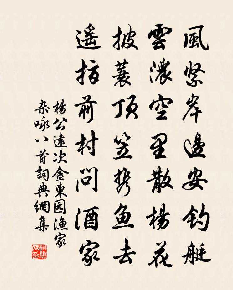 詩詞名句歷史字典書法欣賞書法字典國語詞典說文解字康熙字典古漢語字典標 題 作 者 詩 句 次金東園漁家雜詠八首作者:楊公遠 朝代:宋代次金東園漁家雜詠八首原文風緊岸邊安釣艇,雲濃空里散楊花。披蓑頂笠攜魚去,遙指前村問酒家。詩詞問答問:次金東園漁家雜詠八首的作者是誰?答:楊公遠問:次金東園漁家雜詠八首寫於哪個朝代?答:宋代楊公遠次金東園漁家雜詠八首書法欣賞次金東園漁家雜詠八首書法作品詩詞推薦鳳山西亭戲書釋紹嵩〔宋代〕日日西亭上,憑欄取次看。繞崖雲慘慘,浥屨露團團。晝景委紅葉,松香掩白檀。平生勳業意,開鏡影相懽。越中五詠林概〔宋代〕越絕煙光隱翠微,蘭亭春色送行衣。風清漢相鳴樵徑,台古任公落釣磯。繡被歌殘人竟遠,桃花源靜客忘歸。憑君別舍弟宗一柳宗元〔唐代〕零落殘魂倍黯然,雙垂別淚越江邊。一身去國六千里,萬死投荒十二年。桂嶺瘴來雲似墨,洞庭春盡水如天。欲知戲答聖俞持燭之句歐陽修〔宋代〕辱君贈我言雖厚,聽我酬君意不同。病眼自憎紅蠟燭,何人肯伴白須翁。花時浪過如春夢,酒敵先 * 下風。惟有乍歸九首劉克莊〔宋代〕手種梅無恙,蒼苔滿樹身。可憐開較早,不待遠歸人。送鄭侍郎騫赴闕貫休〔唐代〕文章國器盡琅玕,朝騎駸駸歲欲殘。彩筆只宜天上用,繡衣偏稱雪中看。休驚斷雁離三楚,漸入祥煙下七槃。翰苑和陶飲酒二十首蘇軾〔宋代〕民勞吏無德,歲美天有道。暑雨避麥秋,溫風送蠶老。三咽初有聞,一溉未濡槁。詔書寬積欠,父老顏色好。再拜震山岩羅克開〔宋代〕身倚層岩興莫窮,若為鬱郁在樊籠。故人話別傷心裡,尊酒論文醉眼中。萬井疊鱗煙靄暝,一江如練水雲同。衛公懷激發尚書伯紀李伯玉〔宋代〕一曲清歌一弄琴,十千美酒十分斟。江流不動潮初上,斗柄將垂夜向深。沙觜露溥孤鶴警,潭心月冷老龍吟。此時榴花洞魏萬〔唐代〕江山巧秀入禪扃,四望仙源畫未真。萬疊好峰侵碧落,一條流水隔紅塵。潤邊鹿跡知何代,洞口榴花鎮似春。自恨夜聞雪聲鄭剛中〔宋代〕怒號中夜忽收聲,枯葉寒梢細細鳴。曉起一杯檐外立,滿階無處認梅英。次韻瀛倅鄧慎思見寄孔武仲〔宋代〕官是麟台卻佐州,蓬瀛俱稱列仙遊。憶分曉色趨天闕,想對春風倚郡樓。書付塞鴻應易到,人如隴水正分流。江湖留題徐真君祠堂東西二室許將〔宋代〕上得山來過石門,謁靈特地乞真言。再三許我前程事,敢不留詩荷聖恩。楚州開元寺北院枸杞臨井繁茂可觀群賢賦詩因以繼和劉禹錫〔唐代〕僧房藥樹依寒井,井有香泉樹有靈。翠黛葉生籠石甃,殷紅子熟照銅瓶。枝繁本是仙人杖,根老新成瑞犬形。上品送游提刑秘閣赴召三首程公許〔宋代〕舊聞游監簿,姱節紹熙朝。有子登台省,危言動冕旒。不容求外補,親政復旌招。四海澄清志,無寧久使軺。一翦梅李綱〔宋代〕數點梅花玉雪嬌。煙水籬邊,半裊青梢。橫斜疏影月黃昏,誰使天香,暗淡飄飄。半醉佳人酒未消。寶髻偏時,插莫愁曲李賀〔唐代〕草生龍坡下,鴉噪城堞頭。何人此城裡,城角栽石榴。青絲系五馬,黃金絡雙牛。白魚駕蓮船,夜作十里游。歸來雲邊遣興劉宰〔宋代〕穴處堪忘世,松餐足永年。有時雲雨止,獨立看青天。生日又二首方回〔宋代〕畏途偶許玩餘生,晚節尤難保令句。一禿翁真韓長孺,五男兒可晉淵明。淒風開戶綿重著,漏雨濺應酬酒懶傾。俗虞美人·楚腰蠐領團香玉閻選〔唐代〕楚腰蠐領團香玉,鬢疊深深綠。月蛾星眼笑微嚬,柳妖桃艷不勝春,晚妝勻。水紋簟映青紗帳,霧罩秋波上。一枝名句推薦日暮詩成天又雪,與梅並作十分春。盧梅坡《雪梅·其二》 人善被人欺,馬善被人騎。佚名《增廣賢文·上集》 零落江南不自由。兩綢繆。料得吟鸞夜夜愁。姜夔《憶王孫·番陽彭氏小樓作》 寶馬雕車香滿路。辛棄疾《青玉案·元夕》 昔歲逢太平,山林二十年。元結《賊退示官吏》 關城榆葉早疏黃,日暮雲沙古戰場。王昌齡《從軍行七首》 乘人之車者載人之患,衣人之衣者懷人之憂,食人之食者死人之事。司馬遷《史記·七十列傳·淮陰侯列傳》 因風吹火,用力不多。佚名《增廣賢文·上集》 投宿駸駸征騎,飛雪滿孤村。孔夷《南浦·旅懷》 斷香殘酒情懷惡。西風催襯梧桐落。李清照《憶秦娥·詠桐》