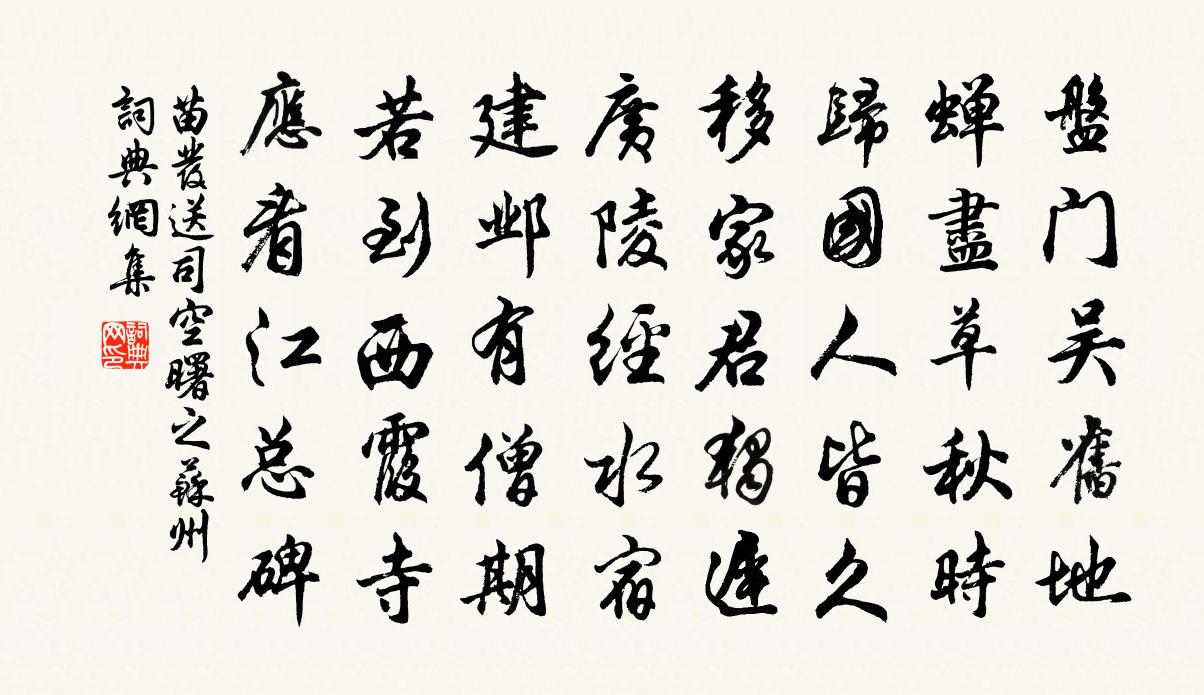 詩詞名句歷史字典書法欣賞書法字典國語詞典說文解字康熙字典古漢語字典標 題 作 者 詩 句 送司空曙之蘇州作者:苗發 朝代:唐代送司空曙之蘇州原文盤門吳舊地,蟬盡草秋時。歸國人皆久,移家君獨遲。廣陵經水宿,建鄴有僧期。若到西霞寺,應看江總碑。詩詞問答問:送司空曙之蘇州的作者是誰?答:苗發問:送司空曙之蘇州寫於哪個朝代?答:唐代問:送司空曙之蘇州是什麼體裁?答:五律苗傳送司空曙之蘇州書法欣賞送司空曙之蘇州書法作品注釋全唐詩:卷295_1詩詞推薦巴東秋風亭懷寇公孫應時〔宋代〕袖手窮山一少年,何曾有楚到澶淵。英雄正自無人識,蓋世功名卻偶然。何公橋蘇軾〔宋代〕天壤之間,水居其多。人之往來,如鵜在河。順水而行,雲馳鳥疾。維水之利,千里咫尺。亂流而涉,過膝則止。五雜俎范成大〔宋代〕五雜俎,流蘇縷。往復來,臨行語。不得已,上馬去。資韻答澗上丈人見寄晁說之〔宋代〕丈人一別今何闊,菊雨蘭風自歲年。茅屋歸來思敘舊,繩床老去不談禪。世無孔子徒為爾,今愧孫登重惘然。幸有採桑子晏幾道〔宋代〕征人去日殷勤囑,莫負心期。寒雁來時,第一傳書慰別離。輕春織就機中素,淚墨題詩。欲寄相思,日日高樓看雁菩薩蠻吳文英〔宋代〕綠波碧草長堤色。東風不管春狼藉。魚沫細痕圓。燕泥花唾乾。無情牽怨抑。畫舸紅樓側。斜日起憑闌。垂楊舞曉賦得池塘生春草(一作陳陶詩)陳潤〔唐代〕謝公遺詠處,池水夾通津。古往人何在,年來草自春。色宜波際綠,香愛雨中新。今日青青意,空悲行路人。念奴嬌(壽四十叔)廖行之〔宋代〕薰風庭院,報槐陰擁翠,池波凝綠。瑞氣蔥蔥浮燕寢,羽仗霓旌相屬。鸑鷟開祥,長庚入夢,詫列仙圖籙。林泉高太常引 送王嘉父王惲〔元代〕去年鞍馬客南*。柰告別,苦**。今歲又相逢。喜客舍、清尊*同。仲宣樓上,杜陵幕下,著處話途窮。好去漢園感方回〔宋代〕載培逾一紀,補苴又三年。樹倚根株在,花憑種子傳。斡移隨變幻,顛倒恣頗偏。縱不經兵革,誰能保十全。孤山梅後顧逢〔宋代〕晴雪白漫漫,山中幾樹殘。但知開處好,誰向落時看。影不隨流水,香猶在曲闌。飛來如靖鶴,相對立前灘。答曼叔見寄韓維〔宋代〕人生風波間,觸事喜乖隔。前君還里中,王事有程格。歡言不一再,歸馬已在軛。相期高陽秋,叢菊手共摘。惟時十七字詩佚名〔宋代〕駕幸景靈宮,諸生盡鞠躬。頭烏身上白,米蟲。偈頌三十八首釋如淨〔宋代〕天蒼蒼,地皇皇。鍾馗元是鬼,赤口並消亡。衲僧八面無門戶,今古寥寥白晝長。人家張耒〔宋代〕人家依古木,雞犬亂山深。積雪暗猶壯,寒雲晚易陰。斷荷欹凍水,孤月戰風林。稍稍棲烏定,飢啼何處禽。醉和顏美中元夕絕句趙釴夫〔宋代〕年年人月喜團圓,好在詩邊又酒邊。莫道玄真只漁釣,也隨世俗夜無眠。哭薛元善兄弟薛嵎〔宋代〕寂寞一窗燈,隨風滅又明。空堂連夜雨,白髮哭兒聲。樹色悲搖落,交情隔死生。唯應骨肉愛,為鬼亦同行。禁中春松陸贄〔唐代〕陰陰清禁里,蒼翠滿春松。雨露恩偏近,陽和色更濃。高枝分曉日,虛吹雜宵鍾。香助爐煙遠,形疑蓋影重。願符題彭澤縣尉廳林壑之勝葉適〔宋代〕彭澤西山天秘惜,淵明未敢發幽緘。始從石尉兼王尉,洗出前岩到後岩。也只暫時供步履,可能終老卸朝衫。應須頌古十一首釋普濟〔宋代〕電電喧轟海岱昏,怒濤翻覆拍天門。錦鱗不會乘流去,空向桃花浪里奔。名句推薦天生我材必有用,千金散盡還復來。李白《將進酒》 銀燭秋光冷畫屏,輕羅小扇撲流螢。杜牧《秋夕》 凡大事皆起於小事,小事不論,大事又將不可救吳兢《貞觀政要·卷一·論政體》 爽口物多終作疾,快心事過必為殃。馮夢龍《喻世明言·卷三》 今之孝者,是謂能養。至於犬馬皆能有養;不敬,何以別乎?孔子弟子《論語·為政篇》 山際見來煙,竹中窺落日。吳均《山中雜詩》 雞鳴紫陌曙光寒,鶯囀皇州春色闌。岑參《奉和中書舍人賈至早朝大明宮》 以此虧奪民衣食之財,仁者弗為也。墨子《墨子·32章 非樂(上)》 雌雄空中鳴,聲盡呼不歸。白居易《燕詩示劉叟》 竹徑通幽處,禪房花木深。常建《題破山寺後禪院》