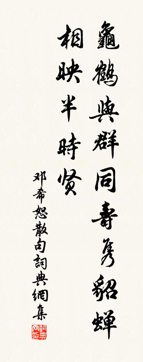 詩詞名句歷史字典書法欣賞書法字典國語詞典說文解字康熙字典古漢語字典標 題 作 者 詩 句 句作者:鄧希恕 朝代:宋代句原文龜鶴與群同壽雋,貂蟬相映半時賢。詩詞問答問:句的作者是誰?答:鄧希恕問:句寫於哪個朝代?答:宋代鄧希恕句書法欣賞句書法作品詩詞推薦紅樓院應制(一作僧廣宣詩)沈佺期〔唐代〕紅樓疑見白毫光,寺逼宸居福盛唐。支遁愛山情謾切,曇摩泛海路空長。經聲夜息聞天語,爐氣晨飄接御香。誰謂成都運司西園亭詩海棠軒許將〔宋代〕海棠冠蜀花,此軒花尤冠。紅雲簇蕊細,淥水照葉嫩。倚妝宮粉聚,疊綺霞光散。雨淚點春風,應懷上林怨。句成銳〔宋代〕彩檻應無分,春風不借恩。次徐相公韻十首李顯忠釋行海〔宋代〕五丈高原躍戰鞍,同州太守舊藩官。路挑野斗皈南急,旗獵風鳴帶北寒。採石盤中兵膽涌,橘紅袍上箭痕乾。雞豚欲自邯鄲趨府復從中山行覺風異常馬上作晁說之〔宋代〕山行豈不惡,清音興自長。風從嶻嶪來,不比人間涼。浮涼夸湛露,屈子自悲傷。披襟青苹末,玉也媚君王。驩見次韻子云歸興韓元吉〔宋代〕湖海週遊未卜居,好山時一夢衡廬。苦無事業堪調鼎,薄有生涯可負鋤。玩世阮公方蠟屐,歸田陶令亦巾車。屋頭天台陳石居出乃祖梅隱先生遺稿其序中所載與呂勝之〔宋代〕臨文增太息,復見此人不。義重千金諾,身輕萬里游。好詩今寡和,壯志古難酬。一盞梅花露,年年薦隴頭。雨中贈仙人山賈山人(即賈鵬也)柳宗元〔唐代〕寒江夜雨聲潺潺,曉雲遮盡仙人山。遙知玄豹在深處,下笑羈絆泥塗間。送相里燭方乾〔唐代〕相逢未作期,相送定何之。不得長年少,那堪遠別離。泛湖乘月早,踐雪過山遲。永望多時立,翻如在夢思。內司毀林建寺淳佑士人〔宋代〕合抱長村臥壑深,於今惟恨不空林。誰知廣廈千斤斧,斲盡人間孝子心。次韻蒲大受書懷十首郭印〔宋代〕物齊人即我,天運古猶今。但得丹田固,寧憂白髮侵。情忘心坦坦,神定息深深。卻笑靈均輩,悲哀澤畔吟。採蓮令·月華收柳永〔宋代〕月華收,雲淡霜天曙。西征客、此時情苦。翠娥執手送臨歧,軋軋開朱戶。千嬌面、盈盈佇立,無言有淚,斷腸爭讀崔昭緯傳張嵲〔宋代〕季末慆憂事可嗟,本根已撥尚肥家。那堪事異荀文若,空費君王十四車。壽廣東帥潘直閣曾豐〔宋代〕太初談赤松,中古說黃石。笑策導引勛,須鬢白成黑。金華得道人,綴自仙之籍。雖因習墮緣,久悟空為色。泥丸句仲昂〔宋代〕平生不識巴南路,夢到孤雲兩角西。四威儀釋慧遠〔宋代〕行,日午歸來打八更,荒草裹,結舌話無生。西江月(十二之四)張伯端〔宋代〕若要真鉛留汞,親中不離家臣。木金間隔會無因。須仗媒人勾引。本 * 金順義,金情戀木慈仁。相吞相陷卻相親擬和御製郊祀詩李洪〔宋代〕郊禋饗帝就圜丘,誠格蒼穹靈既留。夜陟紫壇飈馭下,天臨黃道矞雲浮。槐林雙闕恩方渙,禾黍三登歲有秋。幸睹送韓十四被魯王推遞往濟南府崔國輔〔唐代〕西候情何極,南冠怨有餘。梁王雖好士,不察獄中書。醉蓬萊(慶壽)趙鼎〔宋代〕破新正春到,五葉堯蓂,弄芳初秀。翦彩然膏,燦華筵如晝。家慶圖中,老萊堂上,竟祝翁遐壽。喜氣歡容,光生名句推薦相知無遠近,萬里尚為鄰。張九齡《送韋城李少府》 從時者,猶救火、追亡人也,蹶而趨之,唯恐弗及。左丘明《國語·越語·越興師伐吳而弗與戰》 明月照高樓,流光正徘徊。曹植《七哀》 丈夫志,當景盛,恥疏閒。蘇舜欽《水調歌頭·滄浪亭》 一葉浮萍歸大海,為人何處不相逢!吳承恩《西遊記·第四十回》 中原事業如江左,芳草何須怨六朝。納蘭性德《秣陵懷古·山色江聲共寂寥》 四顧山光接水光,憑欄十里芰荷香。黃庭堅《鄂州南樓書事》 漸紅濕杏泥,愁燕無語。吳文英《掃花游·西湖寒食》 將入門,問孰存。將上堂,聲必揚。李毓秀《弟子規·謹》 長風連日作大浪,不能廢人運酒舫。元結《石魚湖上醉歌》