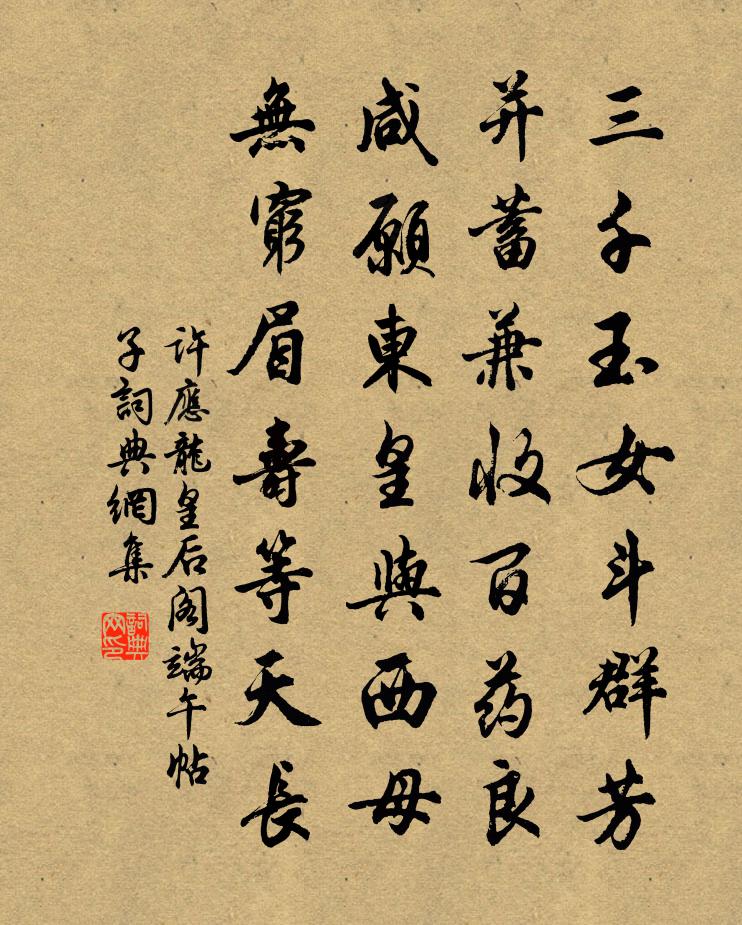 詩詞名句歷史字典書法欣賞書法字典國語詞典說文解字康熙字典古漢語字典標 題 作 者 詩 句 皇后閣端午帖子作者:許應龍 朝代:宋代皇后閣端午帖子原文三千玉女斗群芳,並蓄兼收百藥良。鹹願東皇與西母,無窮眉壽等天長。詩詞問答問:皇后閣端午帖子的作者是誰?答:許應龍問:皇后閣端午帖子寫於哪個朝代?答:宋代許應龍皇后閣端午帖子書法欣賞皇后閣端午帖子書法作品詩詞推薦訣別偈湯道亨〔宋代〕八十一年饒舌,終日化緣不歇。重陽時節歸家,一路清風明月。頌古五十三首釋文禮〔宋代〕不作青黃見,其如稻穗何。鵝王能擇乳,鷂子過新羅。讀項羽傳二首釋智圓〔宋代〕發歡虞姬拋已窮,烏江此夕喪英雄。當時若也知天命,佐漢應居第一功。寄題王才臣南山隱居六首竹亭魏了翁〔宋代〕西山抱孤潔,淇水凝寒綠。古來長安道,多少閒草木。解蹀躞方千里〔宋代〕院宇無人晴晝,靜看簾波舞。自憐春晚,漂流尚羈旅。那況淚濕征衣,恨添客鬢,終日子規聲苦。動離緒。謾徘徊八月五日妙寂道中陳宓〔宋代〕漫漫紅紫是誰栽,八月春風暗裡來。過眼紛紛難盡憶,殷勤卻看稻花開。江上送客游廬山張繼〔唐代〕楚客自相送,沾裳春水邊。晚來風信好,並發上江船。花映新林岸,雲開瀑布泉。愜心應在此,佳句向誰傳。頌古九首釋梵思〔宋代〕喚應尋常誰不曉,及乎按劍總茫然。分明好個神仙訣,父子從來不許傳。挽提宮知丞周公喻良能〔宋代〕妙齡馳譽滿東吳,落筆驊騮走坦途。四十年來鳴道學,一千人內最群儒。二松不負經綸志,三逕真成隱遁娛。老我筍籜筆詩李廌〔宋代〕琅玕夭嬌排霄去,敗籜平階聊貯儲。付與管城湯沐地,何鬚毛穎號中書。旅店早起薛嵎〔宋代〕半醒夢猶在,擁衾無限情。曉窗燈影淡,山路雪吟清。歲暮羨歸客,囊空兼去程。故書多廢理,驚愧動驚旌。劉生江總〔隋代〕劉生負意氣。長肅且徘徊。高論明秋水。命賞陟春台。干戈倜儻用。筆硯縱橫才。置驛無年限。遊俠四方來。感懷董思恭〔唐代〕野郊愴新別,河橋非舊餞。慘日映峰沉,愁雲隨蓋轉。哀笳時斷續,悲旌乍舒捲。望望情何極,浪浪淚空泫。無復贈三局能師二絕蘇轍〔宋代〕旅食江乾秋復春,歸耕未遂不勝貧。憑師細考何年月,可買山田養病身。詠菖蒲釋惠明〔宋代〕根下塵泥一點無,性便泉石愛清孤。當時不惹湘江恨,葉葉如何有淚珠。聞春遠特丹盛開范成大〔宋代〕東軒聞道有花開,痴坐三椽首謾回。縱得好晴猶懶看,那堪風雨揭天來。應詔內苑牡丹三首雙頭宋祁〔宋代〕化工憑協氣,花品效尤祥。旖旎雙苞艷,氤氳一種香。參差迎夕露,左右傃朝陽。有意同緗幹,無言並絳房。萬靈跋晦翁游大隱屏詩李呂〔宋代〕晦公詞翰妙天下,可見元無一點塵。為問爭珠誰得者,須還真心趯倒淨瓶人。添字浣溪沙(用前韻謝傳岩叟餽名花鮮罩)辛棄疾〔宋代〕楊柳溫柔是故鄉。紛紛蜂蝶去年場。大率一春風雨事,最難量。滿把攜來紅粉面,堆盤更覺紫芝香。幸自曲生閒去送友人棄官歸山居雍陶〔唐代〕不愛人間紫與緋,卻思松下著山衣。春郊雨盡多新草,一路青青蹋雨歸。名句推薦楊柳青青著地垂,楊花漫漫攪天飛。佚名《送別詩》 桃未芳菲杏未紅,沖寒先喜笑東風。曹雪芹《詠紅梅花得“紅”字》 馬嘶芳草遠,高摟簾半掩。顧敻《醉公子·岸柳垂金線》 利莫長乎簡,福莫久於安。韓非及後人《韓非子·大體》 淚濕羅巾夢不成,夜深前殿按歌聲。白居易《後宮詞》 失之東隅,收之桑榆。范曄《後漢書·列傳·馮岑賈列傳》 萬里歸來顏愈少,微笑,笑時猶帶嶺梅香。蘇軾《定風波·南海歸贈王定國侍人寓娘》 長條短葉翠濛濛,才過西風,又過東風。夏完淳《一剪梅·詠柳》 磧里征人三十萬,一時回向月明看。李益《從軍北征》 誰念西風獨自涼,蕭蕭黃葉閉疏窗,沉思往事立殘陽。納蘭性德《浣溪沙·誰念西風獨自涼》
