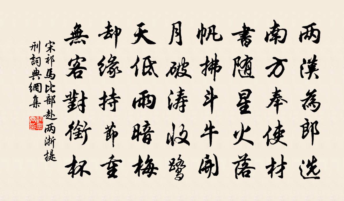 詩詞名句歷史字典書法欣賞書法字典國語詞典說文解字康熙字典古漢語字典標 題 作 者 詩 句 馬比部赴兩浙提刑作者:宋祁 朝代:宋代馬比部赴兩浙提刑原文兩漢為郎選,南方奉使材。書隨星火落,帆拂鬥牛開。月破濤收鷺,天低雨暗梅。卻緣持節重,無客對銜杯。詩詞問答問:馬比部赴兩浙提刑的作者是誰?答:宋祁問:馬比部赴兩浙提刑寫於哪個朝代?答:宋代問:宋祁的名句有哪些?答:宋祁名句大全宋祁馬比部赴兩浙提刑書法欣賞馬比部赴兩浙提刑書法作品詩詞推薦臨江仙(二之二)秦觀〔宋代〕髻子偎人嬌不整,眼兒失睡微重。尋思模樣早心忪。斷腸攜手,何事太匆匆。不忍殘紅猶在臂,翻疑夢裡相逢。遙松齋直指因喫粽與兄弟論鐵酸豏金剛圈栗棘蓬釋慧空〔宋代〕直指喫粽被粽賺,吐出多年鐵酸豏。俊鷹才見插天飛,餓狗床根爭咂啖。忽然變作蒲與圈,鷹也迷蹤狗也奔。百年水調歌頭(游武夷)覃懷高〔宋代〕翠蕤插雲表,初意隔仙凡。臨風據案一見,邂逅似開顏。幾欲拿舟九曲,便擬捫參絕頂,直下俯塵寰。聊此稅吾駕相里使君宅聽澄上人吹小管嚴維〔唐代〕秦僧吹竹閉秋城,早在梨園稱主情。今夕襄陽山太守,座中流淚聽商聲。寄題秀州槜李亭韓維〔宋代〕雲水浩無極,茲亭安在哉。傳名落人間,猶使塵抱開。昔為干戈地,今以游觀來。物變未始窮,千年一浮埃。何時和鬍子升大欠韻王柏〔宋代〕能踐其形亦甚難,天高地下我中間。讀書未造精微閫,處世應迷到欲關。勉勉工夫何假字。區區繪事豈真顏。須知寄鄧志宏五首鄧柞〔宋代〕厭從薄宦思蓮幕,思見故人映玉山。須信人生貴適志,相逢樽酒且開顏。嘆楊花韋應物〔唐代〕空濛不自定,況值暄風度。舊賞逐流年,新愁忽盈素。才縈下苑曲,稍滿東城路。人意有悲歡,時芳獨如故。過魏文貞公宅(一作題魏文貞)杜牧〔唐代〕蟪蛄寧與雪霜期,賢哲難教俗士知。可憐貞觀太平後,天且不留封德彝。圩田二首楊萬里〔宋代〕周遭圩岸繚金城,一眼圩田翠不分。行到秋苗初熟處,翠茸錦上織黃雲。次韻王倅大梵寺山亭夜雨張嵲〔宋代〕溪山含變態,可玩不可說。西嶺澹斜暉,前山明積雪。潭空游鱗出,景晏飛鳥絕。遠嶼上孤煙,平沙散疏樾。天涯贈四子二首陳造〔宋代〕交這眼亦班班,四子聲猷豈易攀。百里來羞長翁贐,片言仍解相公顏。事乖雅意疇忘嘆,我已南驅子北還。繼此開游大滌王溉〔宋代〕山合群峰路屈盤,溪行九折勢蜿蜒。雲根長伴仙人跡,元蓋潛通大滌天。玉殿香消人寂寂,石壇花落草芊芊。黃冠和李藍溪梅花韻黃庚〔宋代〕一枝寒玉倚橫塘,和雪攀來袖亦香。插向膽瓶籠紙帳,長教夢繞月黃昏。由開先萬杉棲賢羅漢入城南康守雲惜君未至紫晁補之〔宋代〕南康南麓江州北,五百伽籃似蜜脾。萬室千門俱面勢,不應獨是紫霄奇。陪鄭先輩華山羅谷訪張隱者李山甫〔唐代〕白雲閒洞口,飛蓋入嵐光。好鳥共人語,異花迎客香。谷風聞鼓吹,苔石見文章。不是陪仙侶,無因訪阮郎。秋興三首蘇軾〔宋代〕浴鳳池邊星斗光,宴余香滿上書囊。樓前夜月低韋曲,雲里車聲出未央。去國何年雙鬢雪,黃花重見一枝霜。傷心途中新歲憶三城兄長相公宋祁〔宋代〕馬上逢元朔,匆匆記物華,趁盤呈柏葉,偷筆弄椒花。臈暝殘晨炬,春暉上早霞。三城今日酒,知我獨思家。歌元豐五首王安石〔宋代〕豚柵雞塒晻靄間,暮林搖落獻南山。豐年處處人家好,隨意飄然得往還。安扶待制侍郎徐公輓詞二首葉適〔宋代〕飲冰那得不醒然,北看成南醜又妍。建策須為萬世慮,孤忠亦有一身全。星文忍向生前墜,夢事方從死日傳。莫指名句推薦金帶連環束戰袍,馬頭沖雪度臨洮。馬戴《出塞詞》 王母歡闌瓊宴罷,仙人淚滿金盤側。文天祥《滿江紅·代王夫人作》 白日何短短,百年苦易滿。李白《短歌行》 春風一夜吹鄉夢,又逐春風到洛城。武元衡《春興》 與死人同病者,不可生也;與亡國同事者,不可存也。韓非及後人《韓非子·孤憤》 落葉聚還散,寒鴉棲復驚。李白《三五七言 / 秋風詞》 流光容易把人拋,紅了櫻桃,綠了芭蕉。蔣捷《一剪梅·舟過吳江》 酒後競風采,三杯弄寶刀。李白《白馬篇》 孰知不向邊庭苦,縱死猶聞俠骨香。王維《少年行四首》 一年滴盡蓮花漏。碧井酴酥沈凍酒。毛滂《玉樓春·己卯歲元日》