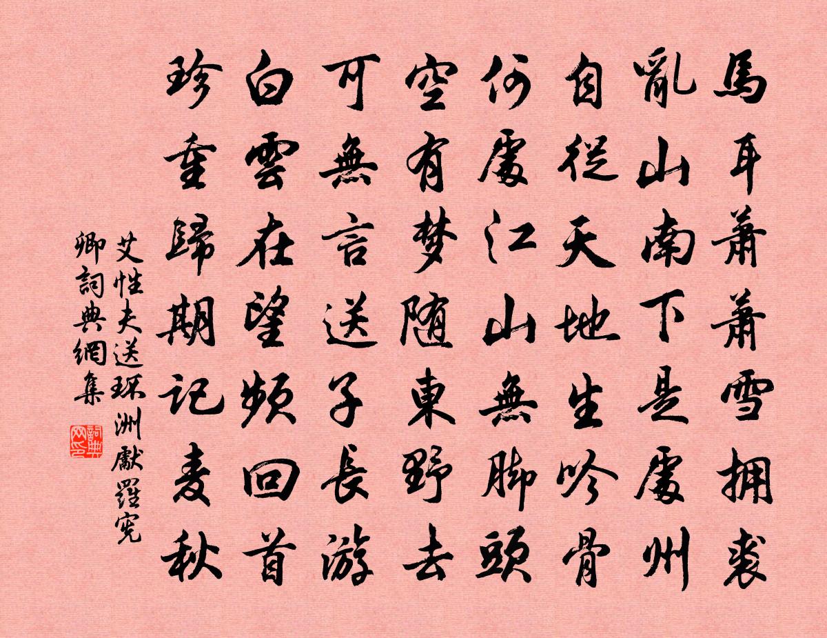 詩詞名句歷史字典書法欣賞書法字典國語詞典說文解字康熙字典古漢語字典標 題 作 者 詩 句 送環洲先羅憲卿作者:艾性夫 朝代:宋代送環洲先羅憲卿原文馬耳蕭蕭雪擁裘,亂山南下是處州。自從天地生吟骨,何處江山無腳頭。空有夢隨東野去,可無言送子長游。白雲在望頻回首,珍重歸期記麥秋。詩詞問答問:送環洲先羅憲卿的作者是誰?答:艾性夫問:送環洲先羅憲卿寫於哪個朝代?答:宋代問:送環洲先羅憲卿是什麼體裁?答:七律艾性夫送環洲先羅憲卿書法欣賞送環洲先羅憲卿書法作品詩詞推薦白日麗江皋(一作鮑溶詩)陳昌言〔唐代〕遲景臨遙水,晴空似不高。清明開曉鏡,昭晰辨秋毫。鬱郁長堤土,離離淺渚毛。煙銷占一候,風靜擁千艘。獨媚寄江子之晃沖之〔宋代〕平生江季子,疏嬾近忘吾。不啻三年別,如何一字無。燒丹岣嶁令,釀酒步兵廚。二者將安擇,功名莫浪圖。定風波 鄧帥漆水公壽筵遼東大使君在焉大有元好問〔金代〕白水青田萬頃秋。風煙平楚散羊牛。莫放相公黃閣去。留取。笑談尊俎也風流。華表仙人人不識。今夕。鹿車也到浣溪沙蘇軾〔宋代〕縹緲紅妝照淺溪。薄雲疏雨不成泥。送君何處古台西。廢沼夜來秋水滿,茂林深處晚鶯啼。行人腸斷草淒迷。橫浦十詠周程三先生書院劉黻〔宋代〕千載斯文冷,先生以道鳴。山川師友趣,日月弟兄情。門靜一松在,源深雙浦橫。兒童游里巷,猶喜說周程。落第東歸羅鄴〔唐代〕年年春色獨懷羞,強向東歸懶舉頭。莫道還家便容易,人間多少事堪愁。郎官湖春日四首李祁〔宋代〕空山玉蕊照瓊瑰,到處尋花共往回。欲識春風最奇處,試來同看雨中梅。瑞龍吟翁元龍〔宋代〕清明近。還是遞趲東風,做成花訊。芳時一刻千金,半晴半雨、酬春未準。雁歸盡。離字向人慾寫,暗雲難認。西呈楊溥子趙蕃〔宋代〕曉過子云居,霜風柳未疎。飄零五年別,斷絕一行書。安否勞苦外,詩編吟誦余。君寧老騏驥,我已愧春鉏。籠鷹詞張耒〔宋代〕八月獲黍霜野空,蒼鷹羽齊初出籠。劍翎鉤爪目如電,利吻新淬龍泉鋒。少年臂爾平郊去,草動人呼躍寒兔。竦身觀音泉張耒〔宋代〕岩松偃蓋不知年,寂寂秋燈寶供前。清徹一源傳萬古,空山長伴白衣仙。寄天台蕭練師高似孫〔宋代〕已是成仙了,全然得道長。石堅松結髓,山暖術生香。近瀑衣裳泠,和雲筆硯涼。傍崖修碧宇,何日奏寥陽。再游南華臨出門書記妙瑩獻絕句索留題賦兩篇曾豐〔宋代〕社裡得詩僧,錚錚可正平。子今能發願,吾亦許同盟。不轉虛空話,難歸雅頌聲。金篦容我刮,管取眼增明。送楊尚書祭西嶽姚合〔唐代〕報功嚴祀典,寵詔下明庭。酒氣飄林嶺,香菸入杳冥。樂清三奏備,詞直百神聽。衣拂雲霞濕,詩通水石靈。何因席君從於洛城種金橘今秋始結六實以其四獻開司馬光〔宋代〕物不須多且賞奇,禦寒想見結庵時。江南江北徒虛語,盡信前書是不宜。雉場歌溫庭筠〔唐代〕茭葉萋萋接煙曙,雞鳴埭上梨花露。彩仗鏘鏘已合圍,繡翎白頸遙相妒。雕尾扇張金縷高,碎鈴素拂驪駒豪。綠場和梁簽判潁州西湖十三題野翠堂蘇頌〔宋代〕郊原西與莽蒼連,隔岸人家小徑穿。滿目風光杳無際,柳如山色草如煙。寄郭筠仙浙江四首曾國藩〔清代〕一病多勞勤護措,嗟君此別太匆匆。二三知己天涯隔,強半光 * 路中。免走會須營窟穴,鴻飛原不計西東。讀書汴京紀事二十首 其九劉子翬〔宋代〕神霄宮殿五雲間,羽服黃冠綴曉班。詔許群臣親受籙,步虛聲裹認龍顏。次韻劉養源見寄二十韻高斯得〔宋代〕山寺傳好語,盈耳歡聲騰。側聞新天子,有意綏蒸蒸。金雞肆大眚,民散蒙哀矜。詔書日夜下,合沓來凌兢。訪落名句推薦提籠忘采葉,昨夜夢漁陽。張仲素《春閨思》 畫地為牢勢不入,削木為吏議不對班固《漢書·傳·司馬遷傳》 小人者其未得也,則憂不得;既已得之,又恐失之。是以有終身之憂,無一日之樂也。荀子《荀子·子道》 自奉必須儉約,宴客切勿流連。朱柏廬《朱子家訓·全文》 不負東籬約,攜尊過草堂。妙信《九日酬諸子》 日星隱曜,山嶽潛形;范仲淹《岳陽樓記》 思婦高樓上,當窗應未眠。徐陵《關山月》 零淚向誰道,雞鳴徒嘆息。沈約《夜夜曲》 又說今夕天津,西畔重歡遇。吳文英《荔枝香近·七夕》 當君懷歸日,是妾斷腸時。李白《春思》