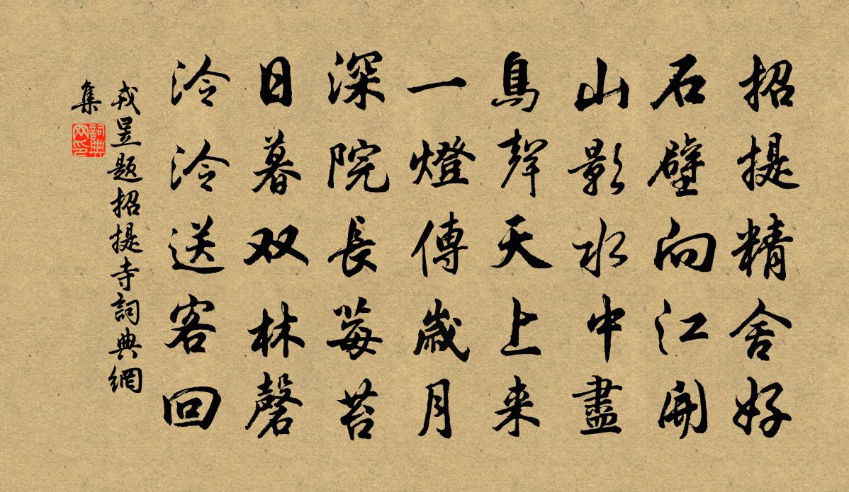 奔逝的大江邊,聳峙著一座山峰,峰頂上陡起一道石壁,這就是招提精舍。由於其地勢峻峭,作者一見便為之叫好。這是非常人所選擇的構造屋宇的地址,也是常人不輕易涉足的領域。接著,作者既寫山寺的獨特環境,又語帶禪機地寫僧人進入的禪境。山影既可在水中消盡,則一切幻象與妄念亦可消逝在水中;天上既可傳來烏聲,這絕頂之上則或許亦可聞見天國妙音。一盞孤燈伴僧人渡過漫漫歲月,而菩提般若之智也如燈火代代相傳。深院莓苔自然是外人久所不至而生成。目色已暮,這方外之地更覺清靜,磬聲泠泠,替寺僧送走來訪之客。這一片清靜、超脫,只屬於那些深入禪道的人。