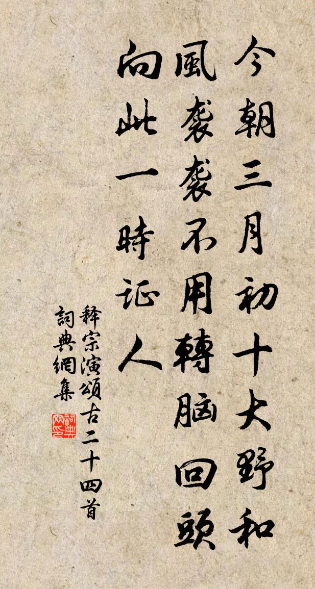 詩詞名句歷史字典書法欣賞書法字典國語詞典說文解字康熙字典古漢語字典標 題 作 者 詩 句 頌古二十四首作者:釋宗演 朝代:宋代頌古二十四首原文今朝三月初十,大野和風襲襲。不用轉腦回頭,向此一時證人。詩詞問答問:頌古二十四首的作者是誰?答:釋宗演問:頌古二十四首寫於哪個朝代?答:宋代釋宗演頌古二十四首書法欣賞頌古二十四首書法作品詩詞推薦物化劉克莊〔宋代〕今朝風物甚美,明日陰晴未知。夕陽無回照理,落花有上天時。天街秦韜玉〔唐代〕九衢風景盡爭新,獨占天門近紫宸。寶馬競隨朝暮客,香車爭碾古今塵。煙光正入南山色,氣勢遙連北闕春。莫見酬劉子至薛師石〔宋代〕寄來書一紙,別後喜安和。想見清高極,吟成秋思多。山頭靈運立,月下謫仙歌。共是江湖客,斜陽各曬蓑。彭澤道中二首王阮〔宋代〕世路日益險,道根終自深。因勞踏石足,倍起愛山心。地冷雪常在,歲窮天更陰。今宵投宿處,知度幾層林。題開元寺閣薛能〔唐代〕一閣見一郡,亂流仍亂山。未能終日住,尤愛暫時閒。唱棹吳門去,啼林杜宇還。高僧不可羨,西景掩禪關。次青溪後二章為別衛宗武〔宋代〕今古多紛攘,宇宙彌氛埃。故友晨星然,往往淪劫灰。幸得莫逆交,子輿從子來。道義本契合,心跡無疑猜。不徒漁父貫休〔唐代〕一葉一竿竹,眉須雪欲零。陸應無祖業,香必是伊腥。兒亦名魚鷓,歌稱我洞庭。回頭深自愧,舊業近滄溟。劉展下判官相招以詩答之崔峒〔唐代〕國有非常寵,家承異姓勛。背恩慚皎日,不義若浮雲。但使忠貞在,甘從玉石焚。竄身如有地,夢寐見明君。水口上舟呈同行傅月山萇五邁〔宋代〕泝流上嵩江,江闊流益峻。時方良月初,打關惡風信。老翁把柂立,首叫尾必應。大男前運稿,風激水還噴。小男三閣曲趙汝鐩〔宋代〕叔寶沉迷建鄴宮,厭厭夜飲清晝同。金碧三閣插晴漢,沉檀十里聞香風。疊石為山水為沼,後庭萬花坼春叢。狎客上元日夢王母獻白玉環丁澤〔唐代〕夢中朝上日,闕下拜天顏。仿佛瞻王母,分明獻玉環。靈姿趨甲帳,悟道契玄關。似見霜姿白,如看月彩彎。霓裳登祥雲庵謁東林明首座釋正覺〔宋代〕伐木清喔癖在腸,握筇蒼磴履重霜。玲瓏墮壑乳泉響,蕭瑟到門松吹香。高寒夜雨凍一色,虛淨曉雲流五光。社散歲暮絕句四首晁說之〔宋代〕下惠一時行己志,首陽萬古振人倫。終南不得西山號,歲暮白頭空斷魂。頌四賓主釋印肅〔宋代〕六道四生同一輪,見他生滅未為真。直須打破獼猴鏡,識取光中弄影人。記顏六言三首劉克莊〔宋代〕無空函達元子,有報書絕山公。非牛溪負苓者,即鹿門採藥翁。餞李秀才赴舉劉希夷〔唐代〕鴻鵠振羽翮,翻飛入帝鄉。朝鳴集銀樹,暝宿下金塘。日月天門近,風煙夜路長。自憐窮浦雁,歲歲不隨陽。婦子看日釋了惠〔宋代〕劣女還閨闔,痴爺看日頭。幾生親骨肉,不共戴天讎。八月八日發潭州後得絕句四十首趙蕃〔宋代〕扁舟往作櫧州過,煙霧空濛只市聲。今夕再來還小泊,卻逢江月正空明。寄題隱靜三首吳芾〔宋代〕向來連歲守江城,到處題詩滿戶庭。獨欠茲山一轉語,倩師與我謝山靈。擬青青陵上柏詩鮑照〔南北朝〕涓涓亂江泉。綿綿橫海煙。浮生旅昭世。空事嘆華年。書翰幸閒暇。我酌子縈弦。飛鑣出荊路。騖服指秦川。渭濱名句推薦月到東南秋正半。雙闕中間,浩蕩流銀漢。王國維《蝶戀花·月到東南秋正半》 遠路應悲春晼晚,殘霄猶得夢依稀。李商隱《春雨》 還怕掩、深院梨花,又作故人清淚。吳文英《無悶·催雪》 中年親友難別,絲竹緩離愁。蘇軾《水調歌頭·安石在東海》 誰向孤舟憐逐客?白雲相送大江西。李攀龍《送明卿之江西》 五月天山雪,無花只有寒。李白《塞下曲六首·其一》 子規啼,不如歸,道是春歸人未歸。關漢卿《大德歌·春》 人無剛骨,安身不牢。施耐庵《水滸傳·第二十四回》 布衣菜飯,可樂終身,不必作遠遊計也。沈復《浮生六記·閨房記樂》 一溪煙柳萬絲垂,無因系得蘭舟住。周紫芝《踏莎行·情似遊絲》