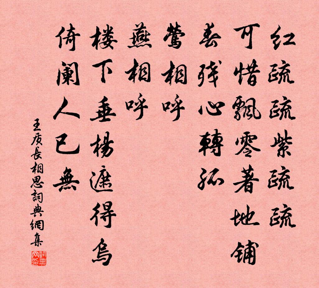 詩詞名句歷史字典書法欣賞書法字典國語詞典說文解字康熙字典古漢語字典標 題 作 者 詩 句 長相思作者:王質 朝代:宋代長相思原文紅疏疏,紫疏疏。可惜飄零著地鋪。春殘心轉孤。鶯相呼。燕相呼。樓下垂楊遮得烏。倚闌人已無。詩詞問答問:長相思的作者是誰?答:王質問:長相思寫於哪個朝代?答:宋代問:長相思是什麼體裁?答:詞王質長相思書法欣賞長相思書法作品詩詞推薦竹枝歌七首楊萬里〔宋代〕岸旁燎火莫闌殘,須念兒郎手腳寒。更把綠荷包熱飯,前頭不怕上高灘。轉調踏莎行(上巳道中作)陳亮〔宋代〕洛浦塵生,巫山夢斷。旗亭菸草里,春深淺。梨花落盡,荼又綻。天氣也似,尋常庭院。向晚情懷,十分惱亂。水秋月二首孔文仲〔宋代〕秋夜不可晨,悲歌聊自永。頫聽一掀簾,星河光炯炯。霜浮萬瓦寂,月滿四山靜。壯心隨北內,吹入單于境。醉落魄晏幾道〔宋代〕休休莫莫,離多還是因緣惡。有情無奈思量著,月夜佳期,近寫青樓約。心心口口長恨昨,分飛容易當時錯。後期遣興四首廖行之〔宋代〕窮達渠非命,機關不到心。新詩聊自遣,高興若為禁。於潛僧綠筠軒蘇軾〔宋代〕可使食無肉,不可居無竹。無肉令人瘦,無竹令人俗。人瘦尚可肥,士俗不可醫。旁人笑此言,似高還似痴。若對送朱大游塞(一作送朱大北游)張南史〔唐代〕歲暮一為別,江湖聊自寬。且無人事處,誰謂客行難。郢曲憐公子,吳州憶伯鸞。蒼蒼遠山際,松柏獨宜寒。慶東宮生辰四首周必大〔宋代〕崔豹稱明君,如月有規輪。戴暠論副德,桂滿自長春。況乃秋夜永,萬里無纖塵。願歌重輪句,照耀率土濱。桃源憶故人·玉樓深鎖秦觀〔宋代〕玉樓深鎖薄情種,清夜悠悠誰共。羞見枕衾鴛鳳,悶即和衣擁。無端畫角嚴城動,驚破一番新夢。窗外月華霜重,同子文、材翁、子直、蕭巨、濟中元夜東園望楊萬里〔宋代〕月到東園分外光,行行坐坐間傳觴。生愁蹈碎千花影,回顧千花總不妨。尋西山隱者不遇 / 山行尋隱者不遇丘為〔唐代〕絕頂一茅茨,直上三十里。扣關無僮僕,窺室唯案幾。若非巾柴車,應是釣秋水。差池不相見,黽勉空仰止。草色落星寺洪咨夔〔宋代〕春秋隕石於宋五,分作金焦與星渚。大圓鏡裹八窗開,面面魚龍聽人語。瀑長一線吹不動,山擁萬綺明可數。嗟哉雨中過東村陸游〔宋代〕小雨空濛物象奇,偶扶藤杖過東陂。墊巾風度人爭看,蠟屐年光我自悲。窮鬼有靈揮不去,死魔多力到無期。歸來正月晦日,自英州舍舟出陸,北風大作楊萬里〔宋代〕北風吹得山石裂,北風凍得人骨折。南來何曾識此寒,便恐明朝丈深雪。今朝幸不就船行,白浪打船君更驚。只是晁升道將還盱江先以二詩見意王洋〔宋代〕只說歸期為底忙,春風九奏奉花王。芳菲莫管前驅盡,末後殷勤最久長。齊雩祭歌 青帝 三謝朓〔南北朝〕奠春酒。秉青珪。命田祖。渥羣黎。留別賈閣老胡寅〔宋代〕熙朝侍從老堂堂,和氣如春與物昌。未見峨冠真楚越,思逢傾蓋在瀟湘。放懷繾綣情何厚,憂世艱難話更長。果有題趙君畫竹馬廷鸞〔宋代〕霜竿操尚特幽奇,直節端如正士姿。高拂九霄無曲處,古來惟有老天知。偈頌六十首釋曇華〔宋代〕苦苦,苦中苦,樂中苦,誰道黃金如糞土。象骨老師曾輥球,秘魔扠下捉老鼠。送李奉議亳州判官四首陳師道〔宋代〕吾友孫子實,愛學吾所畏。持身如處子,得句有餘味。交歡艱難際,凜然見名誼。吾病臥里中,車馬日一至。遣醫名句推薦近水知魚性,近山識鳥音。佚名《增廣賢文·上集》 香非在蕊,香非在萼,骨中香徹。晁補之《鹽角兒·亳社觀梅》 一年好景君須記,最是橙黃橘綠時。蘇軾《贈劉景文 / 冬景》 理貴有中,不必過厚李大師、李延壽《南史·列傳·卷十八》 生怕見花開花落,朝來塞雁先還。辛棄疾《漢宮春·立春日》 清明過了,不堪回首,雲鎖朱樓。朱淑真《眼兒媚·風日遲遲弄輕柔》 感之欲嘆息,對酒還自傾。李白《春日醉起言志》 桃李務青春,誰能貫白日。李白《長歌行》 能者勞而俯怨,何如拙者逸而全真。洪應明《菜根譚·概論》 言則稱於湯文,行則譬於狗豨。墨子《墨子·46章 耕柱》