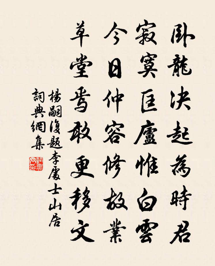 詩詞名句歷史字典書法欣賞書法字典國語詞典說文解字康熙字典古漢語字典標 題 作 者 詩 句 題李處士山居作者:楊嗣復 朝代:唐代題李處士山居原文臥龍決起為時君,寂寞匡廬惟白雲。今日仲容修故業,草堂焉敢更移文。詩詞問答問:題李處士山居的作者是誰?答:楊嗣復問:題李處士山居寫於哪個朝代?答:唐代問:題李處士山居是什麼體裁?答:七絕楊嗣復題李處士山居書法欣賞題李處士山居書法作品注釋全唐詩:卷464-22詩詞推薦從駕幸晉陽詩薛道衡〔隋代〕省方遵往冊。游豫葉前經。金吾朝戒道。校尉晚巡營。重巒下飛騎。絕浦渡連旌。澗水寒逾咽。松風遠更清。方觀賀新郎(次劉後村)趙以夫〔宋代〕葵扇秋來賤。阿誰知、初回輕暑,又教題遍。不是琵琶知音少,無限如簧巧囀。倩說似、長門休怨。莫把蛾眉與人別鄭仁表張蠙〔唐代〕春雷醉別鏡湖邊,官顯才狂正少年。紅燭滿汀歌舞散,美人迎上木蘭船。句釋曉瑩〔宋代〕殷勤供一笑。題著禪師杜荀鶴〔唐代〕大道本無幻,常情自有魔。人皆迷著此,師獨悟如何?為岳開窗闊,因蟲長草多。說空空說得,空得到維摩。仁化錦石岩余靖〔宋代〕巉岩絢爛倚雲隈,萬玉無香結作堆。不是虬龍眠鐵樹,原來假石作根荄。偈六十三首釋道寧〔宋代〕門外春將暮,園林華木殘。靈雲訊息在,遊子莫{滿氵換頁}頇。雲舒四野,雨瀉長空。花落花開,春來春去。往天街曉望胡宿〔唐代〕長樂才聞一叩鐘,百官初謁未央宮。金波穆穆沙堤月,玉樹上苑風。香重椒蘭橫結霧,氣寒龍虎遠浮空。嗟余索米次韻酬徐仲車見寄秦觀〔宋代〕渭清非勝涇,蘭芳本無慕。我生季葉中,乃與古人遇。職當供灑掃,匏繫愧遲暮。來章感存沒,三讀淚如注。圬者王承福傳韓愈〔唐代〕圬之為技賤且勞者也。有業之,其色若自得者。聽其言,約而盡。問之,王其姓。承福其名。世為京兆長安農夫。題時遁澤畫卷十首王柏〔宋代〕虎嘯風生壑,龍藏氣吐雲。草廬勿高臥,天地正絪緼。旅食陸游〔宋代〕霜余漢水淺,野迥朔風寒。炊黍香浮甑,烹蔬綠映盤。心安失粗糲,味美出艱難。惟恨虛捐日,無書得縱觀。馮深居宰會稽釋文珦〔宋代〕詔辟稽山懸,清風在一琴。那知致君術,不是字民心。官舍桐陰合。圜扉草色深。退衙人吏散,應共野僧吟。田家三詠葉紹翁〔宋代〕抱兒更送田頭飯,畫鬢濃調灶額煙。爭信春風紅袖女,綠楊庭院正鞦韆。聶粹寫真求贊周必大〔宋代〕三年監州再攝州,家置繪像爭借留。便當紫綬朝冕旒,念我青笠操漁舟。攜此鼠目而麞頭,歸來高閣包春秋。他年金盞子王沂孫〔宋代〕雨葉吟蟬,露草流螢,歲華將晚。對靜夜無眠,稀星散、時度絳河清淺。甚處畫角淒涼,引輕寒催燕。西樓外,斜望三山放翁居蘇泂〔宋代〕晚進違前輩,湮才重此州。絕知他日少,預作百年憂。樵牧非身致,聰明不我謀。莫令司馬藁,祗候茂陵求。寄題喻叔奇國傅郎中園亭二十六詠清淺池楊萬里〔宋代〕橫枝直下是清池,花映清池水映枝。知是君描和靖句,不知和靖寄君詩。晝睡王令〔宋代〕太古一去浩萬世,百智競起紛修治。交將砭刀潰瘡痏,縱得平好無完皮。傾山竭河論曲水,都投大海為酒池。中間再次韻呈章守陳造〔宋代〕吾儒交賀得宗師,片善盱衡置百非。小駐鋒車宣室召,時觀譚麈頖宮揮。詩壇已許公餘論,鄰燭何曾靳寸輝。此意名句推薦記得武陵相見日,六年往事堪驚周紫芝《臨江仙·送光州曾使君》 教化之行,興於學校。脫脫《金史·列傳·卷三十七》 萬里無人收白骨,家家城下招魂葬。張籍《征婦怨》 非我而當者,吾師也;是我而當者,吾友也;諂諛我者,吾賊也。荀子《荀子·修身》 冰肌玉骨,自清涼無汗。蘇軾《洞仙歌·冰肌玉骨》 上馬擊狂胡,下馬草軍書。陸游《觀大散關圖有感》 仁不異遠,義不辭難班固《漢書·紀·武帝紀》 亂山殘雪夜,孤燭異鄉人。崔塗《除夜 / 巴山道中除夜書懷 / 除夜有懷》 名不徒生,而譽不自長。功成名遂。墨子《墨子·02章 修身》 恰如燈下,故人萬里,歸來對影。黃庭堅《品令·茶詞》