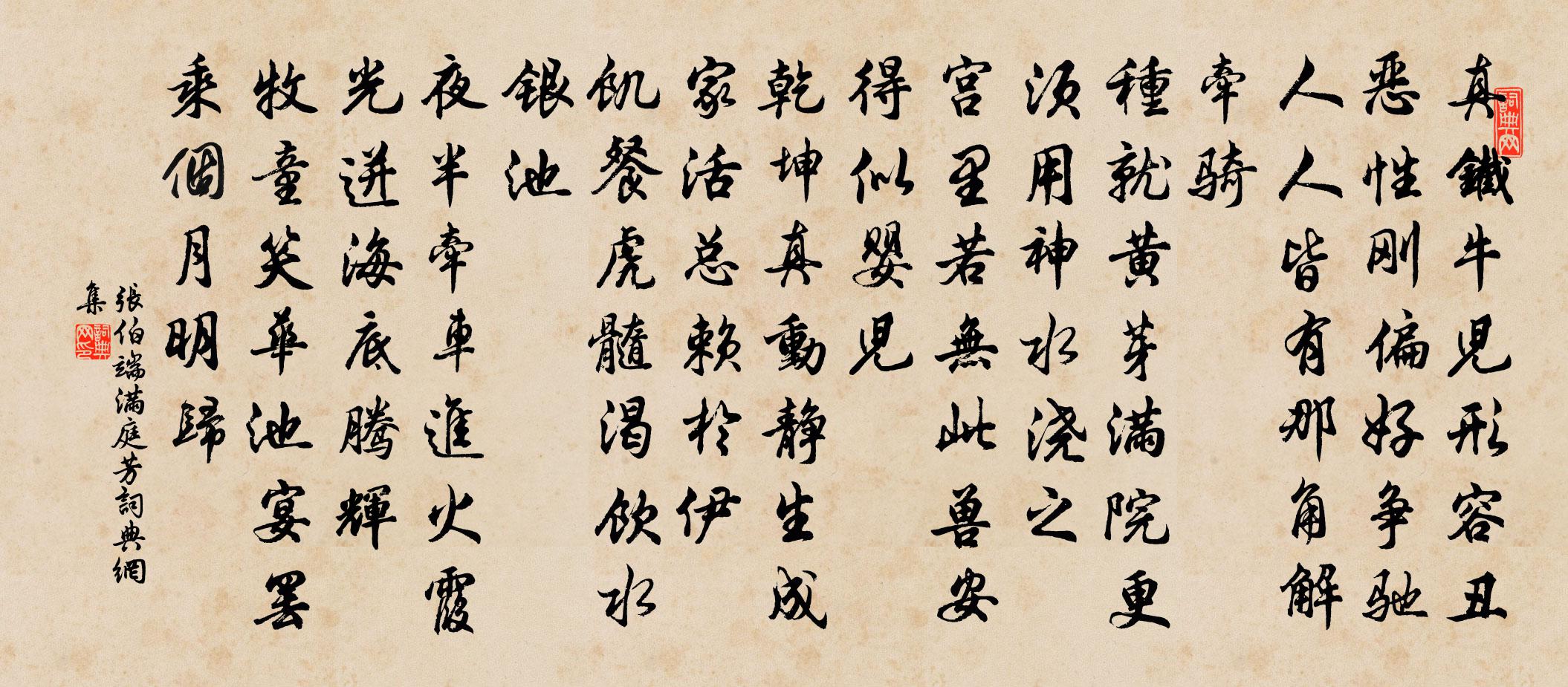 詩詞名句歷史字典書法欣賞書法字典國語詞典說文解字康熙字典古漢語字典標 題 作 者 詩 句 滿庭芳作者:張伯端 朝代:宋代滿庭芳原文真鐵牛兒,形容醜惡,性剛偏好爭馳。人人皆有,那角解牽騎。種就黃芽滿院,更須用、神水澆之。宮裡,若無此獸,安得似嬰兒。乾坤真動靜,生成家活,總賴於伊。飢餐虎髓,渴飲水銀池。夜半牽車進火,霞光迸、海底騰輝。牧童笑,華池宴罷,乘個月明歸。詩詞問答問:滿庭芳的作者是誰?答:張伯端問:滿庭芳寫於哪個朝代?答:宋代問:滿庭芳是什麼體裁?答:詞張伯端滿庭芳書法欣賞滿庭芳書法作品詩詞推薦小園何應龍〔宋代〕地占方方十丈寬,已栽花木四時看。客來莫笑生涯薄,窗外新添竹數竿。春日思歸李頻〔唐代〕春情不斷若連環,一夕思歸鬢欲斑。壯志未酬三尺劍,故鄉空隔萬重山。音書斷絕干戈後,親友相逢夢寐間。卻羨喜定太學生題三賢堂詹琰夫〔宋代〕和靖東坡白樂天,幾年秋菊薦寒泉。如今往事都休問,且為官司趁酒錢。挽司直兄王柏〔宋代〕晚始親荊玉,劬愉氣誼稠。泰壇霜月下,暑枕夜江頭。一困關公念,連書釋我憂。平生知己淚,寂寞灑新楸。蕪湖即事三首李流謙〔宋代〕社風連日舟行遲,社公有馬誰能騎。不妨酌我盎中綠,依舊離騷醉讀時。題陸賈大夫廟梁竑〔宋代〕劉郎辛苦逐秦鹿,尚欲長鞭及馬腹。蠻夷大長夢不驚,海邊椎髻乘黃屋。江淮貔貅始閒暇,忍使驅令渡篁竹。陸生贈鄭戶部陳師道〔宋代〕千載歸來遼海東,江山如舊里閭空。時平未覺身難遇,學贍依然說不窮。著繡晝行真細事,一車磬折得深衷。聖朝陳秘撰輓詞樓鑰〔宋代〕跬步不忘孝,掇皮皆是真。移忠思致主,務實見臨民。三諫言猶炳,平生跡遽陳。清風凜衰俗,自足盪秋旻。橫山堂孫覿〔宋代〕蒼雲十畝蔭平寬,露葉風枝繞舍寒。莫遣先生賦歸去,且令小吏報平安。諸公送行分韻得驅字李彌遜〔宋代〕儒生書自信一書束書,持以游世觸事迂。十步倒行一步立,公家不辨私家臞。壯無早計老更拙,宜去不去飢所驅。偈釋義懷〔宋代〕須彌頂上,不扣金鐘。畢缽岩中,無人聚會。山僧倒騎佛殿,諸人反著草鞋。朝游檀特,暮到羅浮。拄杖針筒,自和林處士梅詩八首劉學箕〔宋代〕梅花濕露未全乾,青女橫陳故作難。卯醉醉如申醉醉,晚寒寒似曉寒寒。園林雪後清孤甚,京洛塵中子細看。自是虞美人(無題)趙善括〔宋代〕長空一夜霜風吼。寒色消殘酒。問伊今夜在誰行。遺恨落花流水、誤劉郎。尤雲殢雨多情話。分付阿誰也。儂家有負謫後登乾越亭作劉長卿〔唐代〕天南愁望絕,亭上柳條新。落日獨歸鳥,孤舟何處人。生涯投越徼,世業陷胡塵。杳杳鍾陵暮,悠悠鄱水春。秦台魚山神女祠歌。迎神王維〔唐代〕坎坎擊鼓,魚山之下。吹洞簫,望極浦。女巫進,紛屢舞。陳瑤席,湛清酤。風淒淒兮夜雨,不知神之來兮不來,水龍吟(次陳君衡見寄韻)周密〔宋代〕燕翎誰寄愁箋,天涯望極王孫草。新煙換柳,光風浮蕙,餘寒尚峭。倚仗看雲,翦燈聽雨,幾番詩酒。嘆長安倦客蓼花董嗣杲〔宋代〕瘦葉浮根傍柳磯,水天秋色夕陽時。晶晶紅染累垂糝,裊裊涼搖軟弱枝。挼汗自能為酒母,託名誰製作風宜。花開果山春郊即事七首吳泳〔宋代〕宮事無窮類海潮,寸腸忍使自煎炮。橐駝種樹安心法,且並閒功子細抄。讀論語陸游〔宋代〕壯歲貪求未見書,歸常充棟出連車。晚窺闕里親傳妙,數簡方知已有餘。再次韻贈張德恭陳造〔宋代〕辭鋒森列看分朋,退作窮山苦行僧。每讀嚴詩驚我倒,亦知舜績待公凝。絲綸指日從天下,閶闔摩霄接武升。更想名句推薦三日柴門擁不開,階平庭滿白皚皚。柳宗元《酬王二十舍人雪中見寄》 行吟坐嘯獨悲秋,海霧江雲引暮愁。陳子龍《秋日雜感(十首選一)》 甘受人欺,定非懦弱;自謂予智,終是糊塗。王永彬《圍爐夜話·第一二五則》 道狹草木長,夕露沾我衣。陶淵明《歸園田居·其三》 細看不是雪無香,天風吹得香零落。王旭《踏莎行·雪中看梅花》 樹荊棘得刺,樹桃李得蔭馮夢龍《警世通言·卷十八》 耐寒唯有東籬菊,金粟初開曉更清。白居易《詠菊》 迴廊遠砌生秋草,夢魂千里青門道。馮延巳《菩薩蠻·迴廊遠砌生秋草》 一年三百六十日,多是橫戈馬上行。戚繼光《馬上作》 愁凝處,渺渺殘照紅斂吳文英《宴清都·秋感》