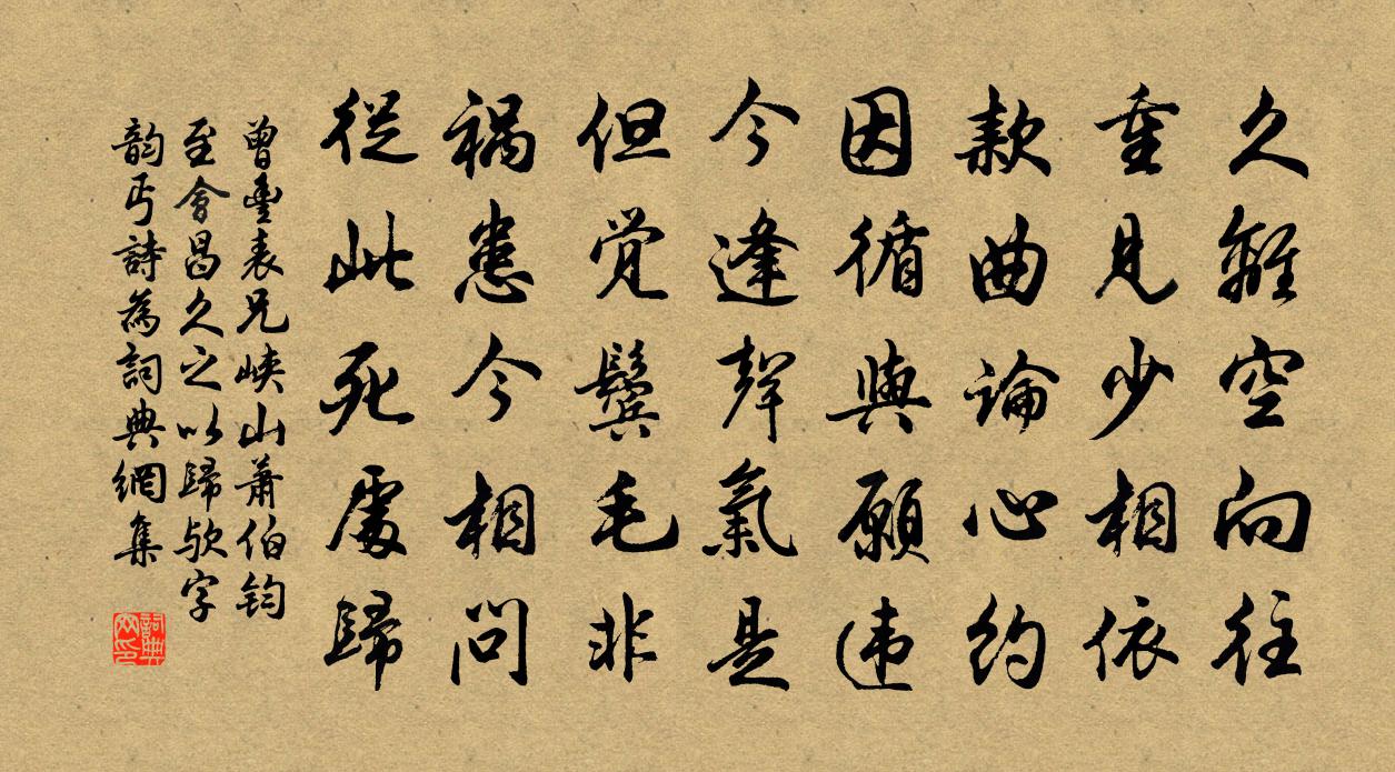 詩詞名句歷史字典書法欣賞書法字典國語詞典說文解字康熙字典古漢語字典標 題 作 者 詩 句 表兄峽山蕭伯鈞至會昌久之以歸歟字韻丐詩為作者:曾豐 朝代:宋代原文久離空嚮往,重見少相依。款曲論心約,因循與願違。今逢聲氣是,但覺鬢毛非。禍患今相問,從此死處歸。詩詞問答問:《表兄峽山蕭伯鈞至會昌久之以歸歟字韻丐詩為》的作者是誰?答:曾豐問:該詩寫於哪個朝代?答:宋代書法欣賞表兄峽山蕭伯鈞至會昌久之以歸歟字韻丐詩為書法作品詩文賞析【原題】:表兄峽山蕭伯鈞至會昌久之以歸歟字韻丐詩為別二首詩詞推薦答崔法曹賦四雪戴叔倫〔唐代〕楚僧躡雪來招隱,先訪高人積雪中。已別剡溪逢雪去,雪山修道與師同。游洞霄宮秘仲威〔宋代〕洞霄之名天下聞,洞霄之職宰輔分。聞名姓往未識面,寄祿於此徒紛紛。身到仙關不如我,九虎迎門開□鎖。六洞次韻李粹伯登鎮江粹廳覽亭曾協〔宋代〕酒余共逍遙,散步升高岡。萬物困霜雪,歲晏俱老蒼。江山一臨眺,志欲凌八荒。青霞儻見分,誰能束冠裳。送劉裴度〔唐代〕不歸丹掖去,銅竹漫云云。惟喜因過我,須知未賀君。享太廟樂章。舒和佚名〔唐代〕聖敬通神光七廟,靈心薦祚和萬方。嚴禋克配鴻基遠,明德惟馨鳳歷昌。紫微方翥〔宋代〕學得天文夜睡遲,雲籠月照恨星稀。而今病眼都無力,猶向檐邊認紫微。戰城南曹勛〔宋代〕相騎方侵掠,臨淮厲虎兵。三麾俱至地,一戰破思明。令下秋霜肅,威行草木驚。豈但全孤壘,能令復舊京。吾君棕櫚花董嗣杲〔宋代〕碧玉輪張萬葉陰,一皮一節筍抽金。胚成黃穗如魚子,朵作珠花出樹心。蜜漬可馳千里遠,種收不待早春深。蜀人太子李舍人城東別業(李祭酒別業俯視川林前帶雷岫)錢起〔唐代〕南山轉群木,昏曉擁山翠。小澤近龍居,清蒼常雨氣。君家北原上,千金買勝事。丹闕退朝回,白雲迎賞至。新晴次令衿游玉壺高詠十絕風雷大作席羲叟〔宋代〕坐聽風雷起空谷,俄看四面野雲生。道人不作英雄氣,可笑當年失箸驚。夏日登易氏萬卷樓用唐王陽明〔明代〕高樓六月自生寒,沓嶂峰迴擁碧闌。久客已忘非故土,此身兼喜是閒官。幽花傍晚煙初暝,深樹新晴雨未乾。極目仲春有懷張栻〔宋代〕想見城南春水深,春來夜夜動歸心。隔牆季子應無恙,為托飛鴻寄好音。別曼叔韓維〔宋代〕歲晏多感慨,況復餞之子。騰裝指近邑,弭蓋眷同里。日薄古原樹,天寒石橋水。毋為少別念,春風候車軌。值侯修學趣儒人稍急因遺蓮花蓮實西瓜於吾宗曾豐〔宋代〕絳玉裁花碧一莖,亭亭香遠韻逾清。群仙競倚西風笑,為報臨淮政已成。峽口送友人司空曙〔唐代〕峽口花飛欲盡春,天涯去住淚沾巾。來時萬里同為客,今日翻成送故人。鷓鴣天(次韻史少弼致政賦李參政壁西園海棠)魏了翁〔宋代〕日日春風滿範圍。海棠又發去年枝。月籠火樹更深後,露滴燕支曉起時。看不足,醉為期。宵征寧問角巾敧。一春君馬黃張舜民〔宋代〕君馬良,乘乘黃。仆臣御,守法度。乍可三驅失前禽,不可一朝為詭遇。假使四牡,項領無害。六轡如組,周旋中三月三日勤政樓侍宴應制王維〔唐代〕彩仗連宵合,瓊樓拂曙通。年光三月里,宮殿百花中。不數秦王日,誰將洛水同。酒筵嫌落絮,舞袖怯春風。天保溪上陸游〔宋代〕偶就澄溪照幅巾,蘭亭遺韻想清真。功名不入山林夢,詩酒猶關老病身。萬事只增思魯嘆,百年常媿避秦人。超然西江月(真覺賞瑞香二首)蘇軾〔宋代〕公子眼花亂髮,老夫鼻觀先通。領巾飄下瑞香風。驚起謫仙春夢。后土祠中玉蕊,蓬萊殿後鞓紅。此花清絕更纖穠名句推薦小舟橫截春江,臥看翠壁紅樓起。蘇軾《水龍吟·閭丘大夫孝終公顯嘗守黃州》 春秋多佳日,登高賦新詩。陶淵明《移居二首》 能令暫開霽,過是吾無求。韓愈《洞庭湖阻風贈張十一署·時自陽山徙掾江陵》 君看六幅南朝事,老木寒雲滿故城。韋莊《金陵圖》 君子尊德性,而道問學,致廣大,而盡精微,極高明,而道中庸。溫故,而知新,敦厚以崇禮。子思《中庸·第二十七章》 庭院深深深幾許,楊柳堆煙,簾幕無重數。歐陽修《蝶戀花·庭院深深深幾許》 桃李務青春,誰能貫白日。李白《長歌行》 清水出芙蓉,天然去雕飾。李白《經亂離後天恩流夜郎憶舊遊書懷贈江夏韋太守良宰》 余亦赴京國,何當獻凱還。孟浩然《送陳七赴西軍》 雲淡風輕近午天,傍花隨柳過前川。程顥《春日偶成·雲淡風輕近午天》